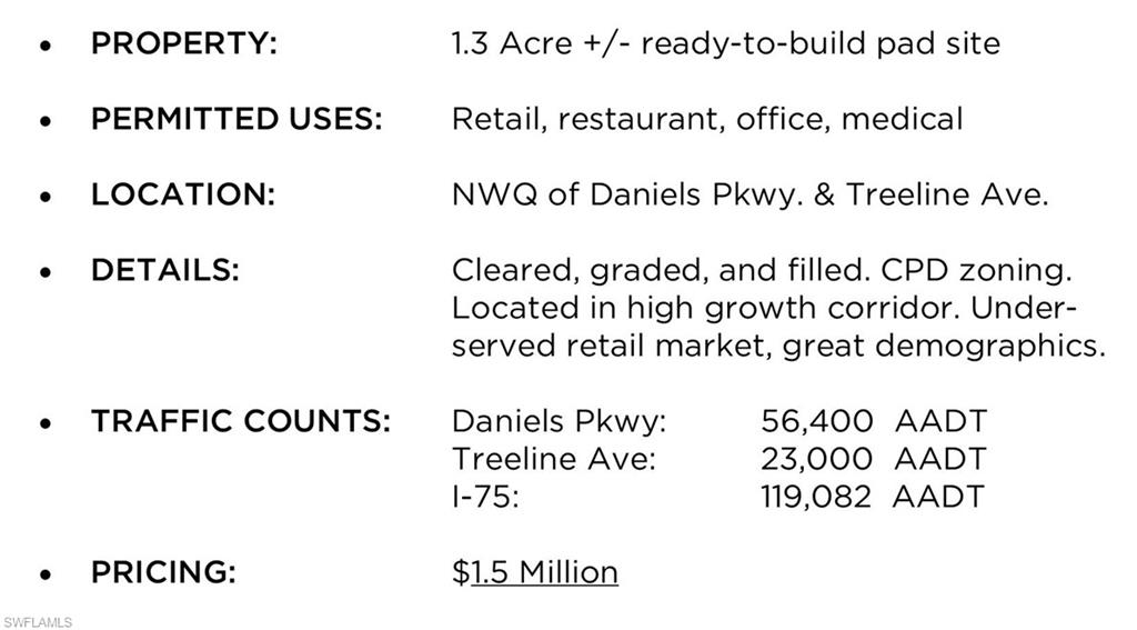1. 3 acre +/- ready-to-build pad site at Daniels and Treeline in Fort Myers, FL. Cleared, graded, and filled. CPD zoning. Located in high growth corridor. Underserved retail market - great demographics. Ideal users: retail, office, medical, or restaurant.