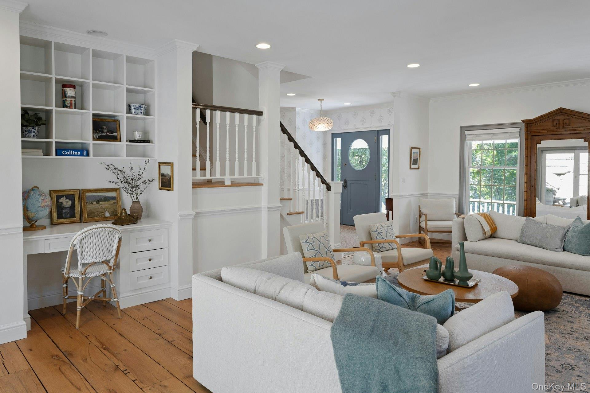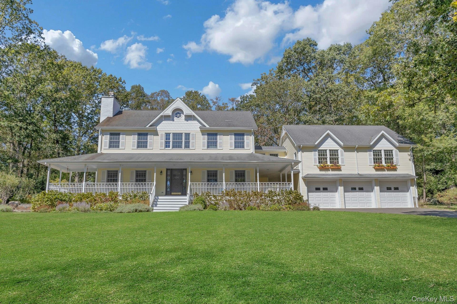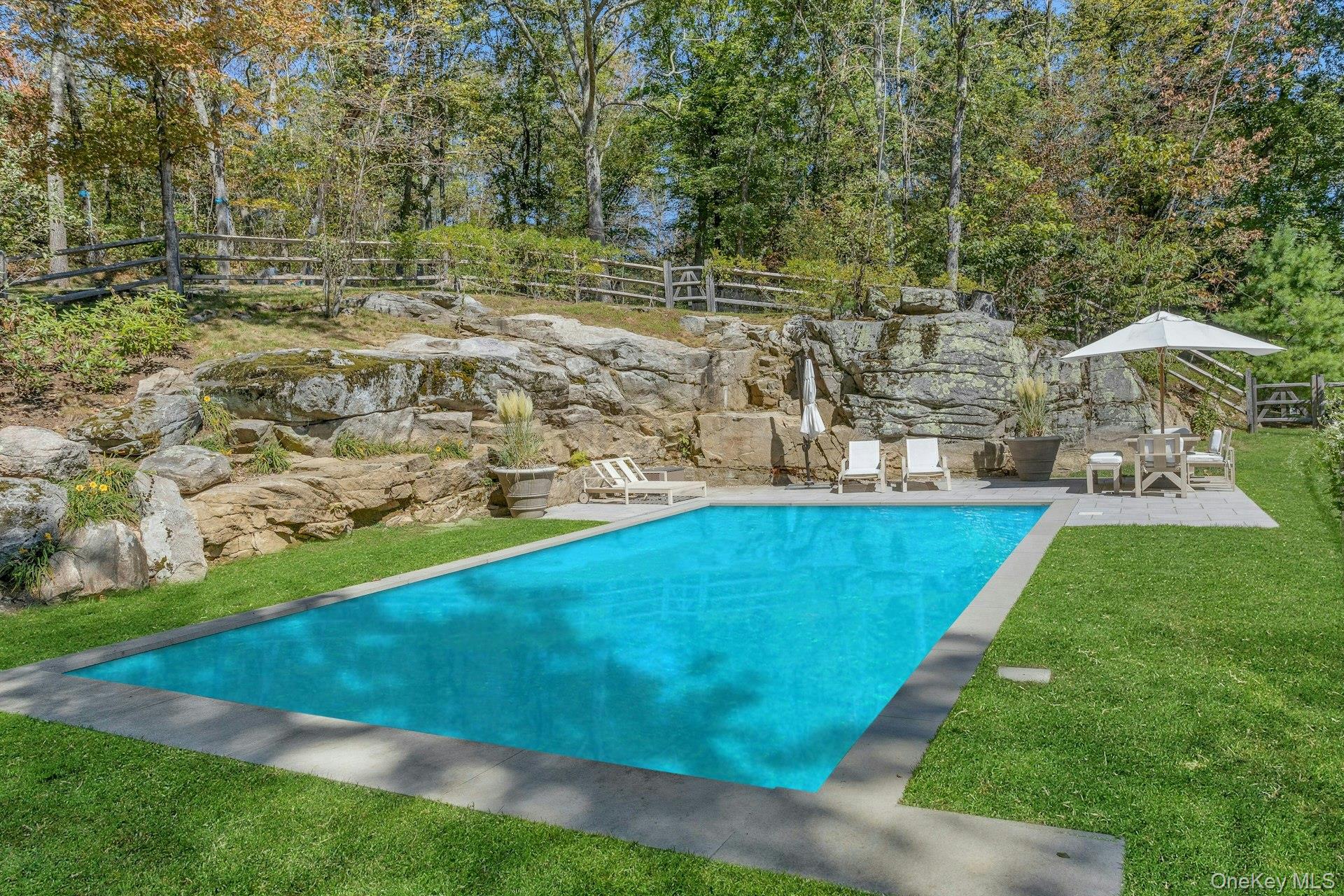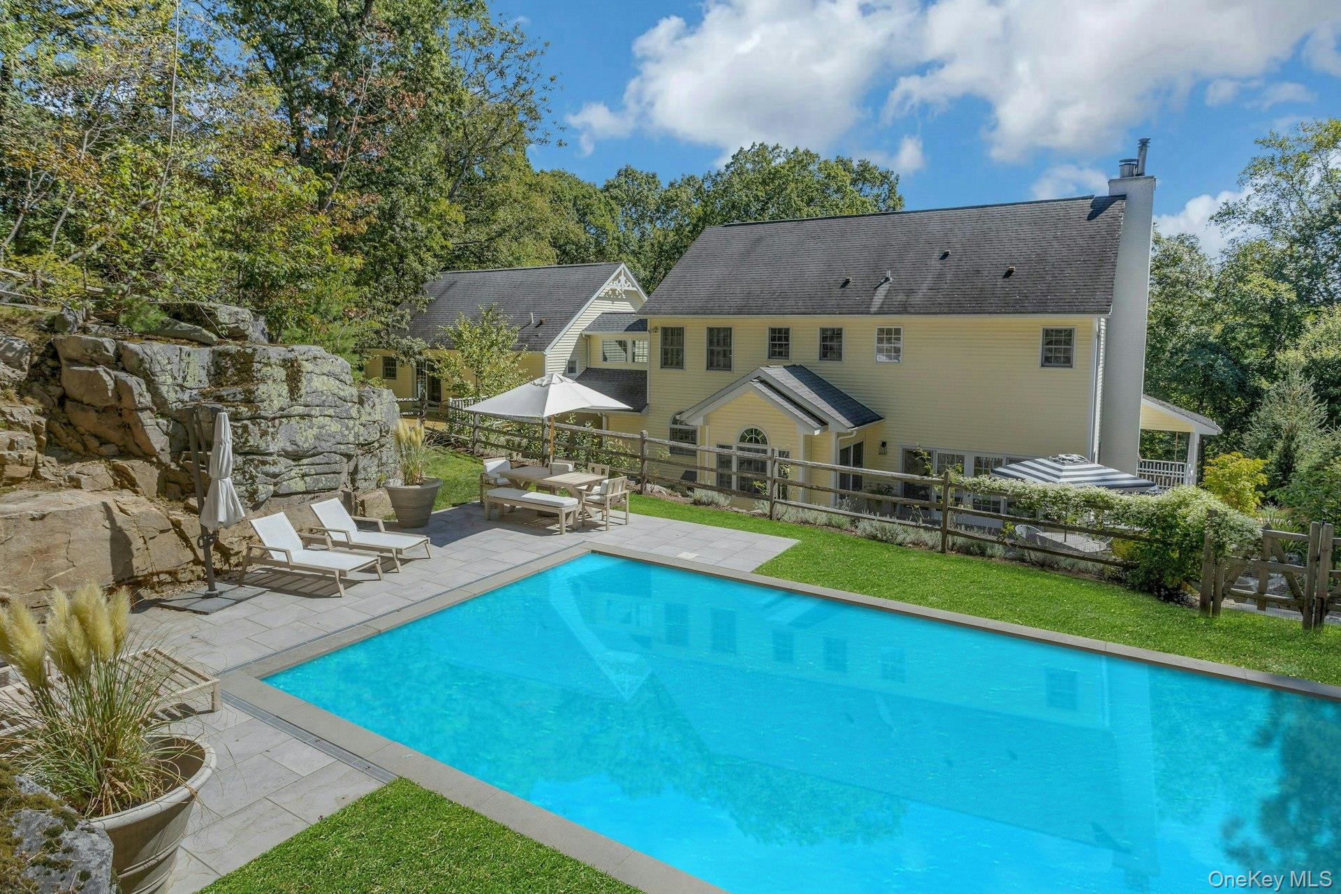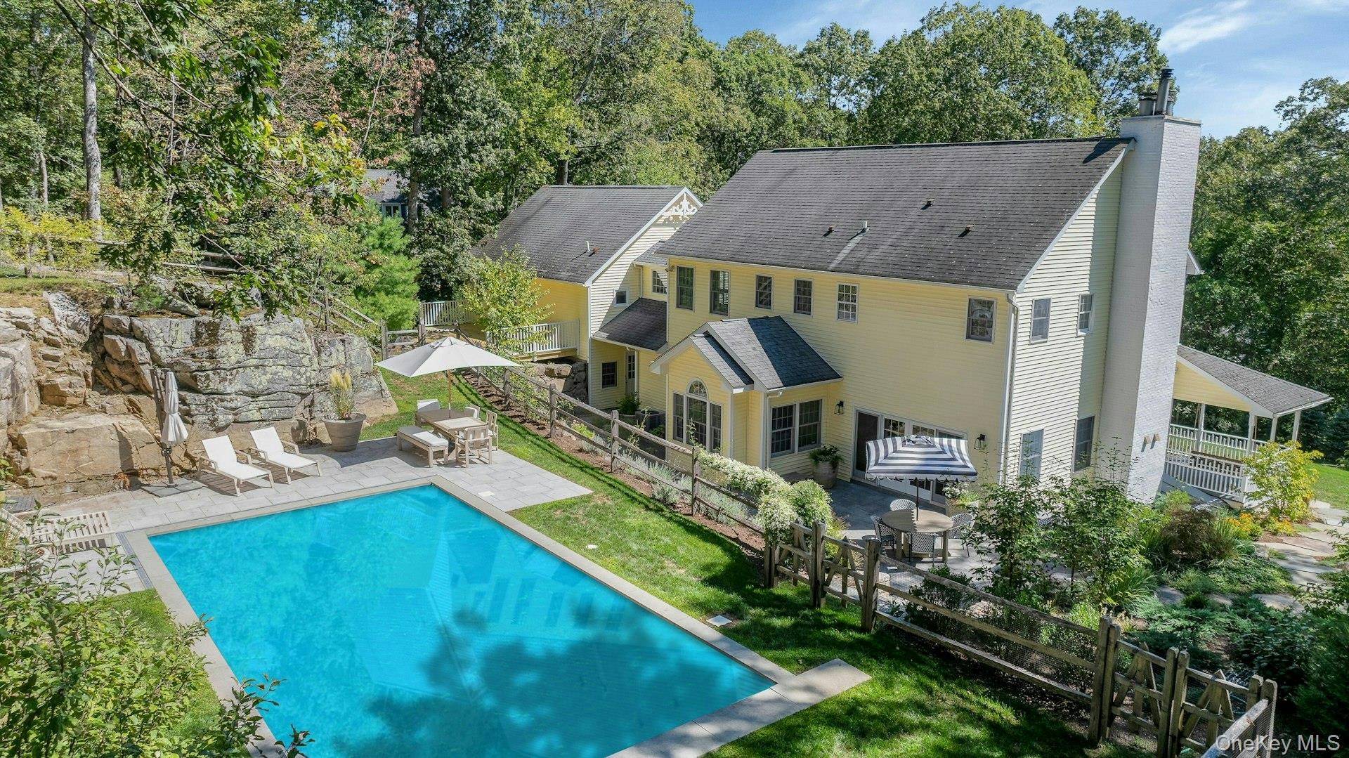 New to the market! This four bedroom, Colonial Farmhouse with a rocking chair porch features a classic layout of rooms. There is a private and quiet, newly built in-ground pool with a large built-in shelf for sunbathing/ kids/ pets and an electric cover. The pool is dramatically sited among large natural rocks. Vintage wide board flooring reclaimed from an antique Virginia barn is incorporated throughout the home and there is exceptional light in all the rooms due to glass French doors, over-sized windows and skylights. The primary suite has high ceilings, a walk-in closet and a generously sized Carrera marble bath. Includes a newly renovated guest suite/pool entertaining room with access to the pool and terraces. Beautiful landscaping, a 3 car garage and ample lower level storage add to this terrific property.