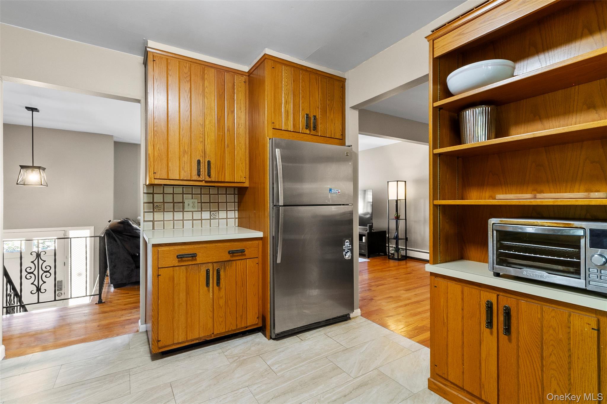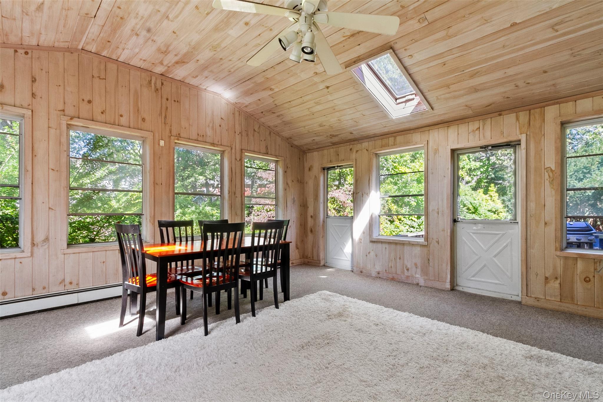 Raised Ranch in a quiet neighborhood in the Mahopac School District—must see! Highlights include a wonderful 600 sq. ft. three-season room with skylights and abundant windows, as well as a level backyard. The main level features a bright living room, eat-in kitchen with stainless steel appliances, dining room, the three-season room, primary bedroom with it's own bath, two additional bedrooms, and a full hall bath. Wood floors throughout main living areas. The lower level offers a finished family/rec room, along with laundry, utilities, storage, and a spacious attached two-car garage. Additional features include an above-ground oil tank, Ring doorbell, and convenient municipal water. Sold As-Is. Taxes do not include STAR Deduction, for those who qualify.