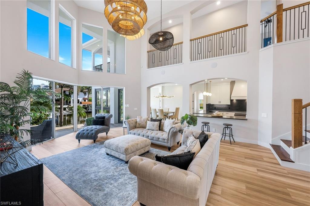 With over 3, 300 sq. ft. of beautifully updated living space, the home showcases soaring ceilings, floor-to-ceiling glass, and an open, light-filled floor plan perfect for entertaining. The main-level owner’s suite includes a private lanai with sparkling water views and a spa-inspired bath with Jacuzzi tub and walk-in shower. The 2023 remodeled kitchen with a leathered bar flows seamlessly into the living and dining areas, while a Sonos entertainment system, stylish bar, and private office (or 5th bedroom) enhance the lifestyle.