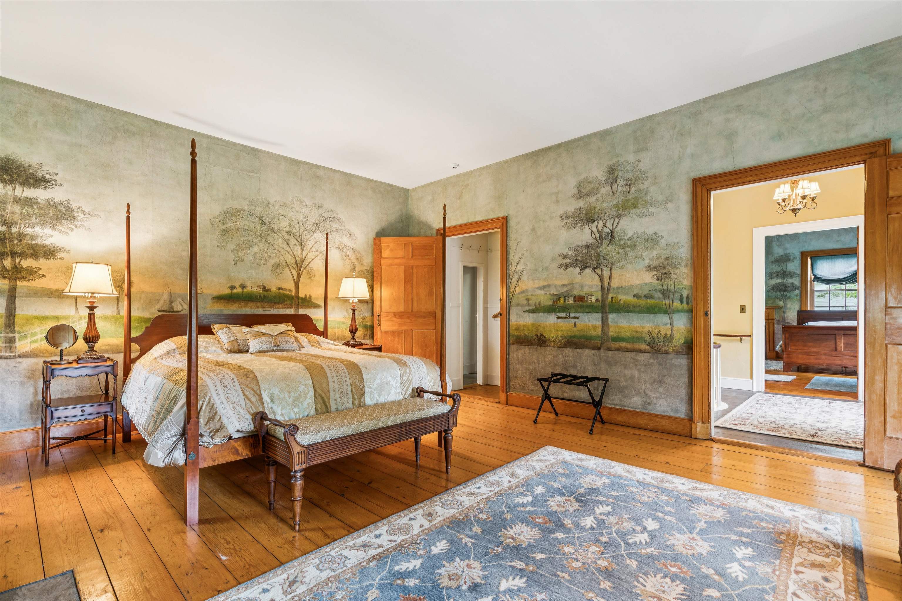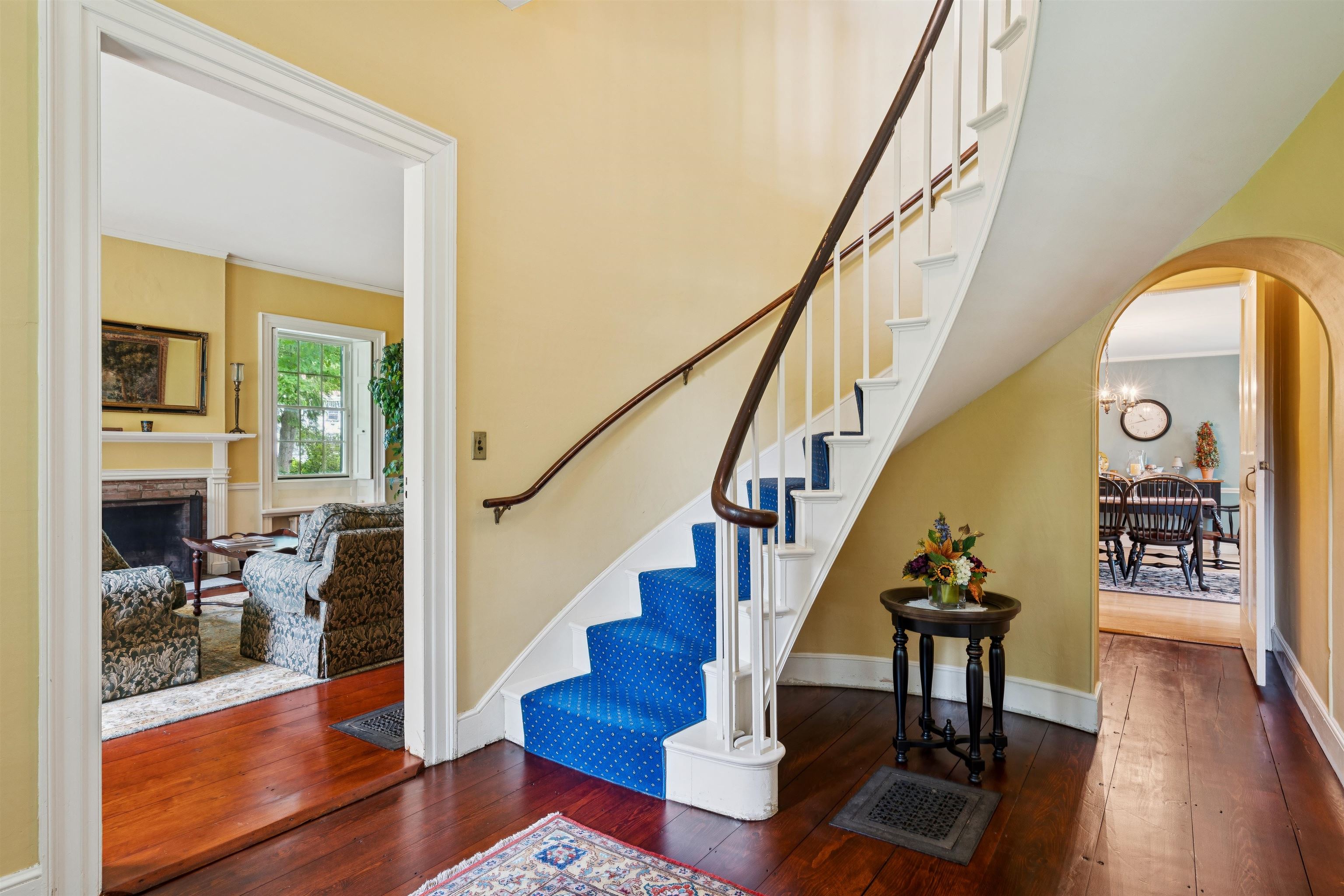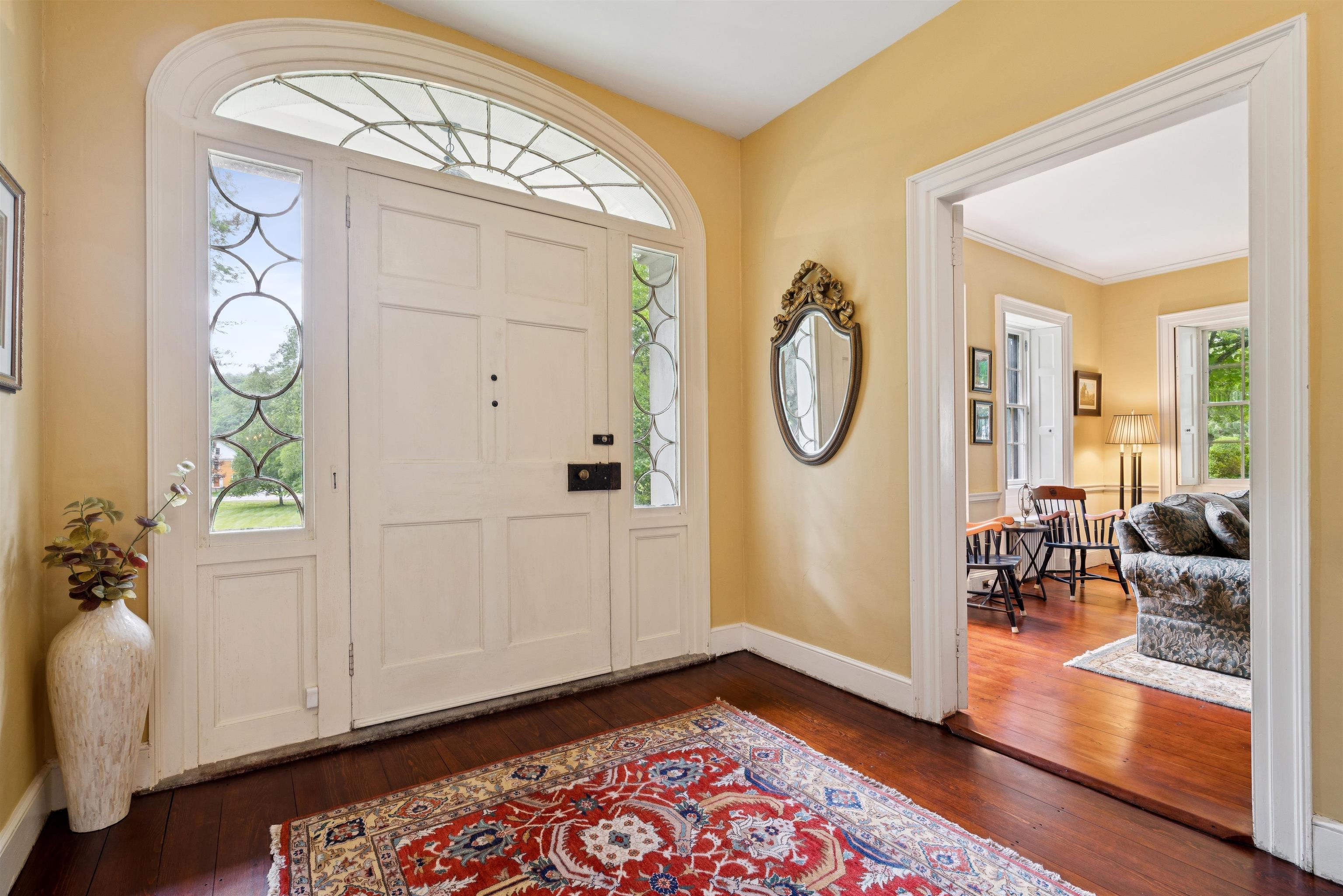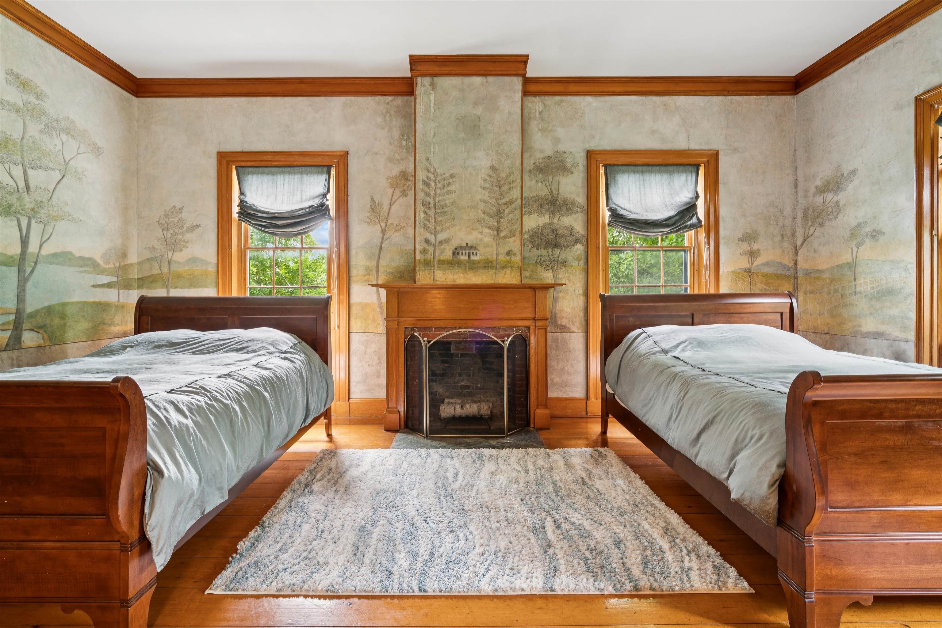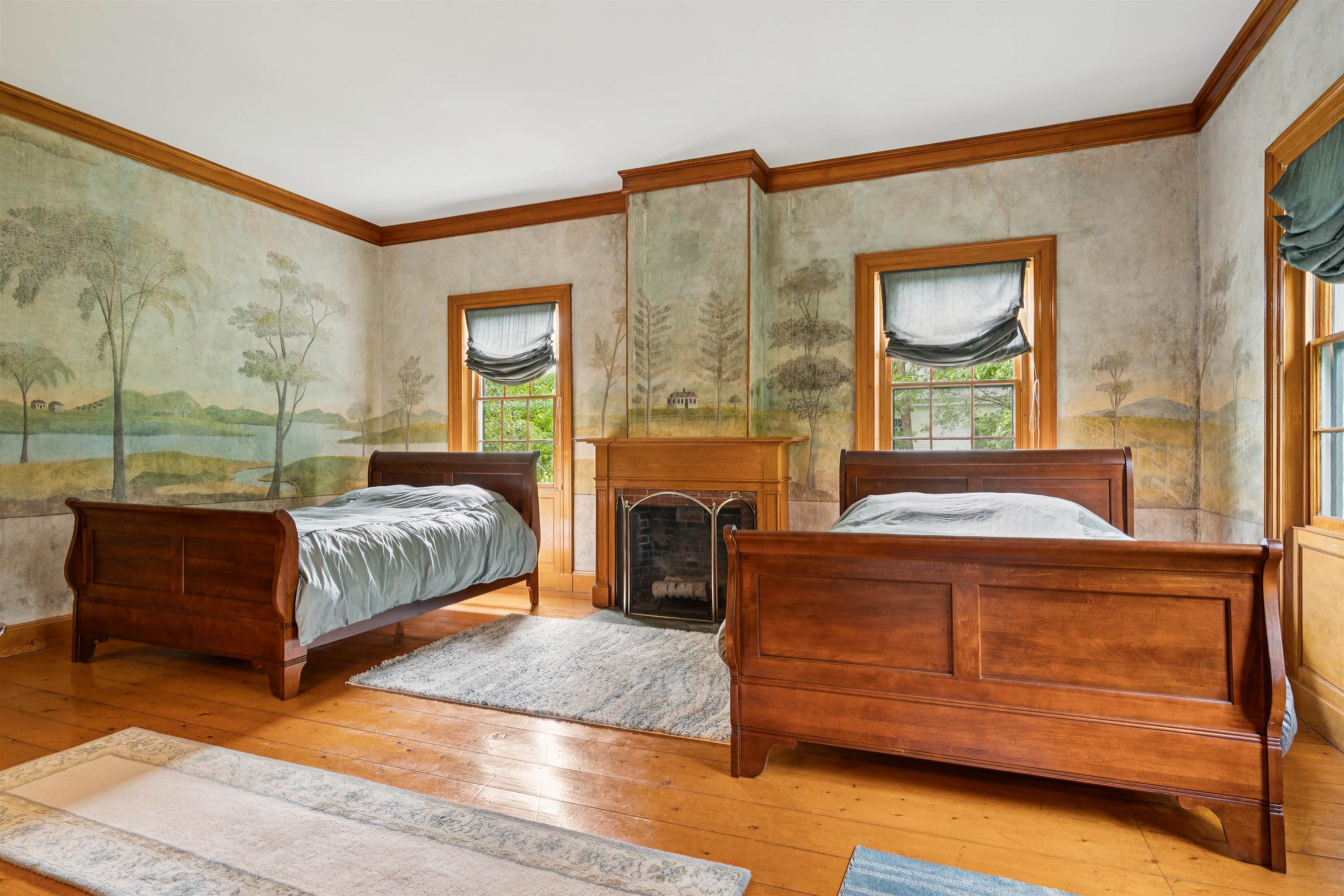 Hinckley House- Situated in Historic Orford Village, the Hinckley House is one of the esteemed Ridge Houses, comprised of seven magnificent Federal style homes. Named to the National Register in 1977, the house is perched at the top of broad sweeping lawns, where the Boston Symphony Orchestra played for town residents in the 1890’s. Thoughtfully and lovingly maintained, every aspect of care for this six-bedroom home has been rooted in respecting its historical significance and architectural integrity. The first floor has ample space to relax or dine, including a beautiful living room, a study, and two light filled dining rooms, one formal and one informal. The connected barn was converted to a dance hall during the 1890s, and today serves as a stunning game room. Guests entering the front foyer are greeted by a graceful winding staircase. Two upstairs bedrooms boast beautifully restored original Rufus Porter and Jonathan Poor folk art murals from the 1820-1830 period on all four walls, which were rediscovered by the prior owner in the 1960s and professionally restored. The home hosted an ailing Daniel Webster, who stayed in the North Bedroom for several days during the Presidential campaign of 1840. Three of the home’s seven antique fireplaces are in service and add a warm glow in chilly weather. Just a 20-minute drive to Dartmouth College and Dartmouth-Hitchcock Medical Center, the Hinckley House provides the serenity of a classic New England rural community.