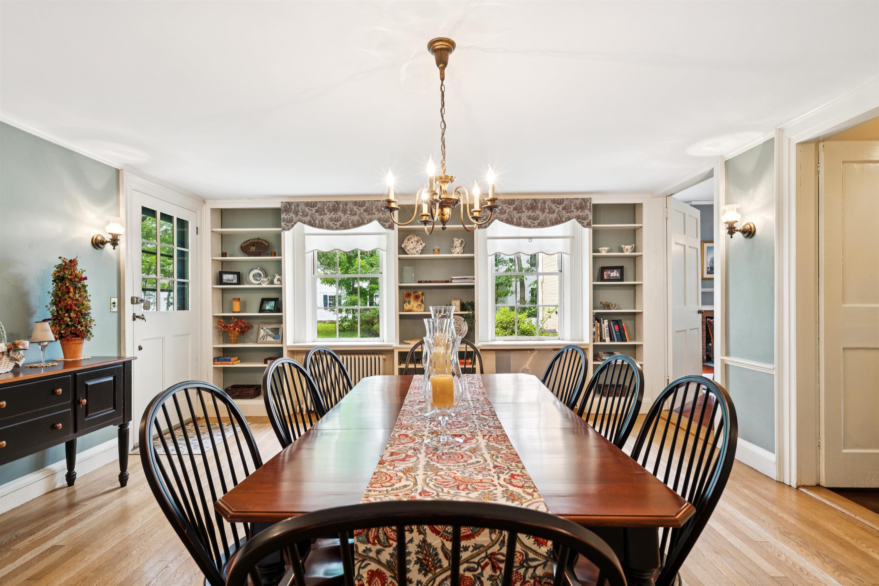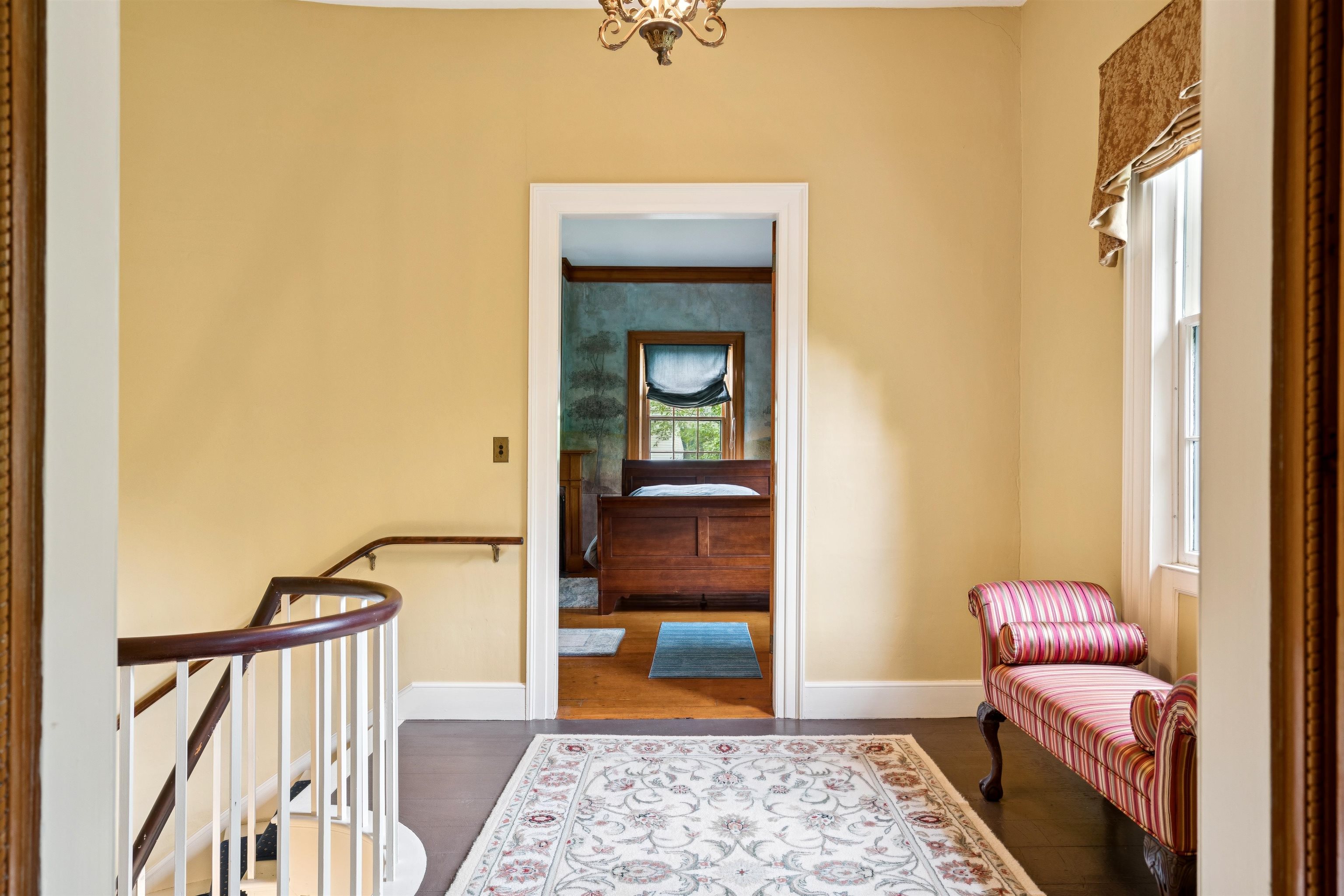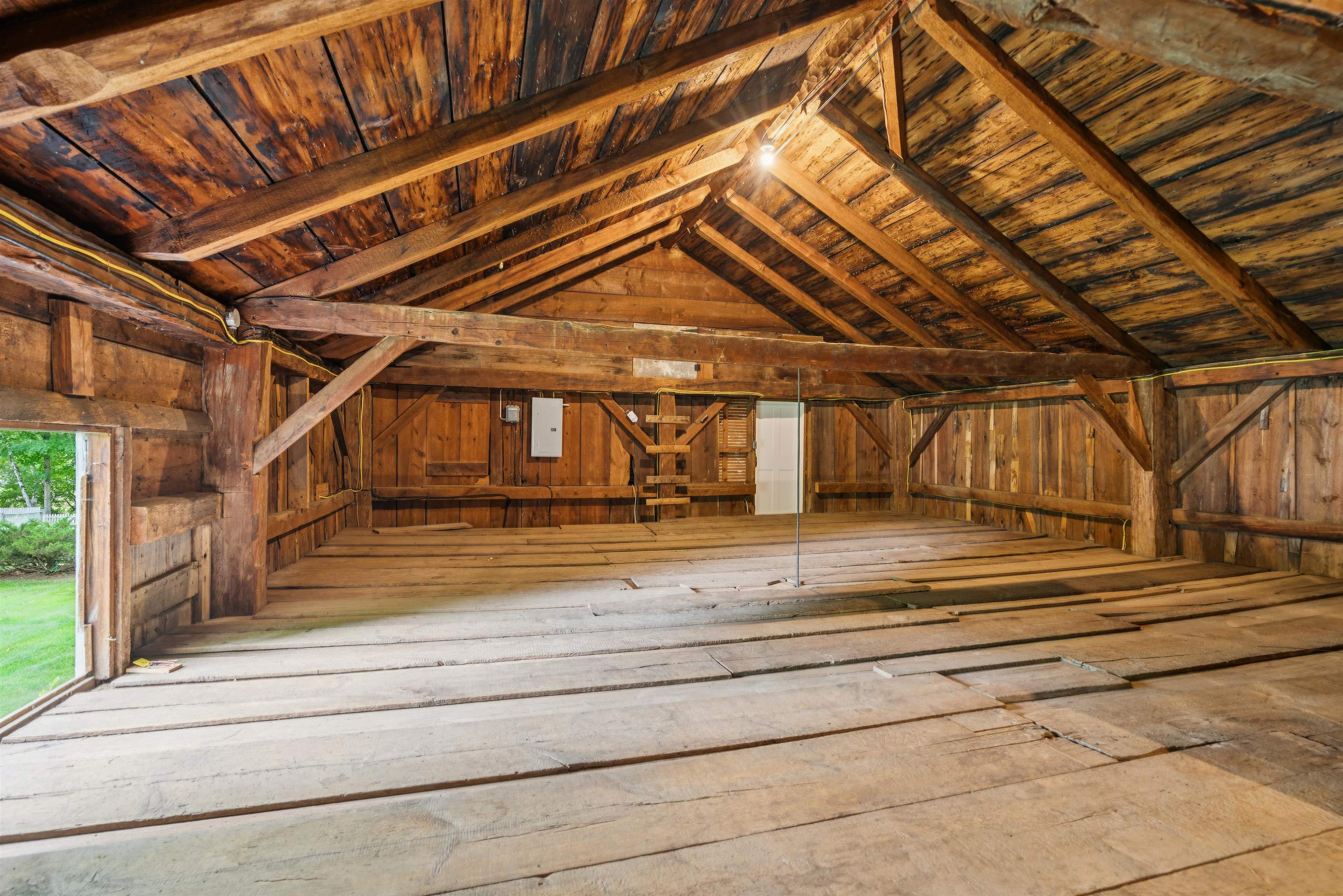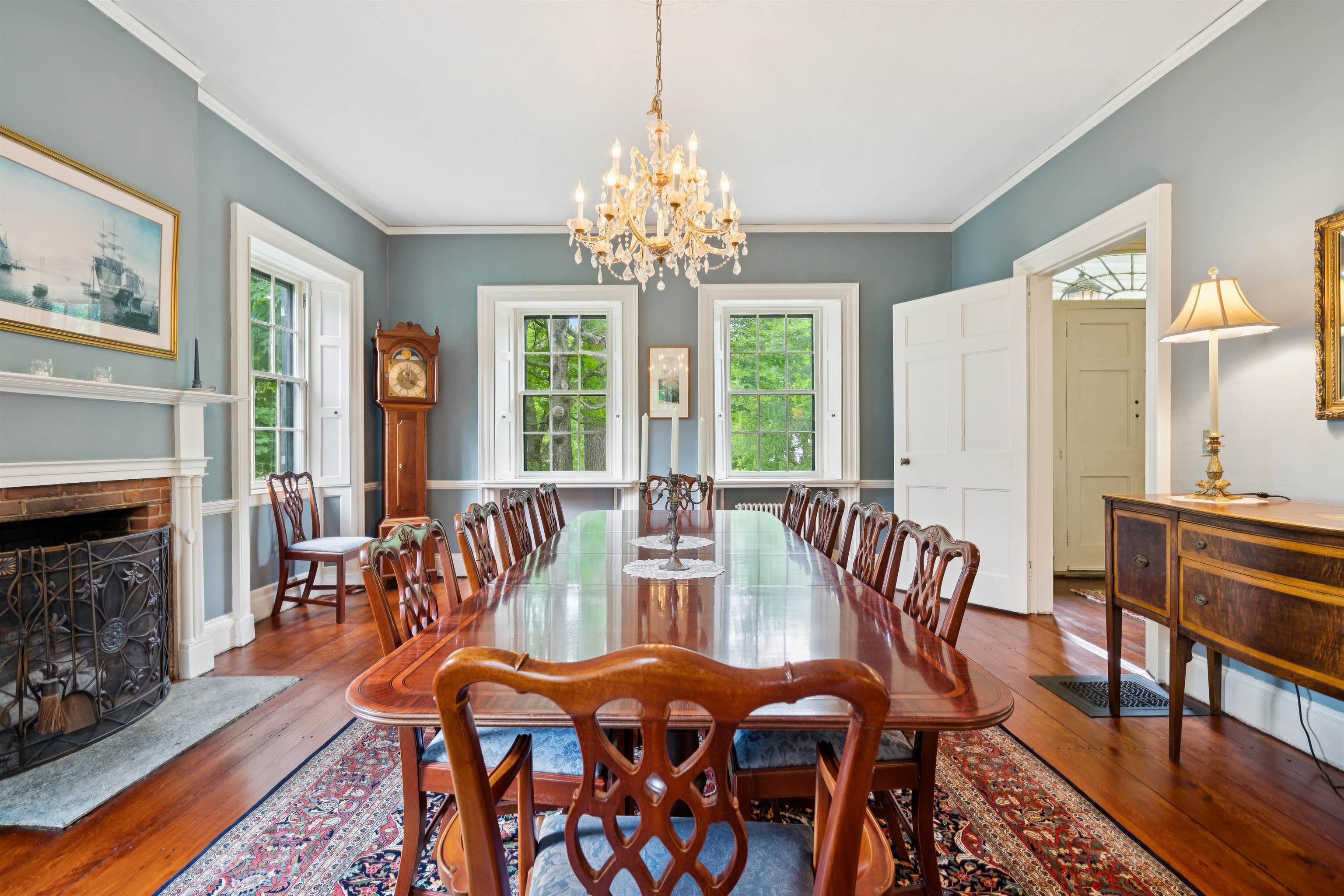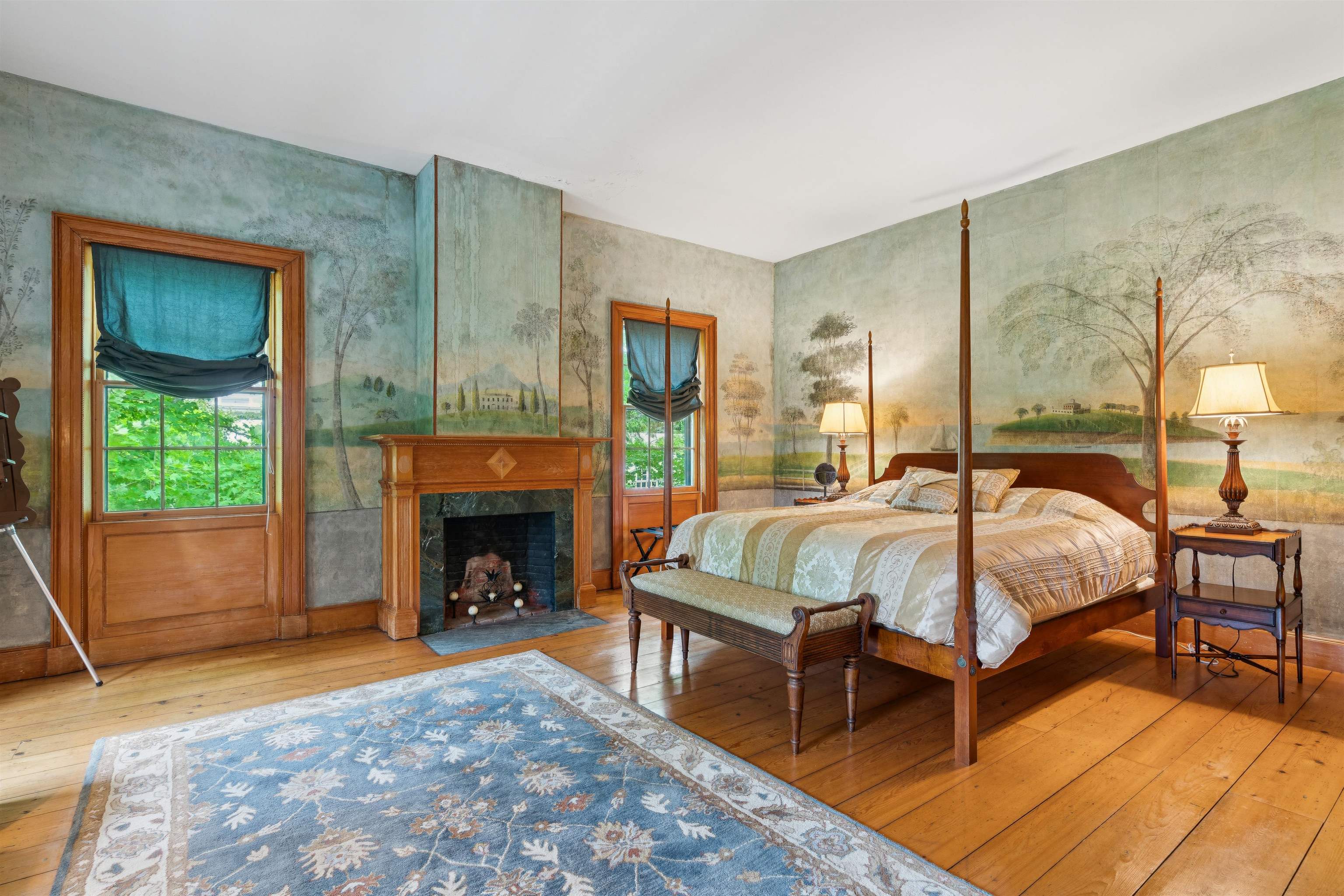 Hinckley House- Situated in Historic Orford Village, the Hinckley House is one of the esteemed Ridge Houses, comprised of seven magnificent Federal style homes. Named to the National Register in 1977, the house is perched at the top of broad sweeping lawns, where the Boston Symphony Orchestra played for town residents in the 1890’s. Thoughtfully and lovingly maintained, every aspect of care for this six-bedroom home has been rooted in respecting its historical significance and architectural integrity. The first floor has ample space to relax or dine, including a beautiful living room, a study, and two light filled dining rooms, one formal and one informal. The connected barn was converted to a dance hall during the 1890s, and today serves as a stunning game room. Guests entering the front foyer are greeted by a graceful winding staircase. Two upstairs bedrooms boast beautifully restored original Rufus Porter and Jonathan Poor folk art murals from the 1820-1830 period on all four walls, which were rediscovered by the prior owner in the 1960s and professionally restored. The home hosted an ailing Daniel Webster, who stayed in the North Bedroom for several days during the Presidential campaign of 1840. Three of the home’s seven antique fireplaces are in service and add a warm glow in chilly weather. Just a 20-minute drive to Dartmouth College and Dartmouth-Hitchcock Medical Center, the Hinckley House provides the serenity of a classic New England rural community.