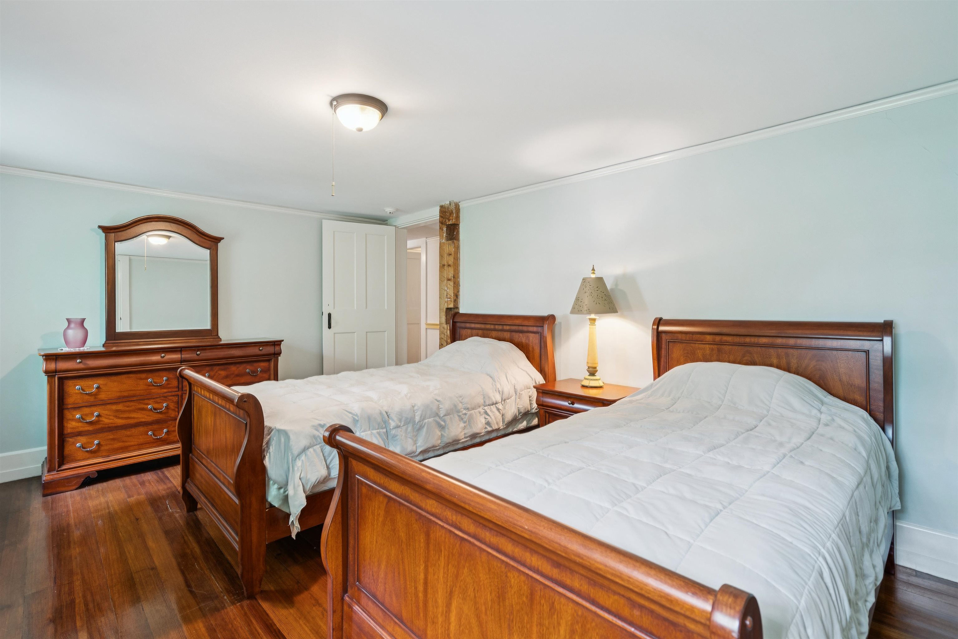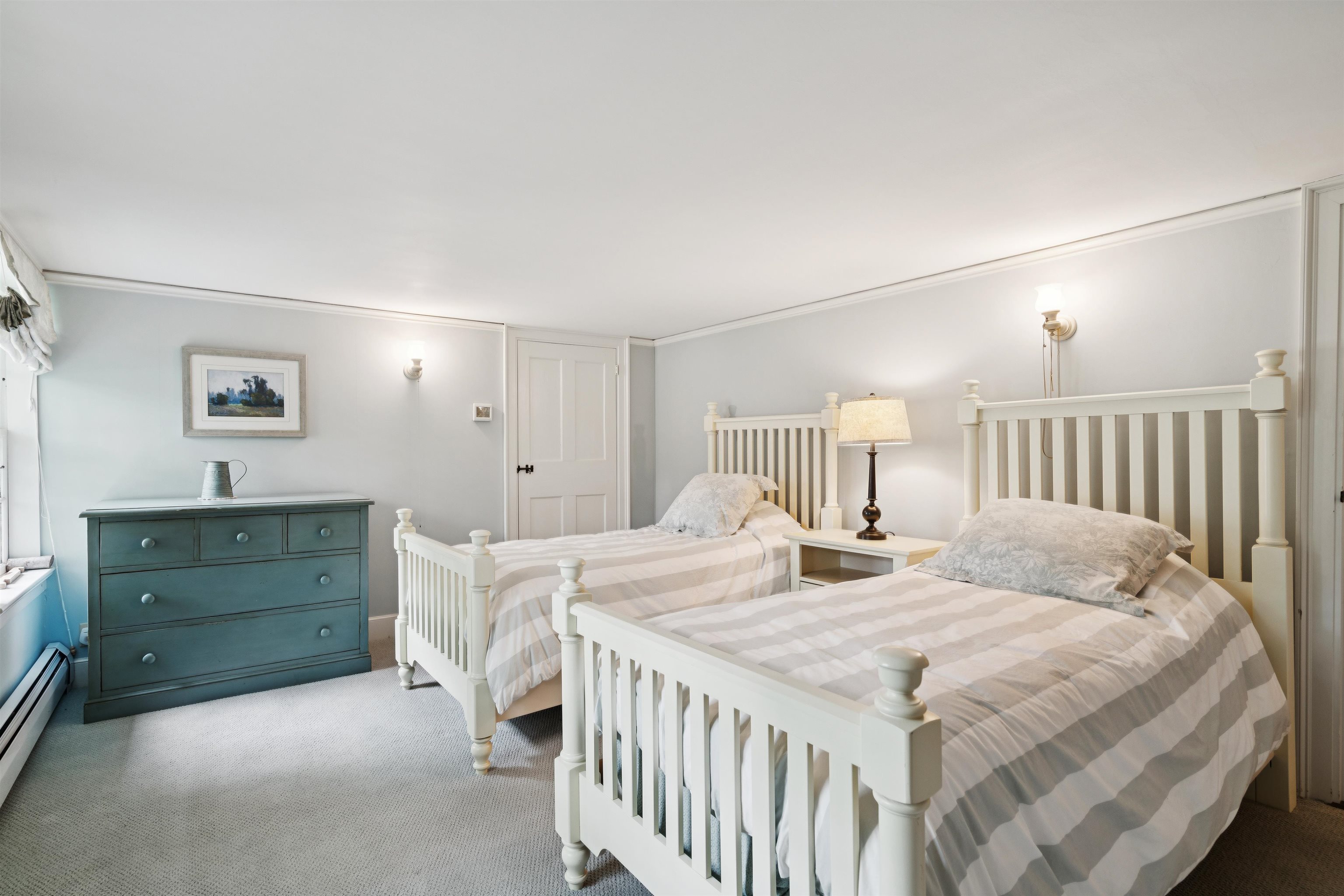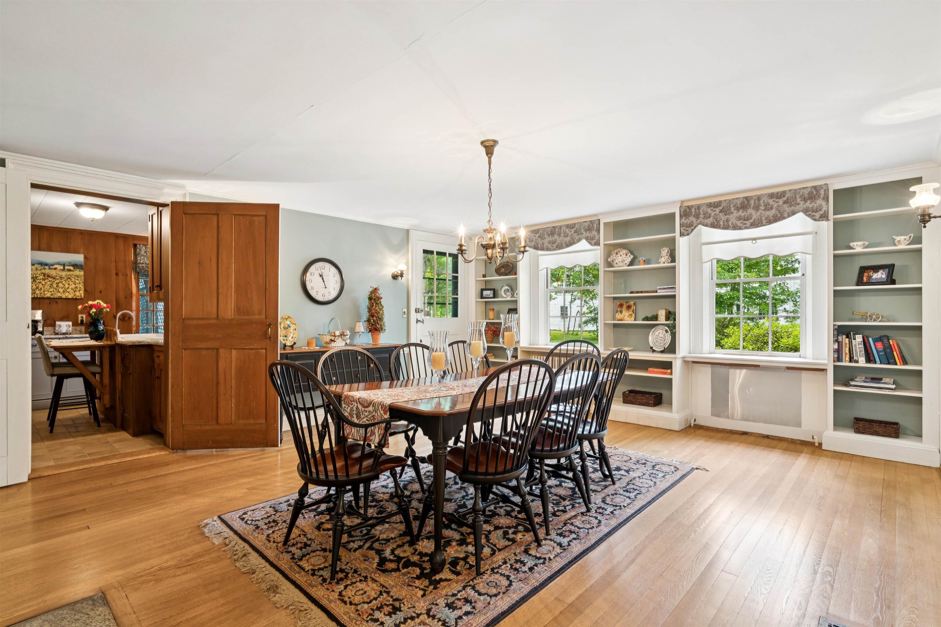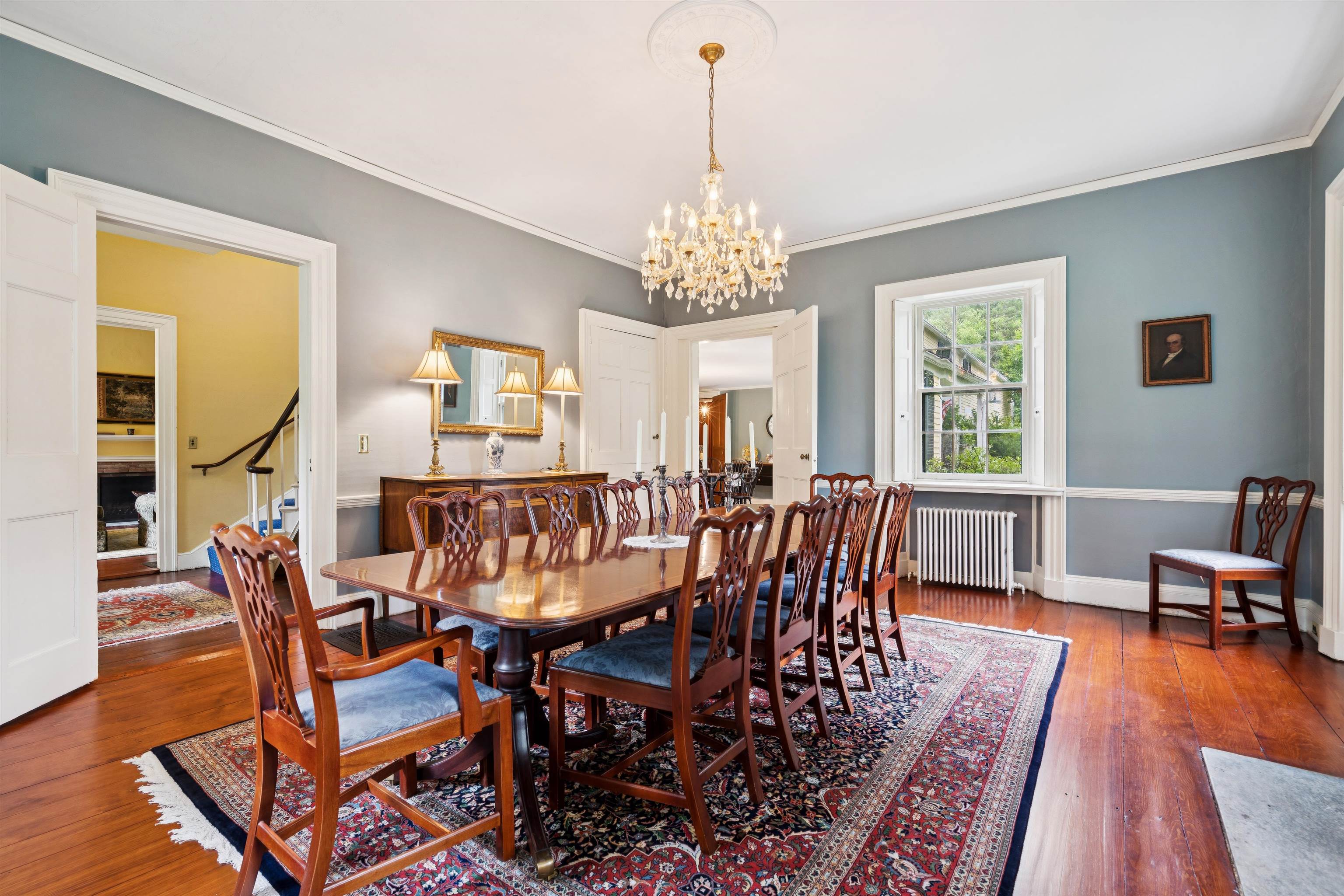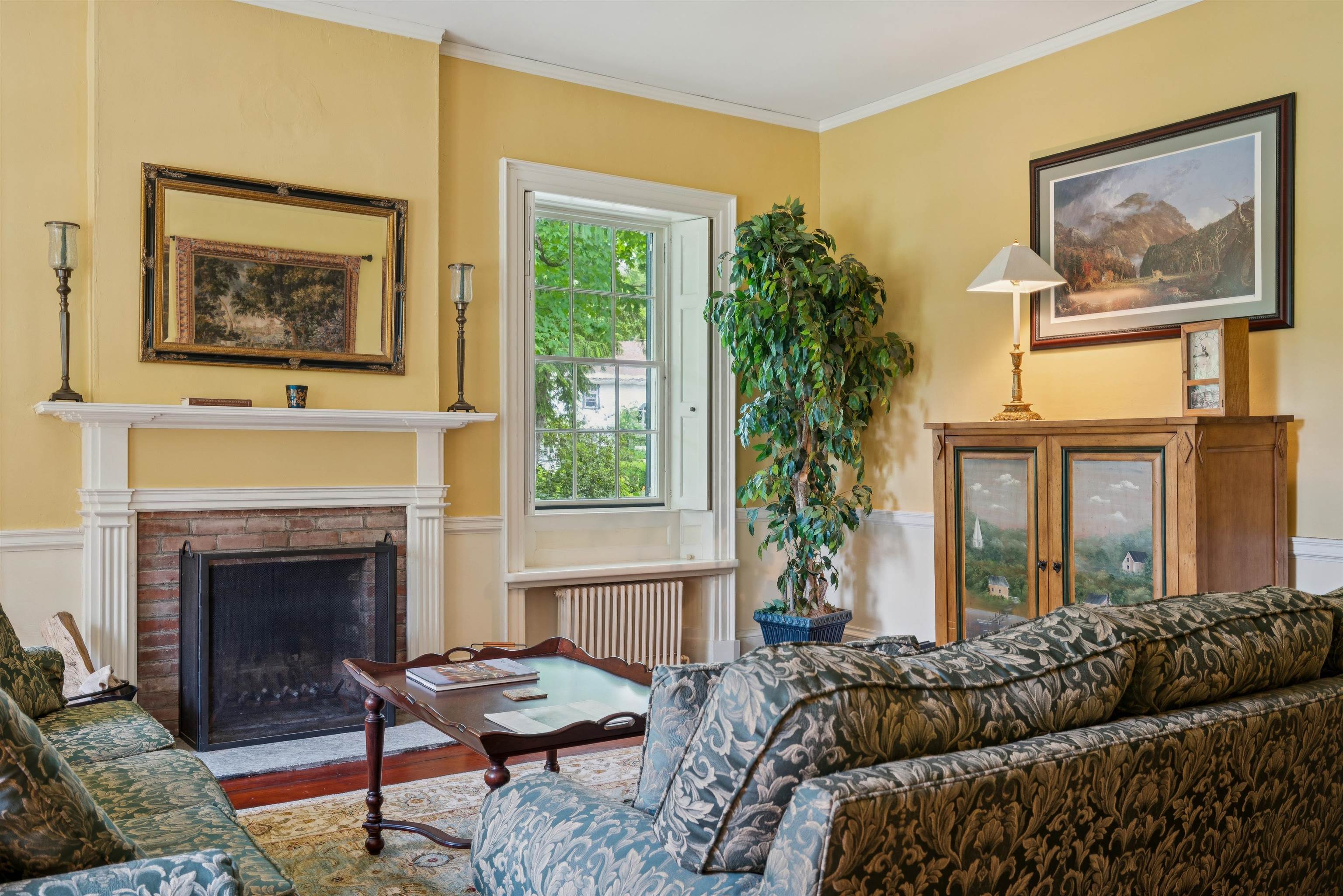 Hinckley House- Situated in Historic Orford Village, the Hinckley House is one of the esteemed Ridge Houses, comprised of seven magnificent Federal style homes. Named to the National Register in 1977, the house is perched at the top of broad sweeping lawns, where the Boston Symphony Orchestra played for town residents in the 1890’s. Thoughtfully and lovingly maintained, every aspect of care for this six-bedroom home has been rooted in respecting its historical significance and architectural integrity. The first floor has ample space to relax or dine, including a beautiful living room, a study, and two light filled dining rooms, one formal and one informal. The connected barn was converted to a dance hall during the 1890s, and today serves as a stunning game room. Guests entering the front foyer are greeted by a graceful winding staircase. Two upstairs bedrooms boast beautifully restored original Rufus Porter and Jonathan Poor folk art murals from the 1820-1830 period on all four walls, which were rediscovered by the prior owner in the 1960s and professionally restored. The home hosted an ailing Daniel Webster, who stayed in the North Bedroom for several days during the Presidential campaign of 1840. Three of the home’s seven antique fireplaces are in service and add a warm glow in chilly weather. Just a 20-minute drive to Dartmouth College and Dartmouth-Hitchcock Medical Center, the Hinckley House provides the serenity of a classic New England rural community.