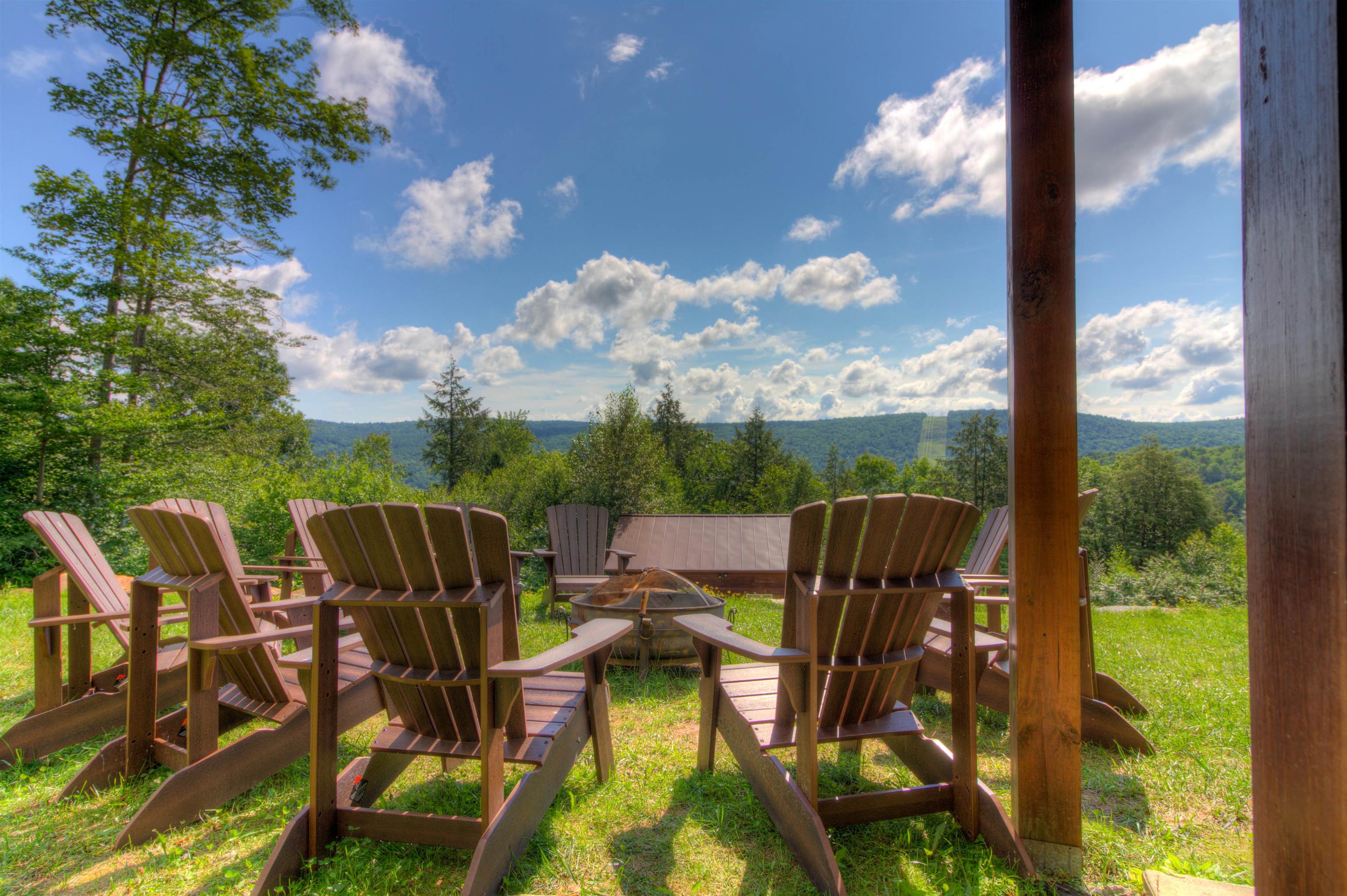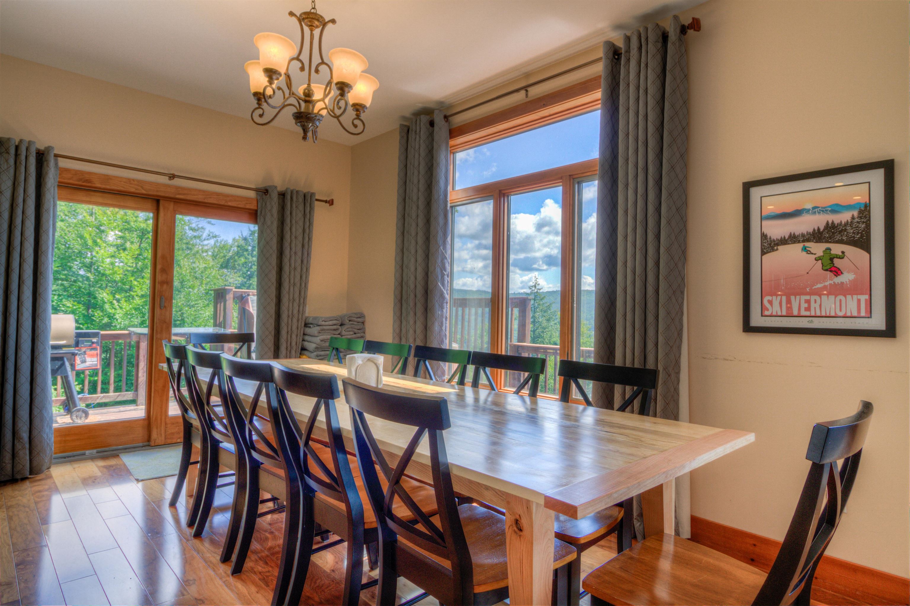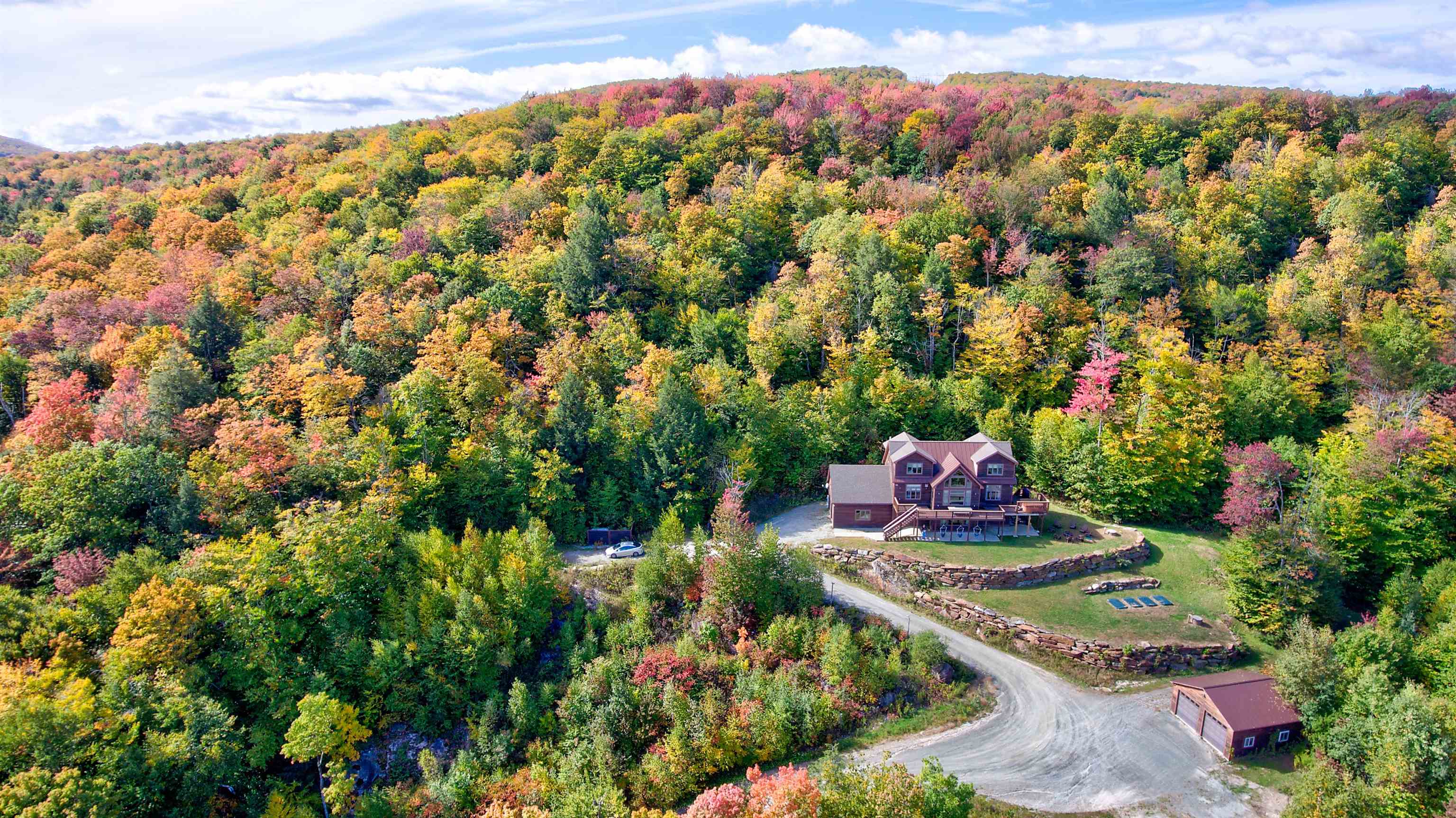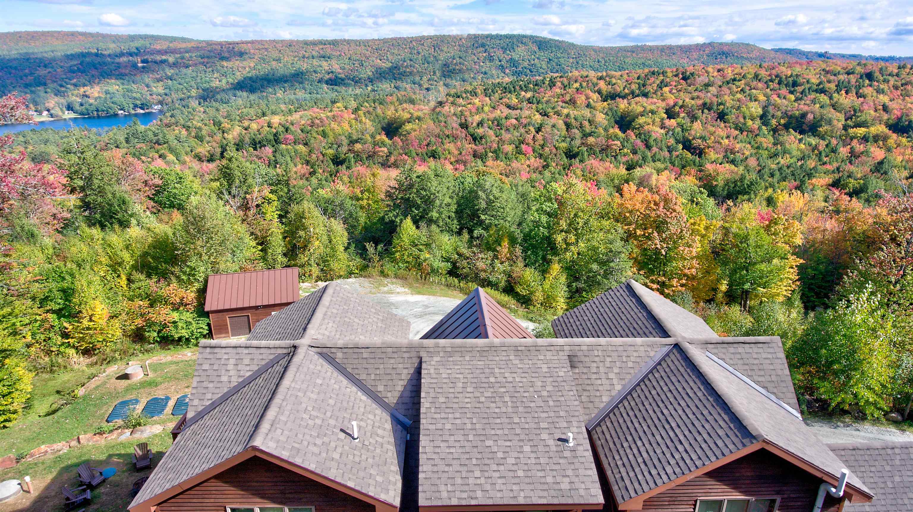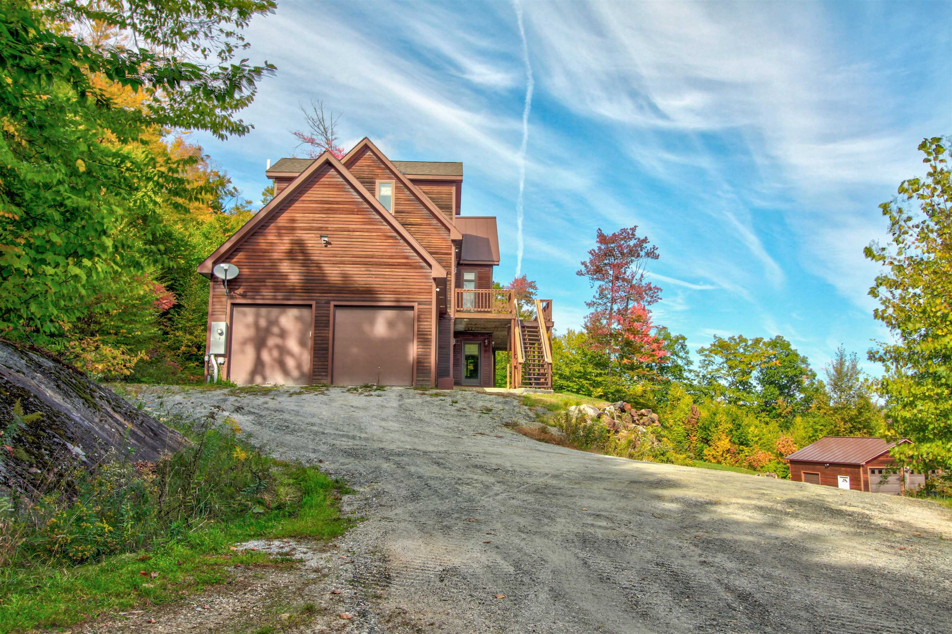 Perched high on the hillside, this home offers expansive views of the lakes and mountains. Located at the end of a quiet road in the Farm Ridge Community just under 5 miles from the base of Okemo Mountain and 4 miles to Plymouth State Park for boating and swimming in the warmer months. The maintained trails on it's 16. 15 acres makes it easy to explore, while the deck is a perfect place to relax, soak in the hot tub while enjoying views of Lake Rescue. The interior of this hillside retreat boasts an expansive three-level floor plan designed for both comfort and entertaining. Large windows throughout capturing the changes of the season, gorgeous walnut flooring, a stunning great room with soaring ceilings and two gas fireplaces. This home offers plenty of room with four bedrooms—including two primary suites—plus two versatile bonus rooms that can serve as additional sleeping space or a home office. The attached oversized garage provides ample storage for all your gear, while the detached heated garage is perfect for the bigger toys - snowmobiles, boats, ATV's.