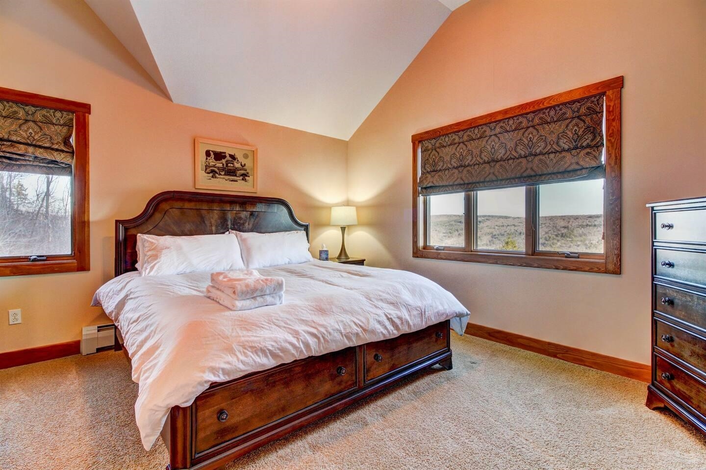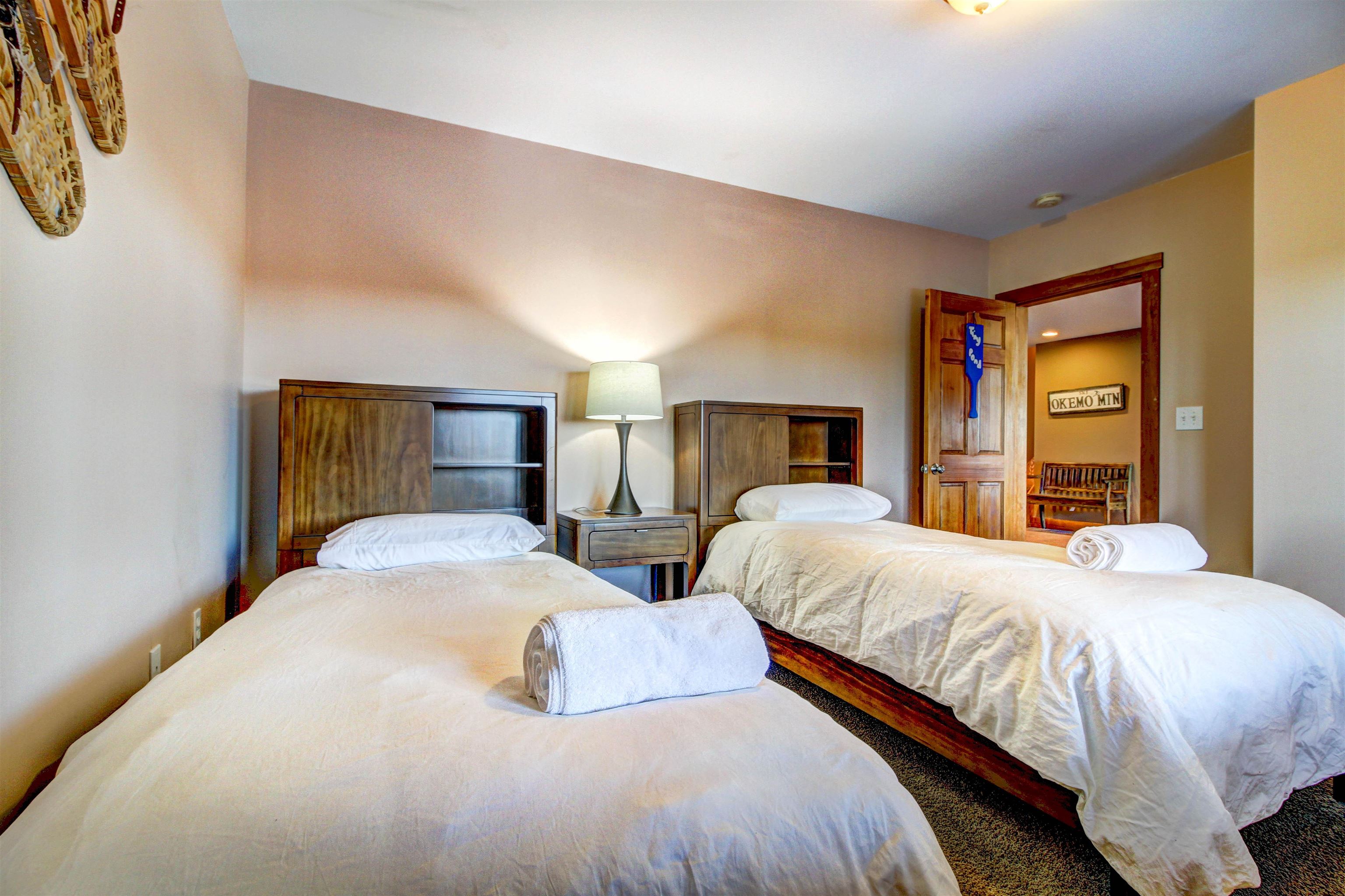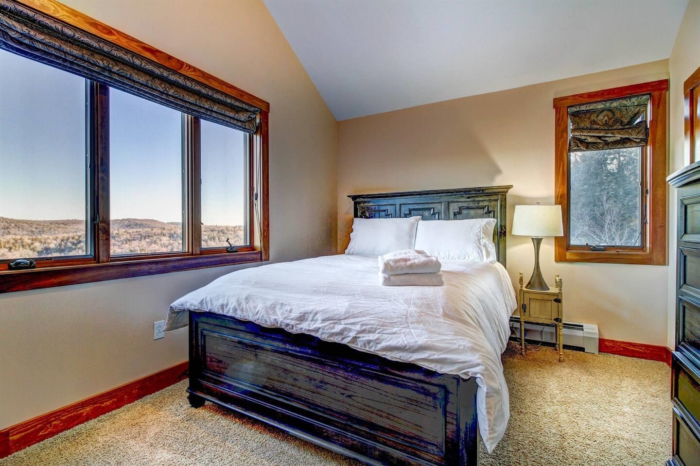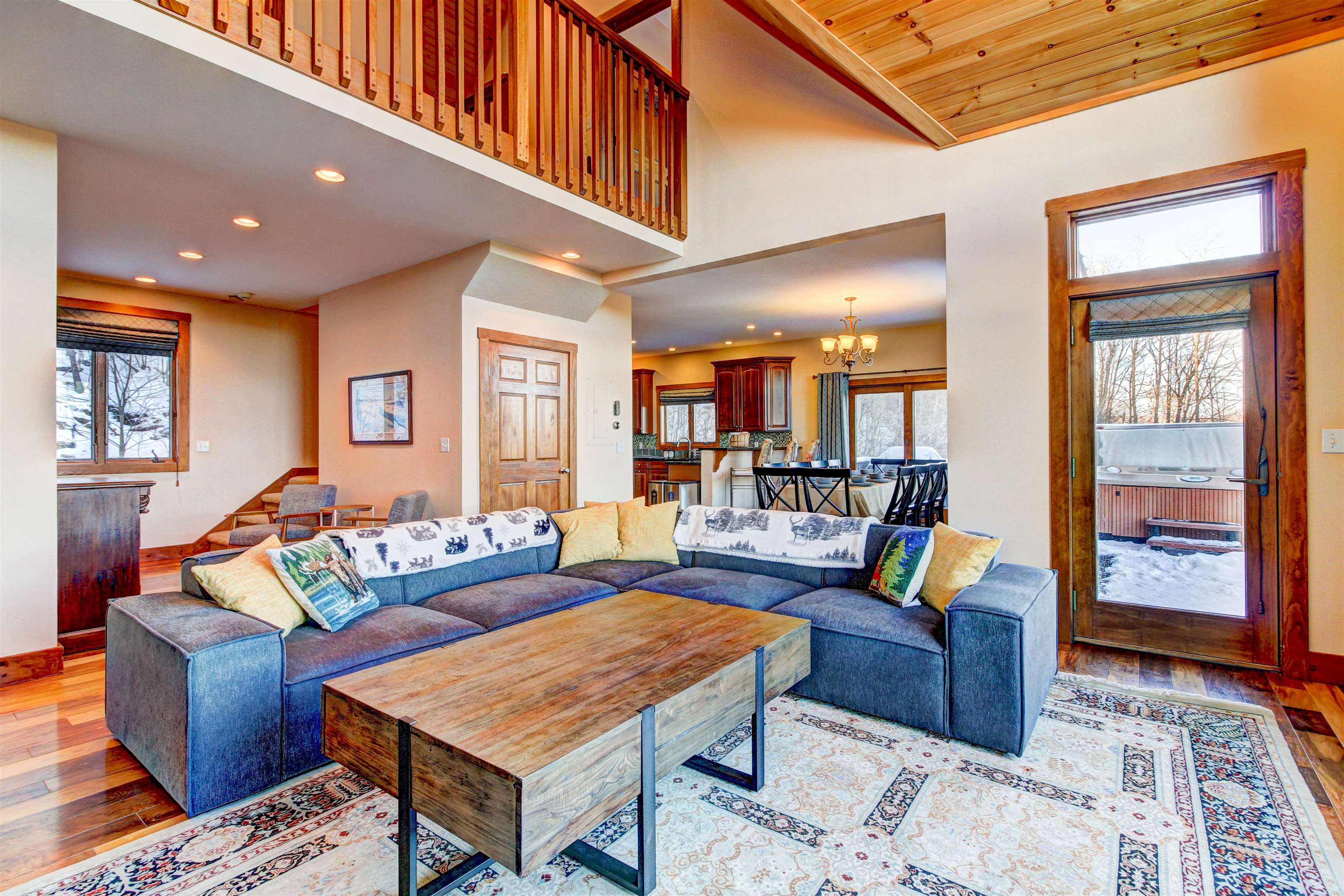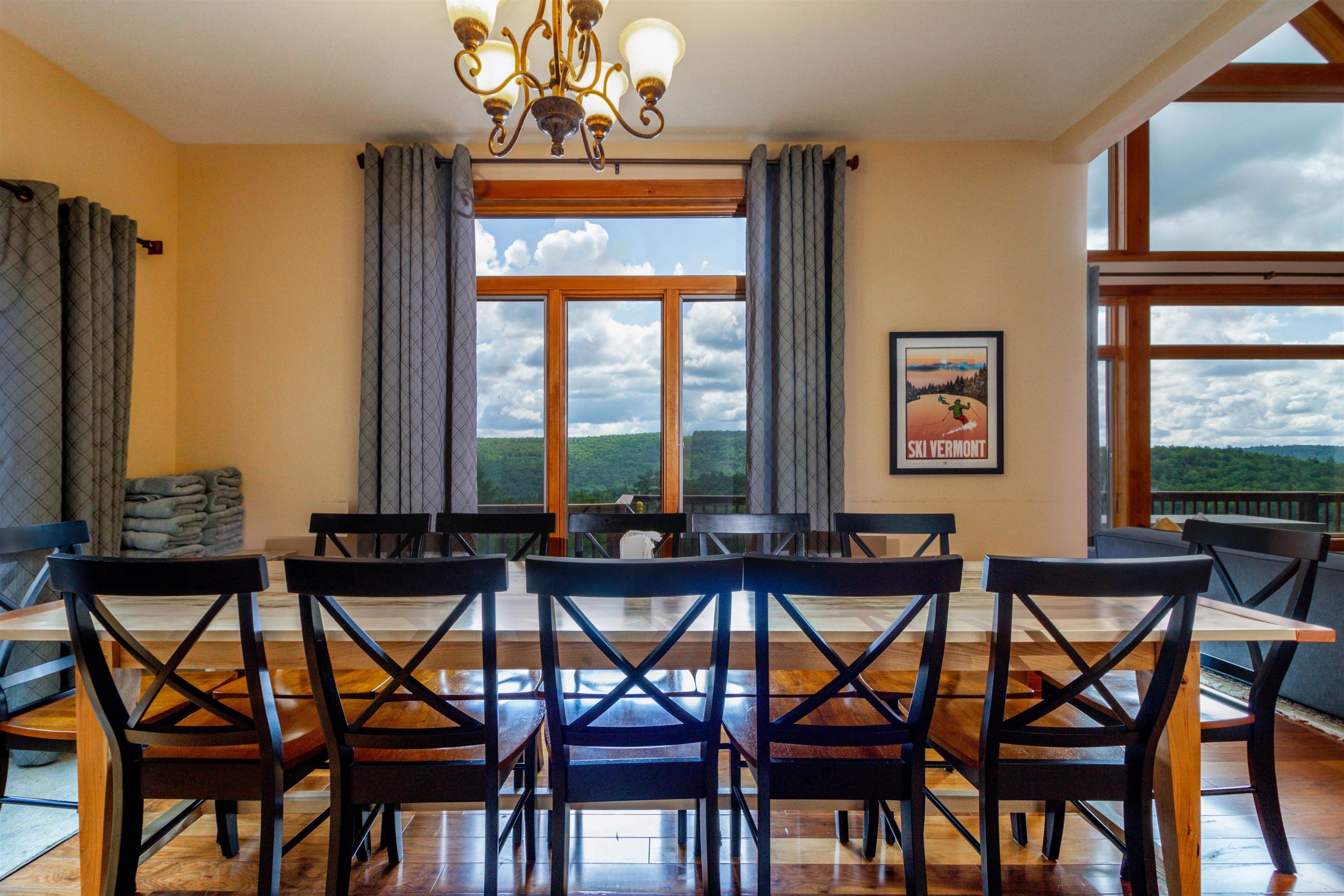 Perched high on the hillside, this home offers expansive views of the lakes and mountains. Located at the end of a quiet road in the Farm Ridge Community just under 5 miles from the base of Okemo Mountain and 4 miles to Plymouth State Park for boating and swimming in the warmer months. The maintained trails on it's 16. 15 acres makes it easy to explore, while the deck is a perfect place to relax, soak in the hot tub while enjoying views of Lake Rescue. The interior of this hillside retreat boasts an expansive three-level floor plan designed for both comfort and entertaining. Large windows throughout capturing the changes of the season, gorgeous walnut flooring, a stunning great room with soaring ceilings and two gas fireplaces. This home offers plenty of room with four bedrooms—including two primary suites—plus two versatile bonus rooms that can serve as additional sleeping space or a home office. The attached oversized garage provides ample storage for all your gear, while the detached heated garage is perfect for the bigger toys - snowmobiles, boats, ATV's.
