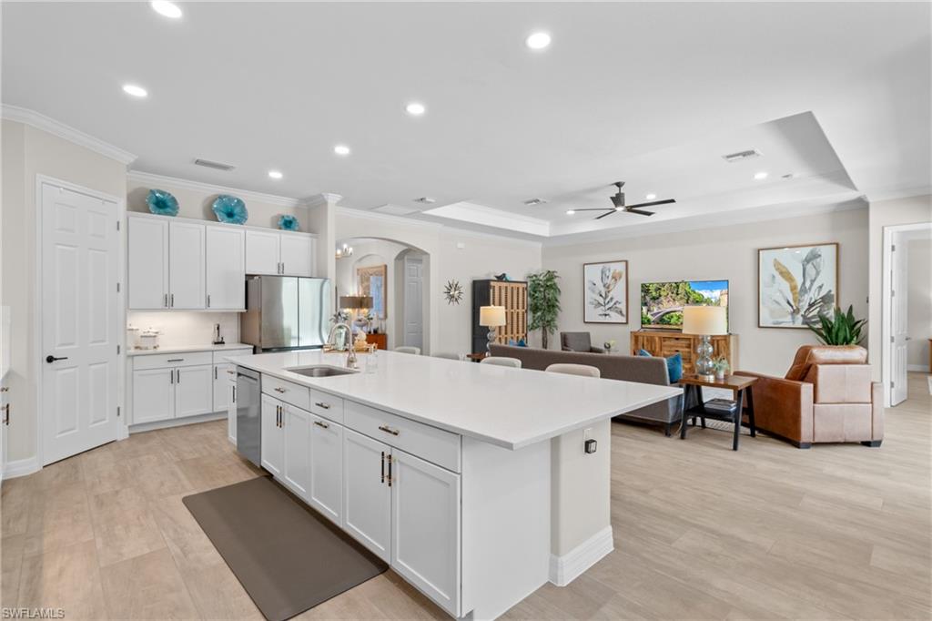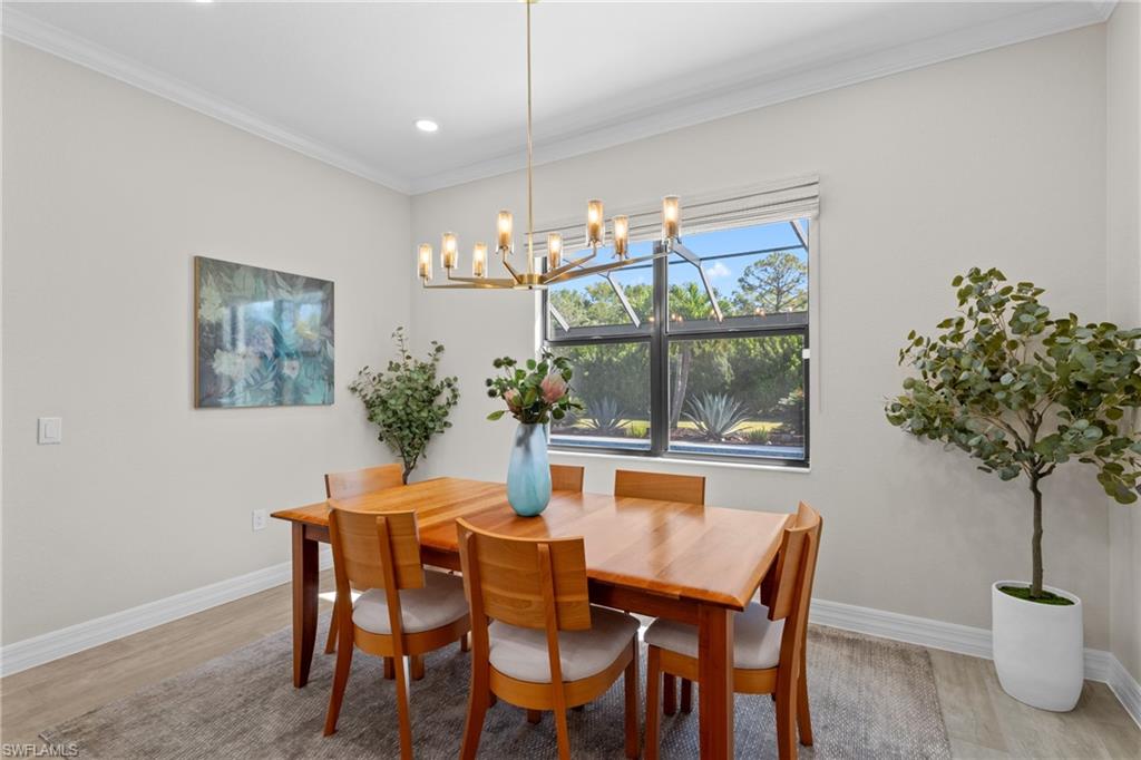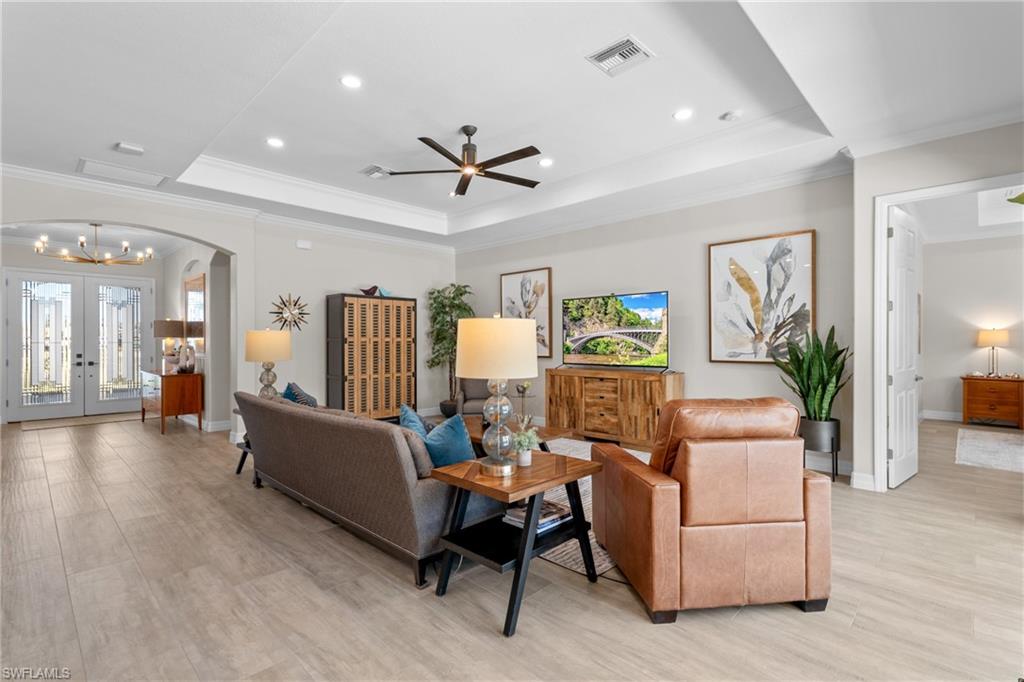 A LOT TO LOVE! Built in 2019, this "Summerville" floorplan home in LaMorada offers both luxury and privacy on a nearly HALF-ACRE lot with privacy galore and lake views. With 3 bedrooms plus den, 3 full baths, and a 3-car garage, it seems like the perfect home for those looking for space and comfort. The oversized paver driveway lined with Royal Palm Trees sets an impressive tone as you approach the property. Inside, the wood-look tile floors can be found throughout and an open Great Room layout creates an inviting, modern feel, while the kitchen is a standout with its oversized island, quartz countertops, and brand-new refrigerator and dishwasher. The master suite seems like a peaceful retreat with its spacious bath featuring his and her vanities, a soaking tub, and walk-in shower, plus direct access to the lanai. The outdoor area, with a custom heated saltwater pool, spa, and sunshelf, is perfect for soaking up the Florida sunshine and enjoying the serene lake views. The upgraded limestone decking and picture window screen cage only enhance the space. The addition of hurricane impact windows and doors provides peace of mind, and the freshly painted interior, new appliances, plantation shutters, and crown molding show that no detail has been overlooked. The pre-plumbed outdoor kitchen is a fantastic feature for anyone who loves to entertain outdoors. As for the LaMorada community, it offers a wealth of amenities, from a resort pool and gym to tennis, pickleball, and bocce ball courts, as well as a restaurant and bar. The location is ideal, with quick access to RSW, Mercato, beaches, and downtown Naples. The low fees of $1, 812/quarter, which cover landscaping, irrigation, and club amenities, along with the fact that there’s NO CDD, make this property even more appealing.