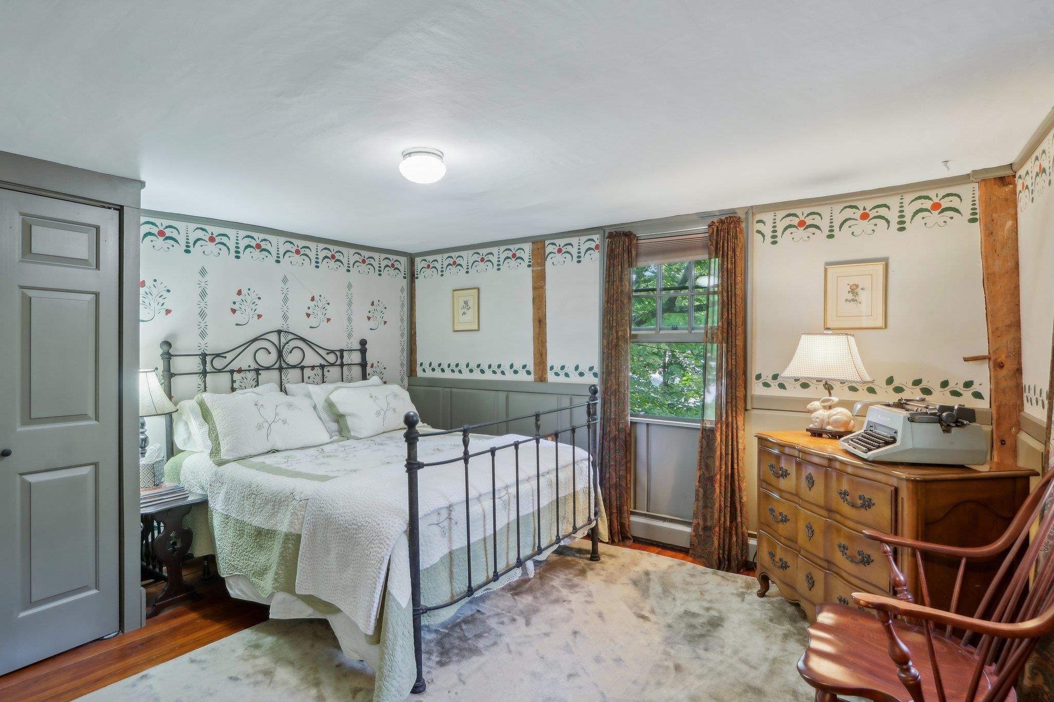 MAKE OFFER this Weekend !!!Charming antique colonial with modern features make this Derry Village home a rare find. Conveniently located within walking distance to Pinkerton Acadamy and minutes from 93 on nearly 1 acre of beautiful green space with perennial gardens. Upon entering the 4-bedroom 2. 5 bath center entrance colonial, you will be greeted with a combination of modern amenities and antique charm. The large eat-in kitchen has been updated with stainless steel appliances, radiant floors and a nod to the 18th century with soapstone countertops and reclaimed American chestnut flooring. Throughout the house you will see post and beam construction, wooden doors with antique latches, original Moses Eaton stenciling blended with 3 zone heat, updated windows, updated bathrooms, and a new roof. Unique primary suite with ensuite bathroom, walk in closet and access to second floor porch overlooking the yard. There is potential for expansion in the attached 3-story 29 x 29 barn, which currently has room for parking, a workshop, rec room, as well as heating, electrical and plumbing futures in place. The Barn offers plenty of storage for in house business potential.