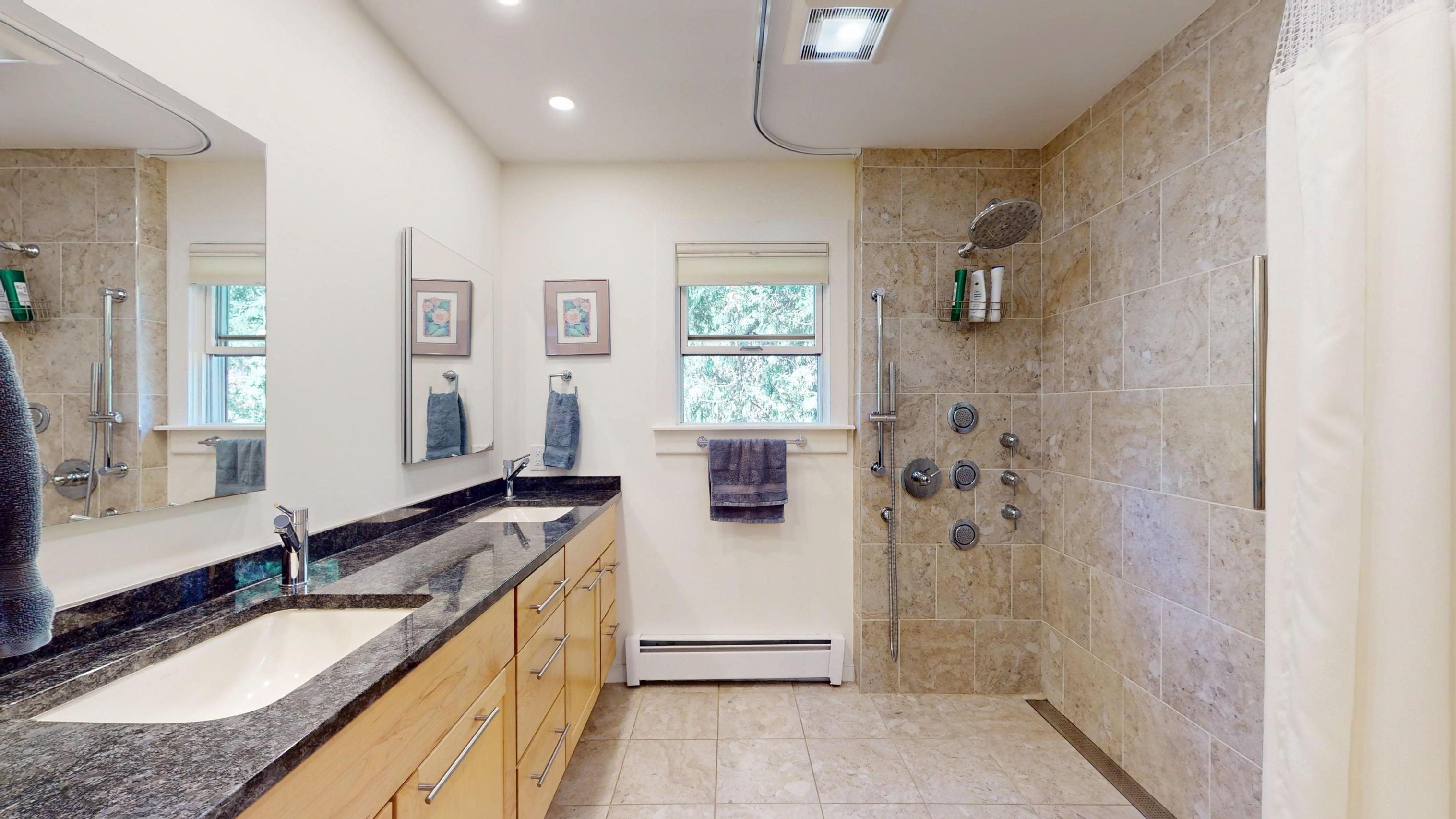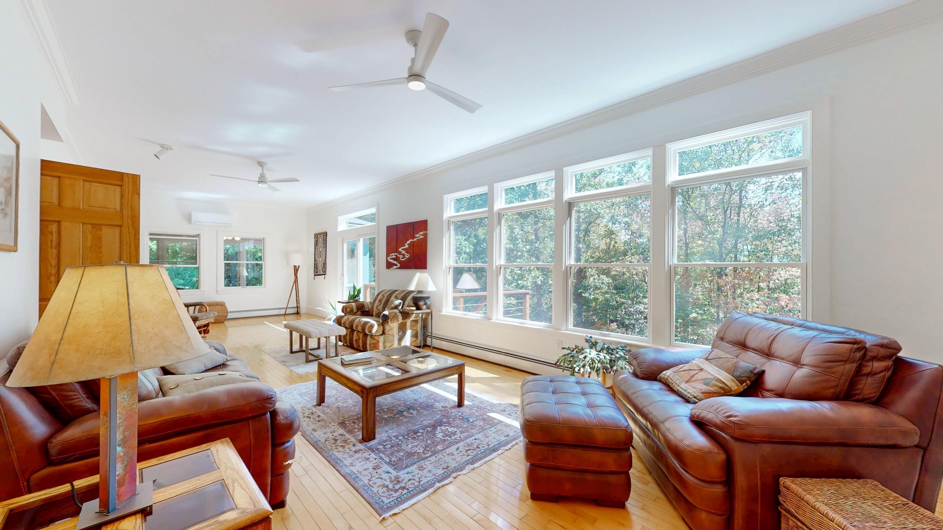 This house has a flexible floor plan, with bedroom options on all three levels. On the main level, the kitchen/dining area opens to a large living room with built in bookcases and maple floors. The new kitchen has beautiful wood cabinets, granite counter tops and stainless appliances. A gas fireplace creates a warm hearth in the main living area and glass doors lead out to the upper deck. Tons of natural light throughout the house! Primary bedroom with an updated bath and an additional bedroom and bath, with a small office as well. A sweet screened-in porch that connects to the upper back deck completes this level. The lower level could be a perfect set up for an in-law apartment! The lower walkout level has its own entrance, living room, 3/4 bath and two bedrooms, or one bedroom with an office. Sliding doors lead to a large deck that looks to the private backyard. Upstairs there are two more spacious bedrooms and a bonus living area. The back deck has two levels, and seasonal mountain views! Tons of storage, and a heated room in the basement currently used as a workshop. Two heat pumps keep you cool in the summer. Detached 2 car garage with storage above. New roof on garage with owned solar panels. Close to town on 3. 6 private acres.