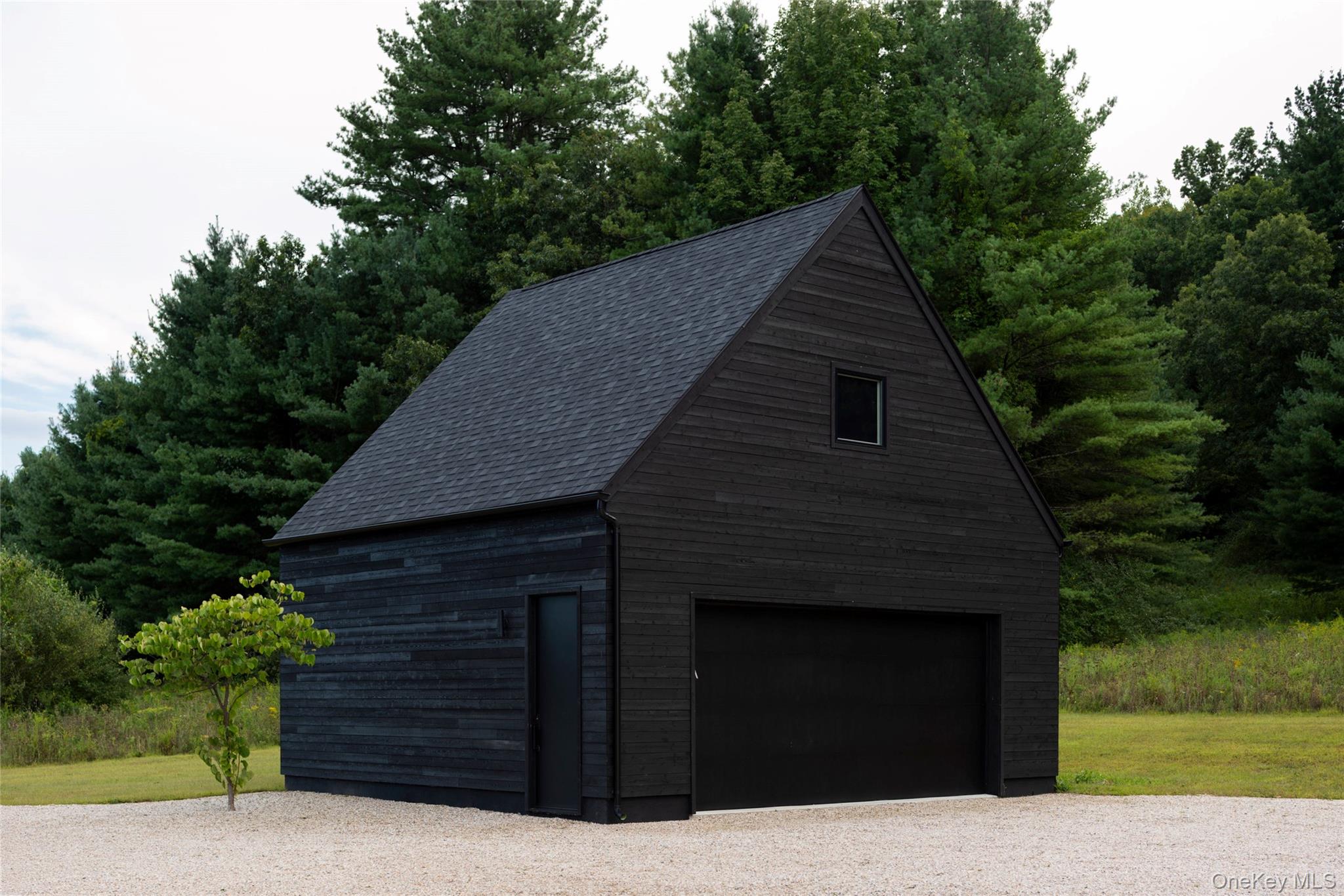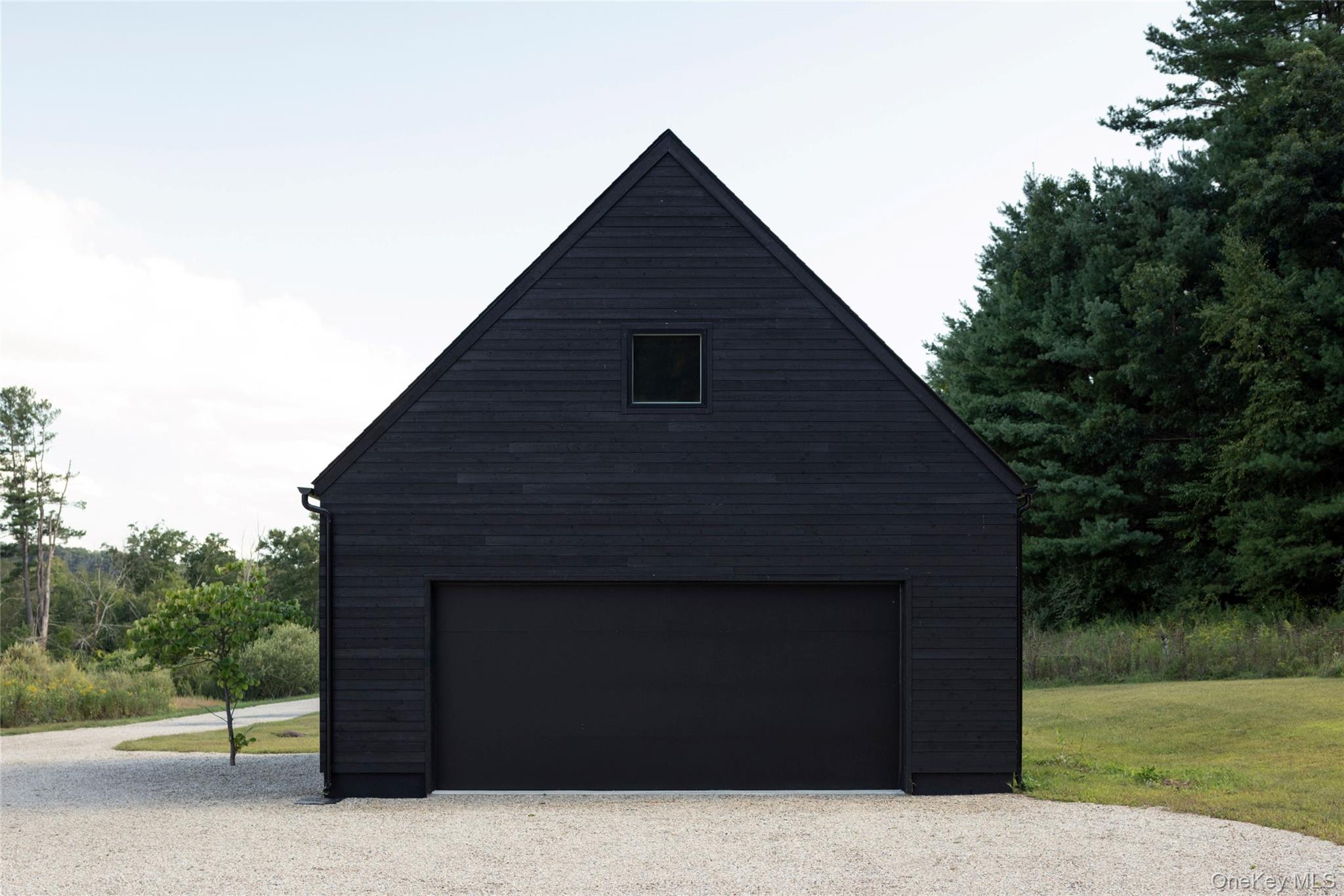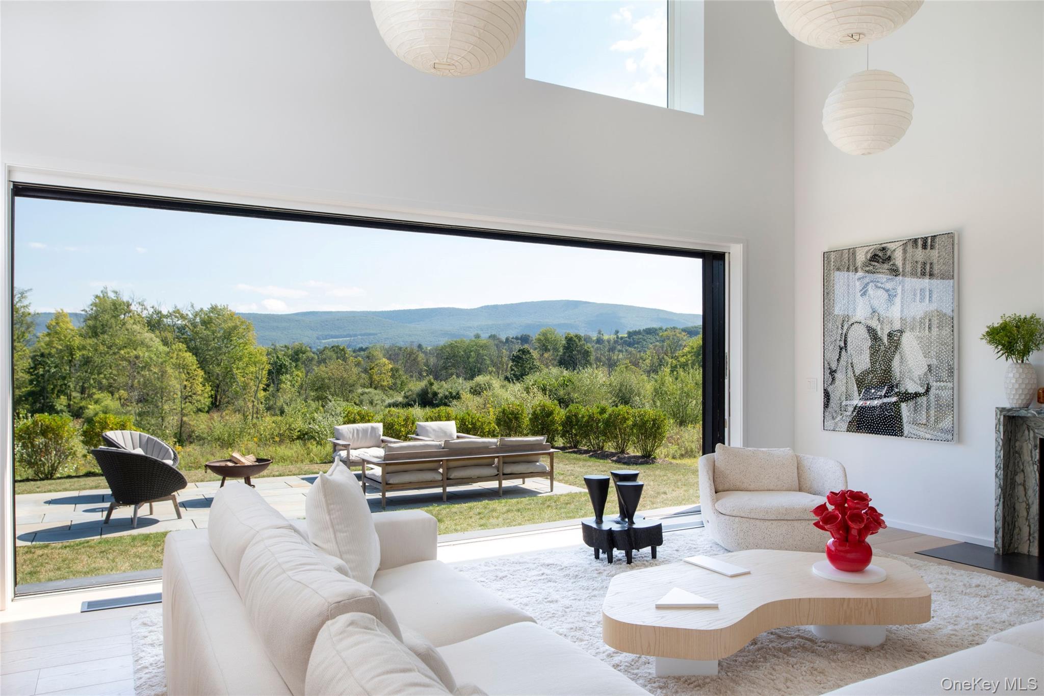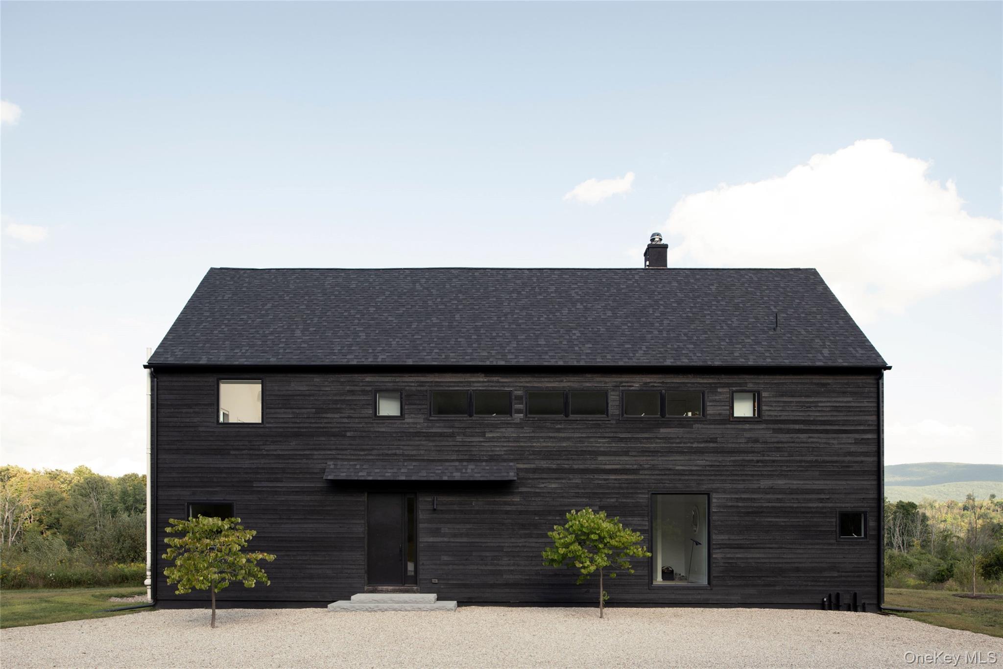 Tucked away in total privacy, this 2023 architectural stunner is set on 34+ acres of rolling landscape with panoramic views of the Taconic Range and the Ro Jan Kill stream flowing through the property, complete with natural swimming holes perfect for warmer months. A picturesque long driveway winds through undulating open fields, setting the stage for the home’s striking architectural presence featured in AD. Clad in Shou Sugi Ban cedar siding, the exterior is both artful and enduring. This 18th-century Japanese preservation method involves charring the wood and sealing it with natural oil, resulting in a richly textured charcoal-black finish that is visually striking and built to last. Inside, the 3, 900 sqft residence offers 3 spacious bedroom suites, 2 with walk-in closets, and each with private full baths. A convenient powder room on the first floor adds thoughtful functionality, complementing the main-level suite’s privacy and flexibility. Upstairs, two additional suites offer elevated views and serene separation. At the heart of the home, a double-height living room features a dramatic wood-burning fireplace and opens directly to the outdoors through a 16-foot-wide retractable glass wall, creating a seamless indoor-outdoor living experience. The adjacent open kitchen is ideal for entertaining or peaceful everyday living, all set against the backdrop of surrounding nature. Since the initial 2023 construction, many new upgrades have been made, such as the finished 900 sqft basement, which includes a den, a second kitchen, and a dedicated space for a home gym, offering versatile room for wellness, hobbies, or guests—all with the same clean, modern design as the rest of the home. A 2-car detached garage sits nearby with unfinished space above, ready to be transformed into a studio, guest suite, or home office. Importantly, the septic system is approved for a fourth bedroom, making expansion both easy and valuable. Ideally located just minutes from Hillsdale, Copake Lake, and Catamount Ski Area, and equidistant from Hudson, NY, and Great Barrington, MA, this property offers unmatched privacy without sacrificing access to culture, dining, and outdoor adventure. Whether enjoying a fire in winter, a swim in the stream during summer, or simply taking in the mountain views, this is a home that celebrates modern architecture, natural materials, and the quiet luxury of space.