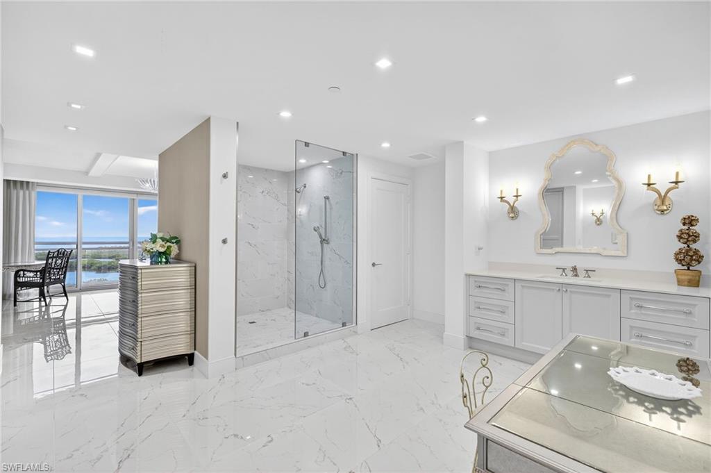Master Suite oasis with spacious bedroom with breathtaking western facing waterfront views, spa-like bathroom featuring oversized walk-in shower, separate vanities, separate water closet and enormous walk-in closet with custom built-ins.