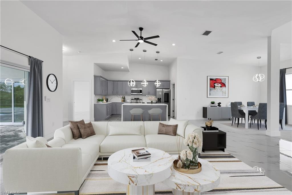 Welcome to effortless luxury in the coveted Royal Palm Golf Estates, nestled within the scenic Eagle Lakes community. This brand-new construction home is exquisitely designed and priced to sell. SELLER IS OFFERING FINANCING TO THE BUYER. Offering refined living with peaceful golf course and water feature views. Spanning a thoughtfully crafted single-story layout, this home features 4 spacious bedrooms, 3 full baths, a private den, and a formal dining room—perfect for elegant entertaining. The gourmet kitchen stuns with quartz countertops, a waterfall-edge island, and a sunny breakfast nook, all open to the inviting living space bathed in sunset light. Step outside to a screened-in lanai ideal for evening relaxation and enjoy the convenience of a 3-car garage with a side-yard access door. Designer finishes throughout elevate this home’s modern charm. Access to a charming clubhouse, onsite restaurant, and the 72-par Eagle Lakes championship golf course—all just minutes from the white sand beaches of Marco Island, upscale shopping and dining on 5th Avenue South, and easy access to Naples and Fort Myers airports. This is resort-style living at its finest.