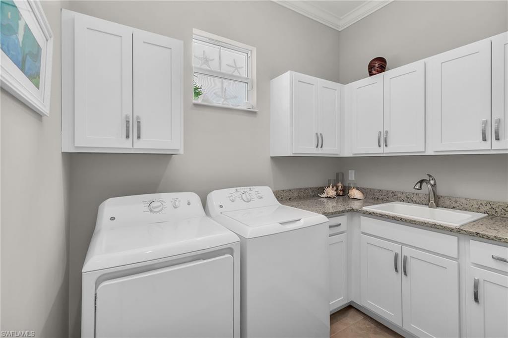 Welcome to this spacious and stunning Stock Custom Home, in the vibrant gated community of Naples Reserve. Go inside this Venice floorplan design and be greeted by the refined elegance of crown molding throughout, accentuating the home's sophisticated features. The expansive great room with 14-foot tray ceiling, neutral toned-tile floors, is bathed in natural sunlight, creating a warm and inviting atmosphere. The gourmet kitchen is a chef's delight, complete with white cabinetry, under-mount lighting, soft-close drawers and doors, and an expansive island adorned with elegant granite counters and a matching backsplash. Sleek KitchenAid stainless steel appliances complete this culinary haven. Enjoy your morning coffee in the cozy breakfast nook and host formal dinners in the adjacent dining room. Retreat to your spacious primary suite, featuring his and her walk-in closets and a luxurious en-suite bath. The split floor plan includes two spacious guest bedrooms that share a second bath and a roomy fourth bedroom presently used as a den. Relax on your expansive lanai with new screening, southerly long lake view, heated salt-water pool, spa and gorgeous summer kitchen. Enjoy peace of mind with impact glass windows and doors, Storm Smart shades, split air conditioner in the THREE-CAR GARAGE, whole-house water filtration system, whole-house surge protection, pool equipment surge protection and Vitex alarm system. Active clubhouse offers an impressive array of amenities and a lively event calendar. Stay fit in the fitness center, play bocce ball or beach volleyball, and unwind at the tiki bar and café. Dive into the resort-style pool with lap lanes or gather around the fire pit. Adventure awaits on the private Kon Tiki island with paddleboards, kayaks and bicycles. Sports enthusiasts will love the tennis and pickleball courts, basketball court, and miles of recreational and biking paths. Pet owners can take advantage of the dog parks, and families will adore the kid’s cove with a tot lot. Conveniently between downtown Naples and Marco Island, this home offers easy access to shopping, entertainment, dining and numerous Gulf beaches. Not in flood zone (Zone X). Don't miss your chance to experience this exceptional lifestyle!