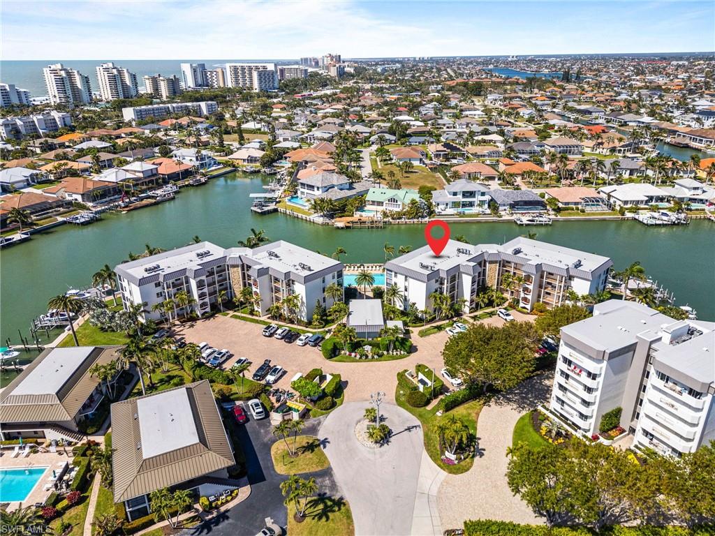 LOCATION, LOCATION, LOCATION!!! This stunning condo captures the essence of island living. Offering a BRIGHT, OPEN and AIRY layout, this 2-bedroom, 2-bathroom END UNIT provides the perfect coastal retreat. Enjoy peaceful water and pool views from your PRIVATE PATIO, while taking full advantage of all that Breezy Point Condominiums has to offer. For BOATING ENTHUSIASTS, this condo features a PRIVATE 35' DEEDED BOAT DOCK with a 14, 000lb lift, and offers QUICK, DIRECT boating access to the Gulf . Just a SHORT WALK to Marco Island's pristine white-sand BEACHES and restaurant, bar and grill, with fine dining and shopping just a short drive away, making this island LOCATION EXCEPTIONAL. The GOURMET KITCHEN has been beautifully updated with QUARTZ countertops, spacious breakfast bar, Cafe series refrigerator with built-in K-cup coffee maker, CUSTOM CABINETRY, a sleek glass tile backsplash, UNDER CABINET LIGHTING, and soft-close drawers. The OPEN LIVING area is perfect for hosting, with pocketing double-IMPACT SLIDING doors that lead to private patio, providing effortless access to the POOL, DOCKS and WATERFRONT. The MASTER SUITE offers breathtaking views, private slider to the patio, and a SPA LIKE BATH featuring quartz counter top DUAL VANITY, walk-in tiled shower with rain showerhead and spacious WALK IN CLOSET. The guest bedroom is generously sized with CUSTOM SHELVING, and guest bath featuring QUARTZ countertops and CUSTOM TILE. Breezy Point residents enjoy recent upgrades such as a newly ILLUMINATED seawall, four PARTY DOCKS, a fully renovated clubhouse and pool. Brick paver walkways leading to the shared amenities, including a grill area for residents, picturesque BAY and INTERSECTING CANAL VIEWS, complemented by TROPICAL landscaping throughout. The sparkling pool and deck provides a perfect space for RELAXATION and ENJOYMENT. Additional updates include a new metal roof, exterior paint, re-screened and framed patios. Perfectly located just TWO BLOCKS FROM BEACH entrance and only 10 minutes to open water by boat. Close to restaurants, shopping, and all the island has to offer. THIS IS A MUST SEE!!!