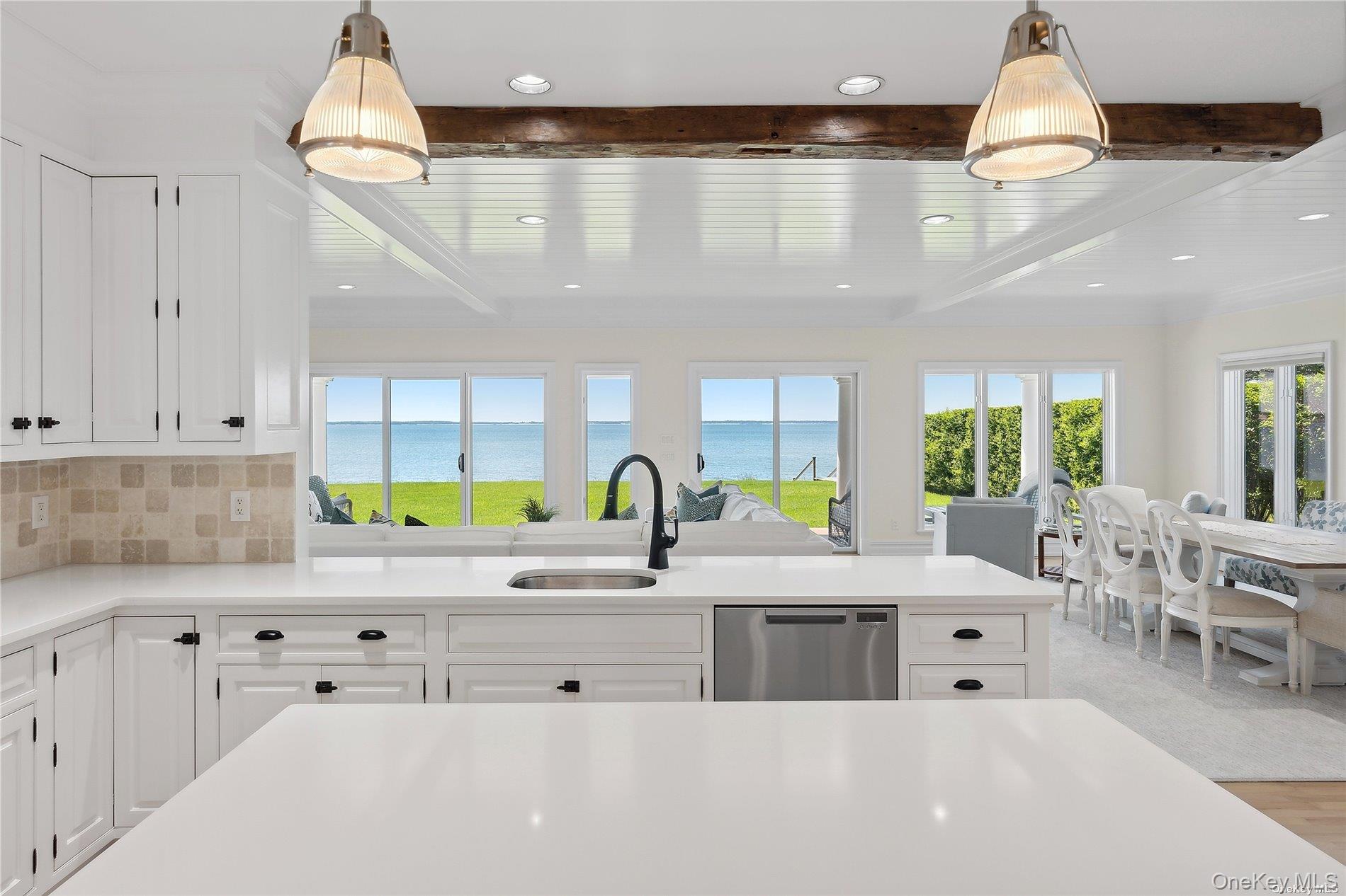 Welcome to a unique luxury waterfront estate, perfectly situated overlooking the Peconic Bay, with stunning views of Robin's Island and the Hamptons. With over 100 feet of sandy beach and surf, this custom-built residence features a guest house on the property, a lower-level waterside sun deck, and a covered mahogany porch. It's an ideal spot for early sunrises, enjoying the bay breeze, or admiring the beautifully landscaped lawn leading to the water's edge. The main house boasts premium finishes, fixtures, and detailed woodwork throughout. The open floor plan offers both elegance and comfort, flooded with natural light. New coffered ceilings, accented by reclaimed wood beams, provide architectural detail. The living room and formal dining room are anchored by a gas fireplace, which features built-in shelving and seating designed to maximize water views. The home is professionally decorated in a style that embodies a coastal lifestyle. The gourmet kitchen is equipped with high-end appliances, pearl white quartz countertops, custom cabinetry, a walk-in pantry, and a center island accented by a decorative reclaimed wood ceiling that defines the space. The main floor primary suite offers spectacular water views and private porch access. Its spa-inspired bathroom features double sinks, a soaking tub, and a beautifully tiled shower with bench seating. The suite also includes ample storage and a walk-in closet. Upstairs, you'll find two beautifully appointed bedrooms, a full bath, a bonus room, and two additional finished spaces suitable for storage or to be transformed into a gym, office, or recreation room. The guest house is also tastefully designed and well-equipped. It includes a retro eat-in kitchen, two charming bedrooms, a spacious living room with a wood-burning fireplace, quaint wood floors, a full bath, and on-site laundry. The outdoor bluestone patio is surrounded by lush greenery, creating a lovely ambiance for entertaining and al fresco dining. The property features mature, manicured landscaping and ample space for a water-facing pool or tennis court. Experience all that the North Fork and East End have to offer, conveniently located near the charming Love Lane, known for its delightful shopping and restaurant options, vineyards, and farm stands.