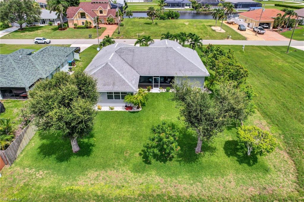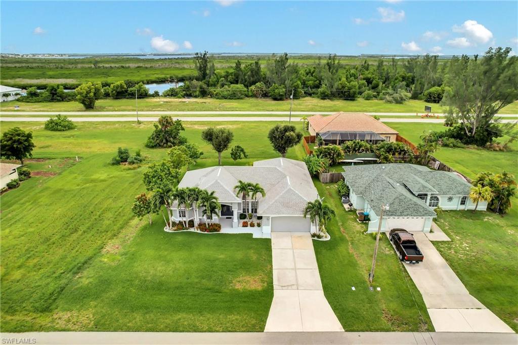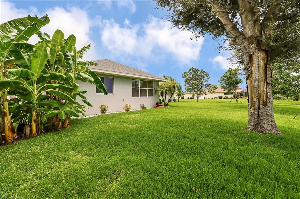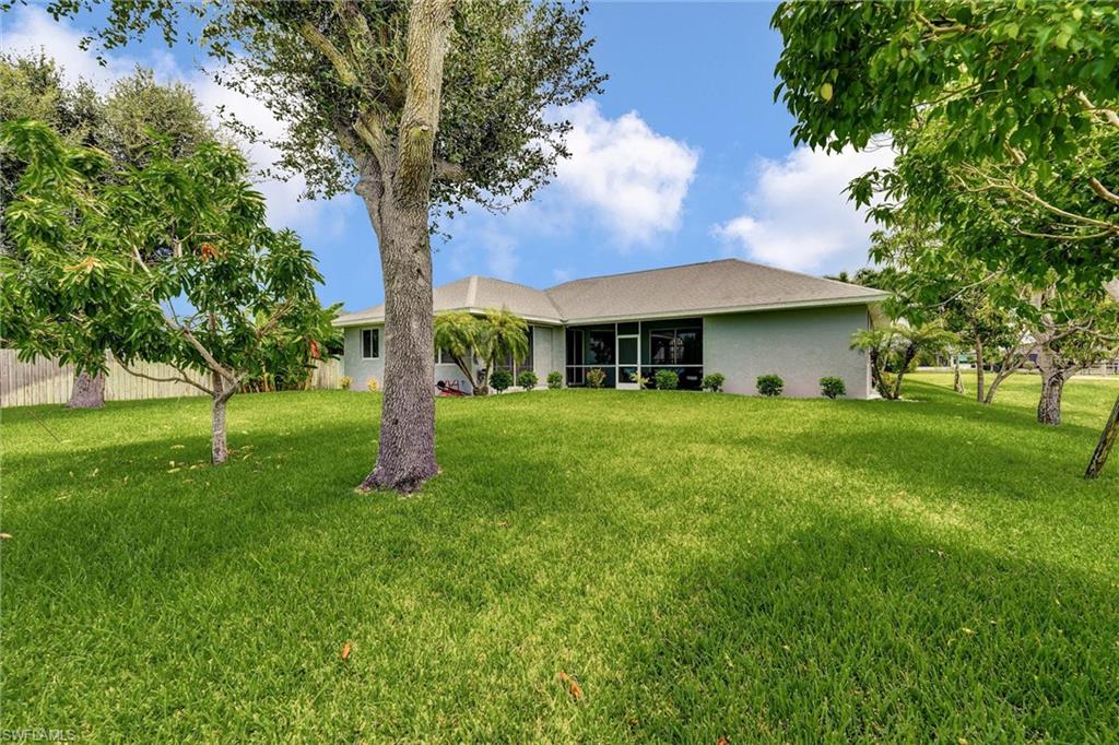 Welcome to this stunning 3-bedroom, plus den, custom-built home in Cape Coral's highly sought-after Burnt Store Road corridor, featuring 2, 096 sqft of spacious living space. The owner's suite boasts luxurious features, including high cathedral ceilings, double walk-in closets, a relaxing soaker tub, a separate shower, and a stylish dual sink vanity. The impressive open-concept living space features a modern kitchen with breakfast bar seating and spotless Corian countertops, complemented by top-grade stainless steel appliances. The home also showcases wood flooring and tile throughout, ceiling fans for optimal airflow, a separate laundry room with ample cabinets, and an enclosed lanai for relaxation and enjoying the beautiful Florida sunshine. Situated on a spacious 0. 23-acre lot with mature fruit trees, including bananas, mangos, and avocados, and extra room for a pool. Recent upgrades include a new roof (2019), A/C (2022), water heater (2022), exterior paint, irrigation system, and hurricane storm shutters. Notably, the city utilities water conversion has been completed. Located in an area with long-term demand and no HOA, this property benefits from exciting development prospects from the 7 Island project, nearby restaurants, shopping, walkable parks, boat ramps, excellent fishing spots, and access to open Gulf Coast waters. Enjoy easy access to neighboring cities like Punta Gorda and Matlacha, or take day trips to Sarasota, Tampa, and Orlando. With new infrastructure development underway and growing demand, this property presents a savvy investment opportunity for buyers looking to capitalize before prices rise. Plus, the home is available for purchase with negotiable furnishings or vacant, making it an attractive option for those seeking a seamless transition.