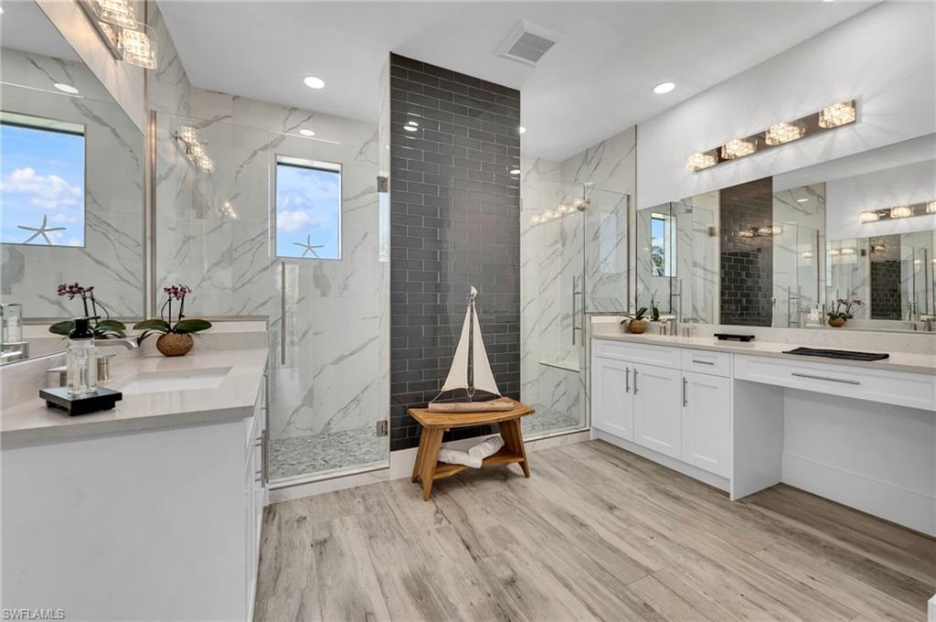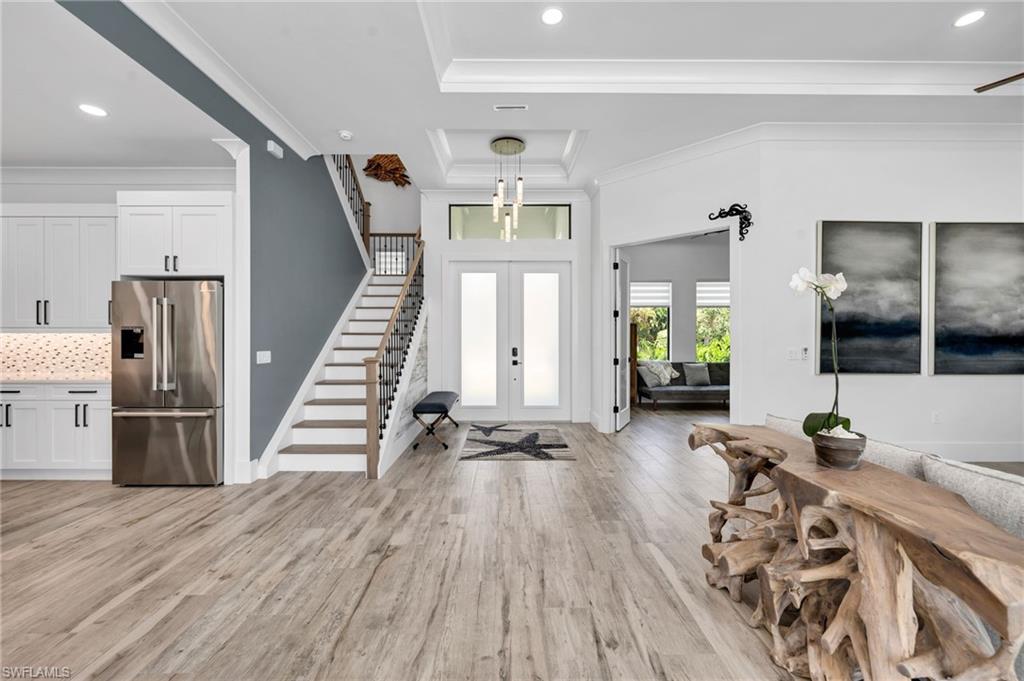 Inside, light-filled living spaces are framed by soaring ceilings, expansive impact-rated glass, and panoramic canal views. Designer wood-plank tile, sleek linear air vents, quartz countertops, and custom lighting reflect the attention to detail found throughout. The chef’s kitchen impresses with custom cabinetry, luxury appliances, and generous prep space, while multiple gathering areas make the home ideal for both intimate living and large-scale entertaining.