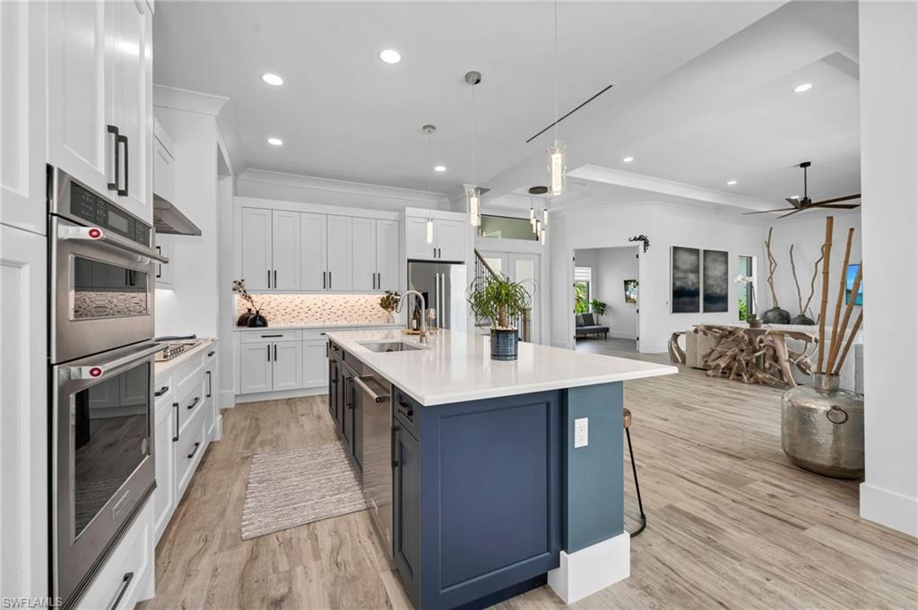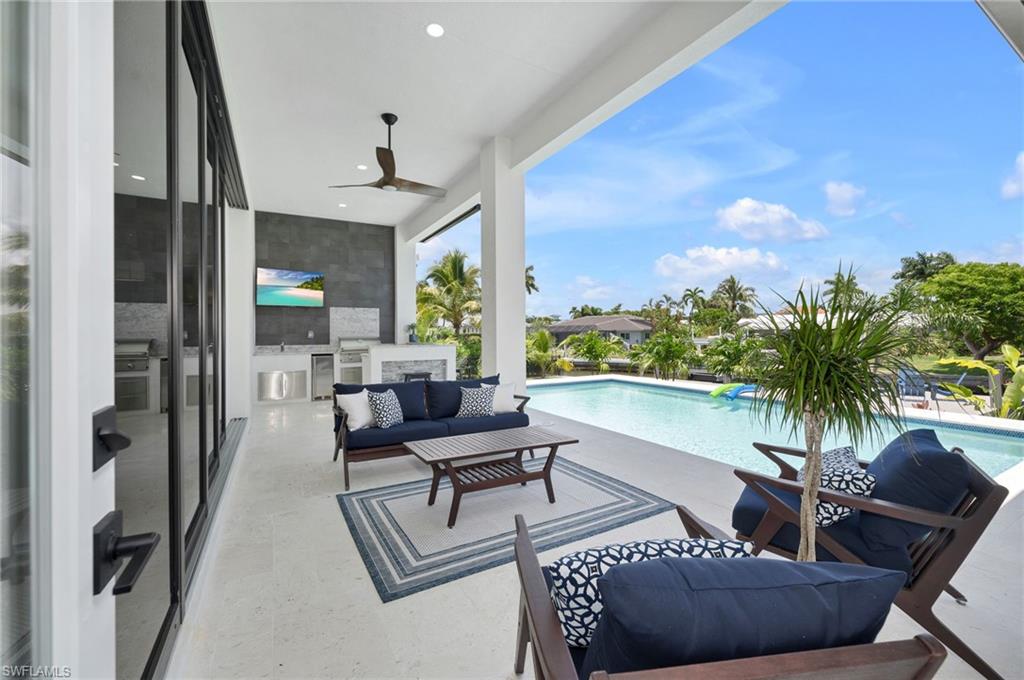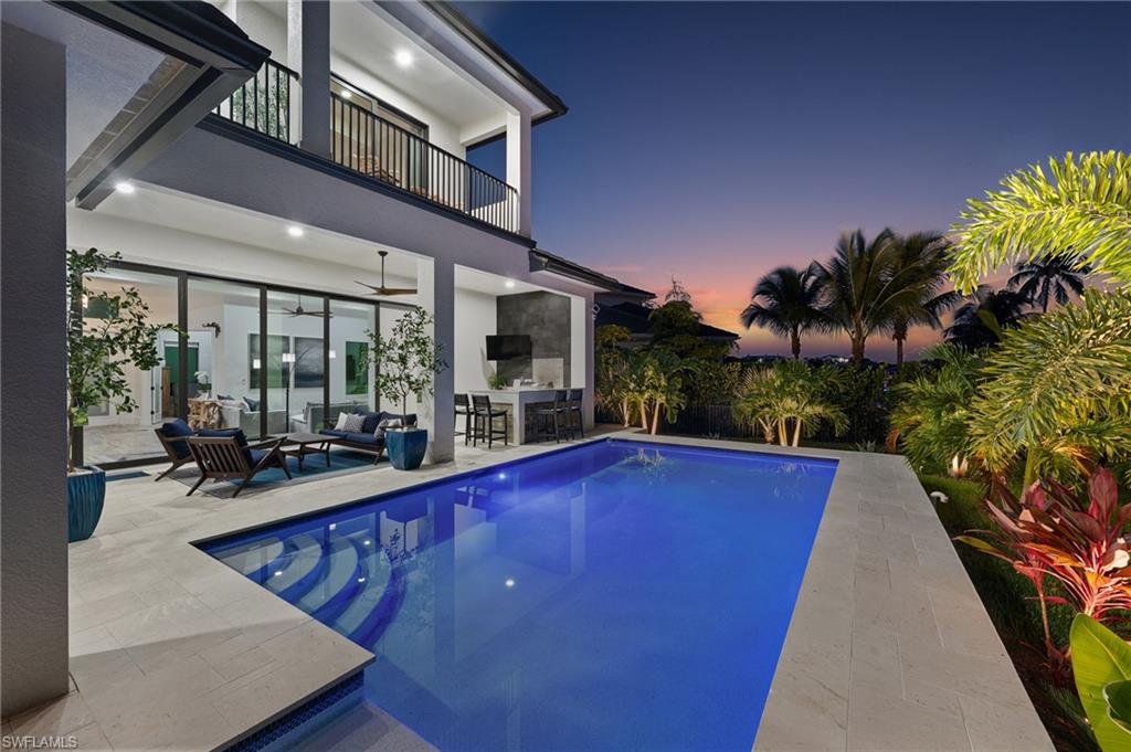 Outdoor living is at the heart of this property. The expansive lanai with a heated pool and sun shelf is surrounded by lush landscaping and enhanced by an outdoor kitchen and bar that rivals five-star resorts—featuring bar seating for six, a built-in AOG grill, Blaze refrigerator, Marvel ice maker with filtered water, and full sink. Evenings are unforgettable with professionally designed landscape lighting that transforms both the front and backyard into a warm, tropical oasis.