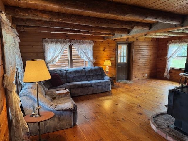 This is a very well maintained gambrel style log home with a matching 2 car garage addition with open second floor and breezeway between. 28 acres of rolling mixed woods, several open acres along the ridge where the home is, a beautiful pond, and a large open sided pole barn to vehicle and equipment storage. Craftsbury Outdoor Center trail is on the property and also across the road. The home is a lovely log home with exposed ceiling beams on the first floor. Pine floors with a very large living room w/ brick hearth and wood stove, 3/4 bath, attractive kitchen with new counters. dining room, and a full front porch. 2nd floor has a full bath at the top of the stairs with master bedroom and large closets to the left and a second large bedroom to the right with large closets. Thick pine floors grace this level. There is a full walkout basement w/ painted/sealed concrete floor and walls, oil/wood combination hot air furnace, and laundry. Could offer many possibilities for workout space, office, workshop. 2 story garage has concrete floor, and stairs to the open second floor. Endless possibilities there. Next is the very large 3 bay open sided pole barn currently housing equipment. The land is mostly wooded with a mix or hard and softwood. The home offers complete privacy, easterly views, Craftsbury Outdoor Center xc ski trails, Great Hosmer across the road with access just down the road. A heavenly spot.