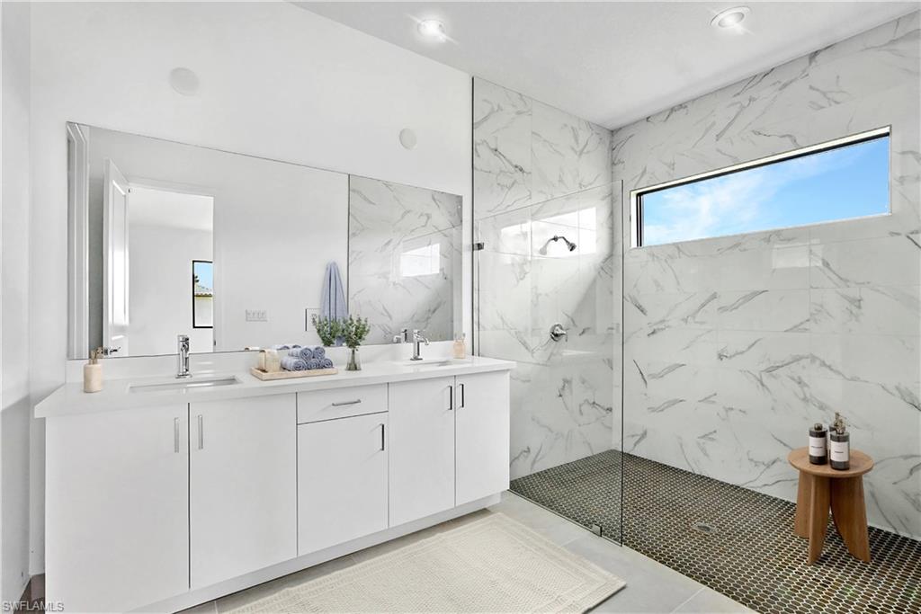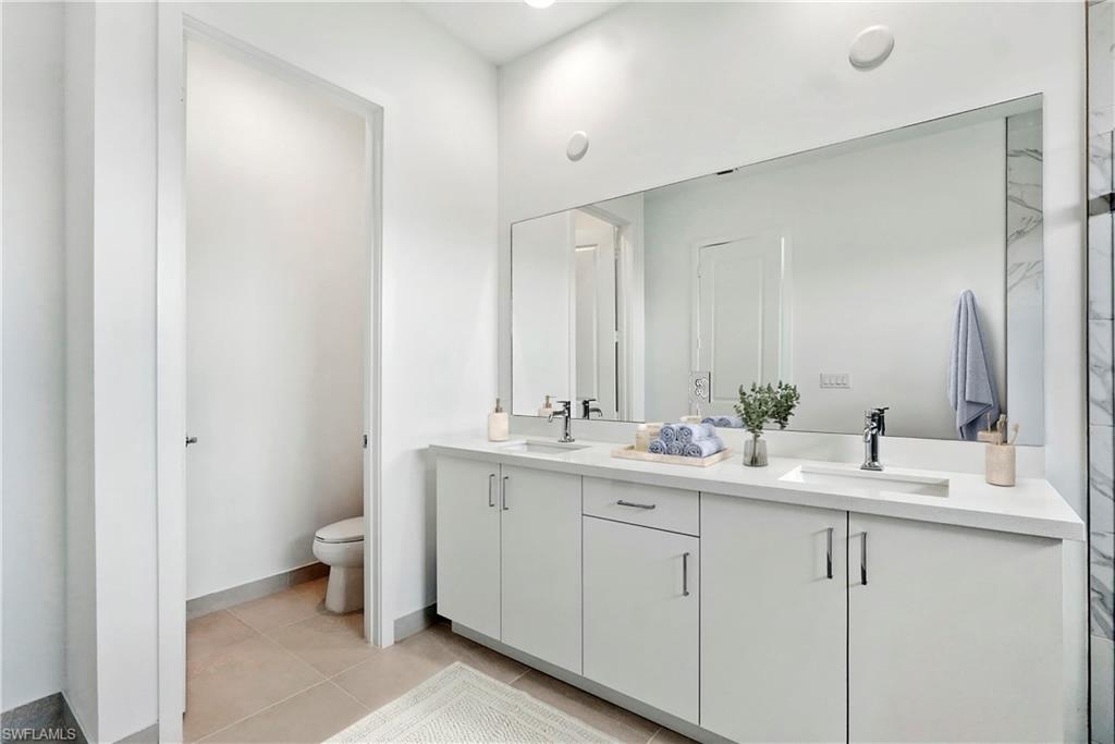 The owner’s suite and baths are equally elevated, huge walk in closets with upgraded cabinets in the master bath, quartz counters in all baths, upgraded tile selections in the master and secondary baths, plus a shower in lieu of a tub in Bath #2.