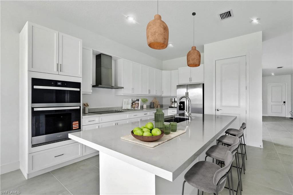 The chef’s kitchen showcases the premium stainless steel appliance package with exterior ventilation, stainless steel hood, cooktop, and micro/oven tower. Upgraded Level 3 cabinets include a deep cabinet and tall refrigerator enclosure panel, balanced lighting, and stunning Level 4 quartz counters with a squared edge. Undermount sinks are included in the kitchen and all bathrooms.