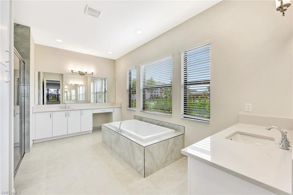 New construction available for Immediate Occupancy! This "Biscayne" home with Lake Views offers Impact Resistant Windows throughout and has 3 Bedrooms plus 4 Baths, and a 2-Car Garage, an open kitchen with stainless steel GE Appliances and Quartz Countertops. The master bedroom offers a coffered ceiling and spacious closets. Other features include: Glass Entry Door, Wood Flooring in Main areas, extended width of driveway, Stub Out for Summer Kitchen and more! RiverCreek is Estero’s hottest new gated community and features numerous amenities for everyone including a 12, 000 square foot Clubhouse with Resort–style pool, event room, fitness center, indoor sports court, tennis, pickleball, basketball and more!