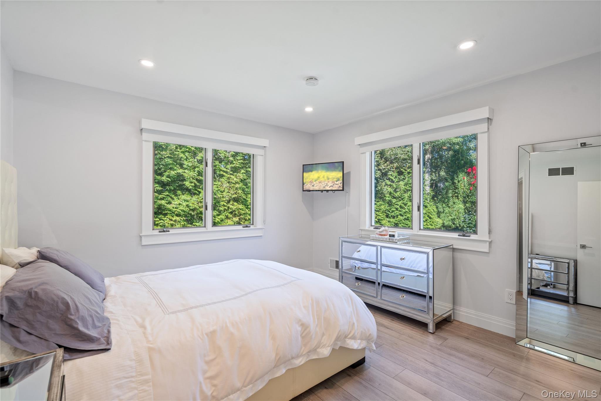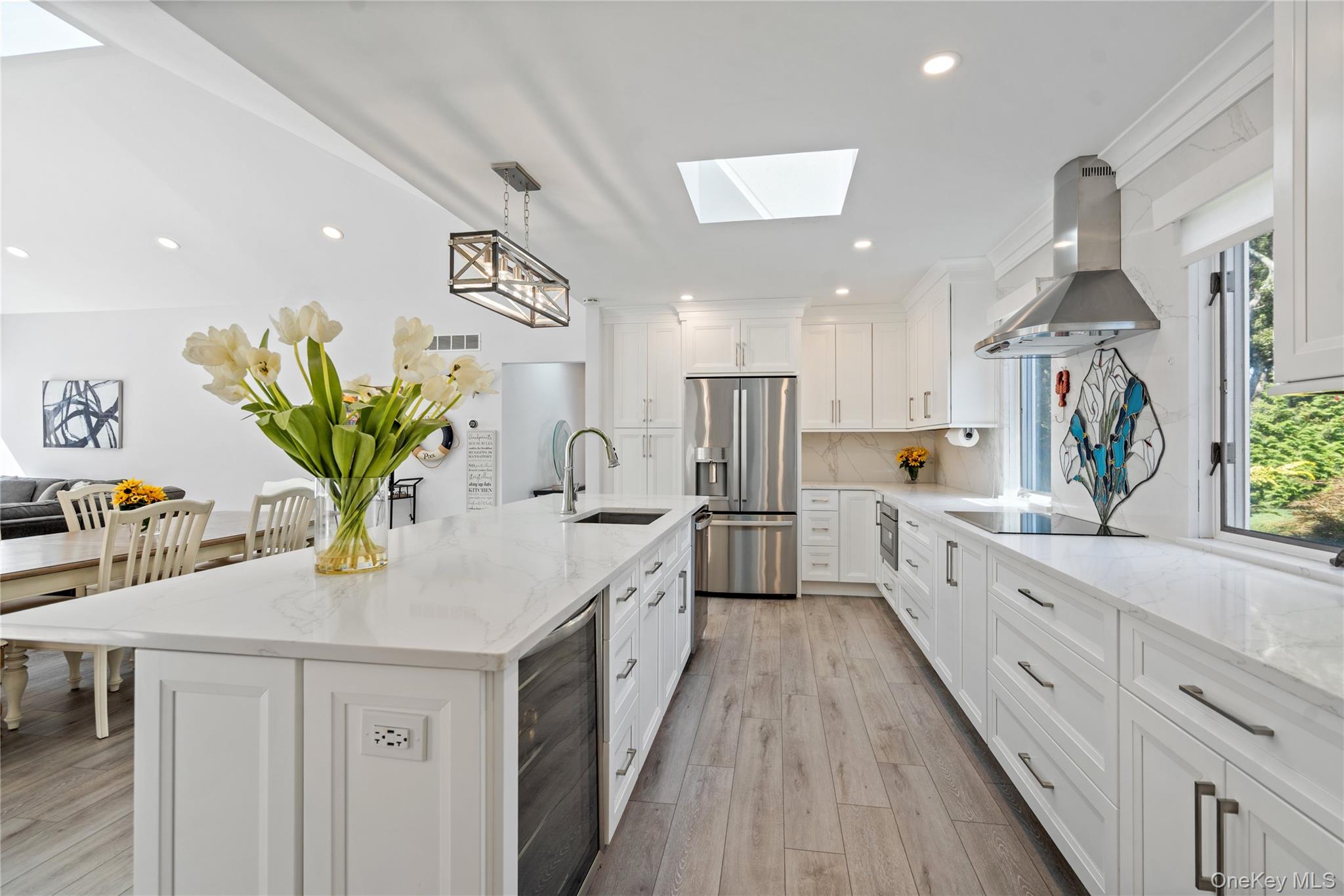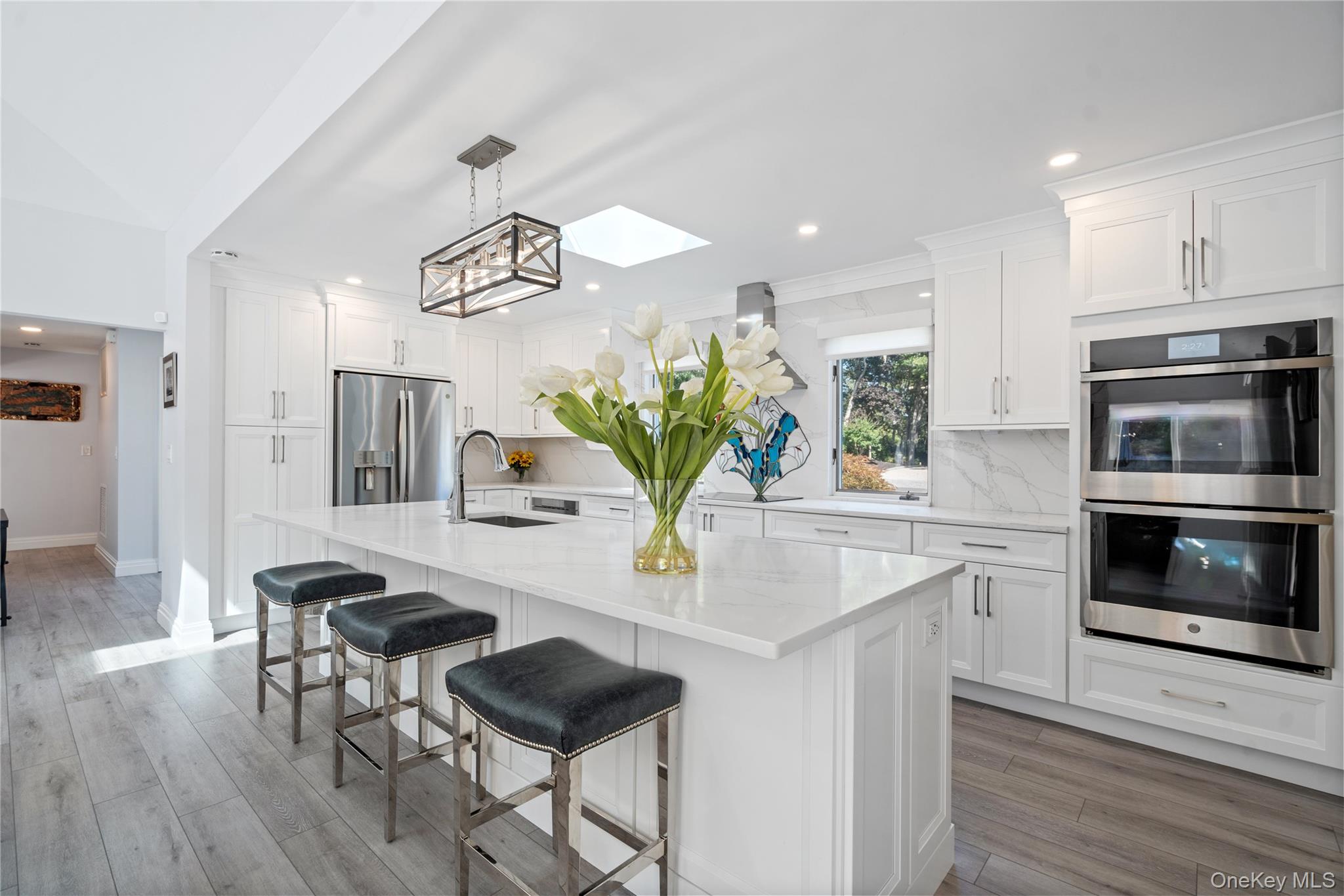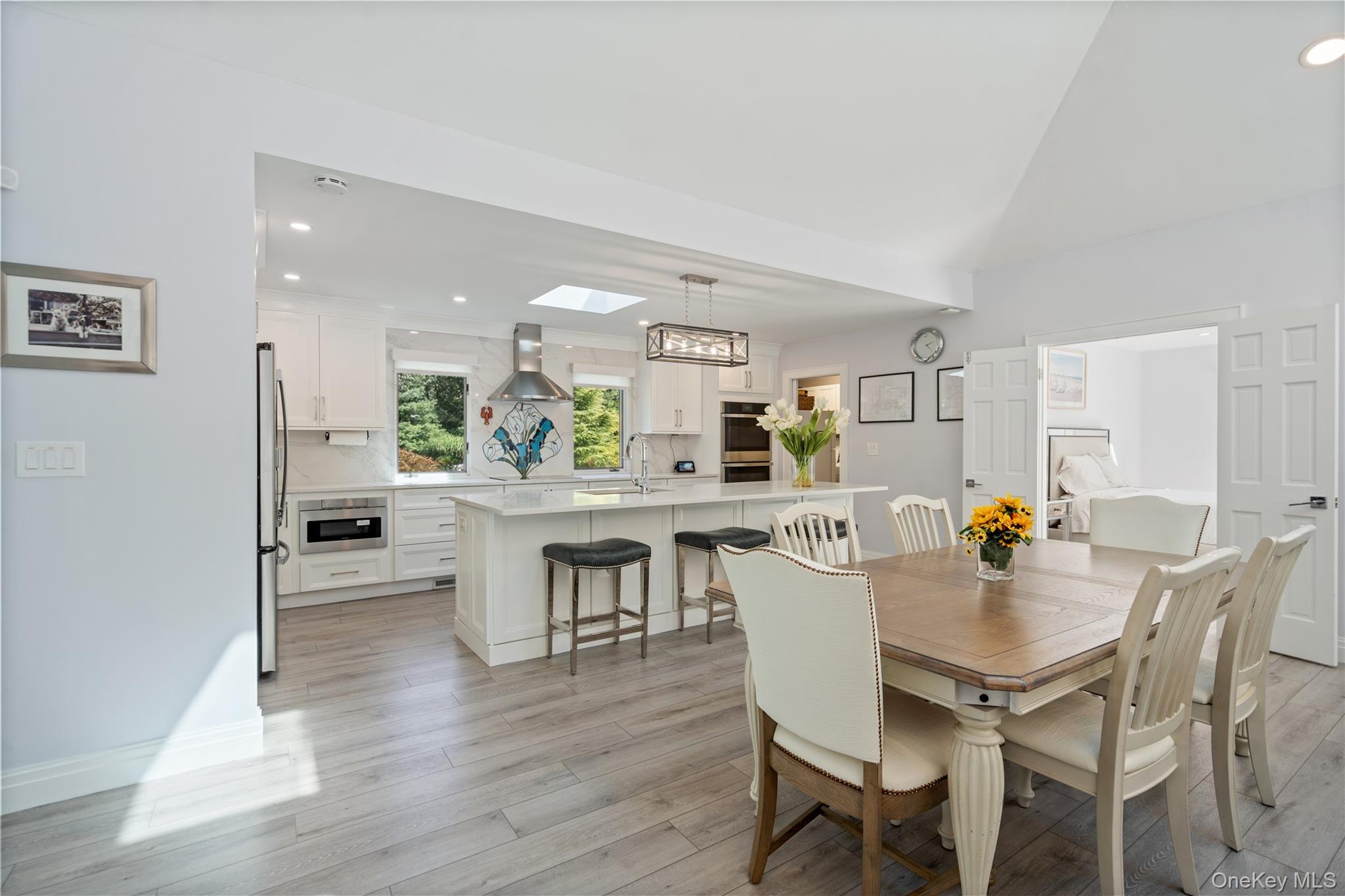 Set on immaculately landscaped grounds, this beautifully appointed contemporary home exudes an idyllic coastal lifestyle, seamlessly blending indoor and outdoor living with elegance and comfort. The open concept living space is vast and offers a spacious and newly renovated island kitchen equipped with Quartz countertops, ample cabinetry and stainless-steel appliances for the culinary enthusiast. The dining and living areas feature vaulted ceilings, a wood burning fireplace and sliding glass doors bringing in an abundance of natural light and providing easy rear yard access. Off the living room, an oversized guest bedroom boasts large windows and sliding glass doors inviting the lush greenery in. On the opposite wing, the expansive primary bedroom boasts a newly renovated en-suite bath, a large walk-in closet as well as direct pool access. Off the hall there are two additional generously sized bedrooms, a third fully renovated full bath and additional storage. Outdoors, the fully fenced yard is a private oasis. Relax in the new heated in-ground pool, dine al-fresco or entertain on the expansive deck. Mature and manicured landscaping surrounds the property creating a secluded and serene atmosphere. Other amenities include solar panels, a full-service mud/laundry room, an attached one-car garage and a full basement. This home is conveniently located just a short drive to some of the most beautiful ocean and bay beaches, sought after waterfront restaurants and is centrally located to both Southampton and Westhampton Beach Villages. A must see!
