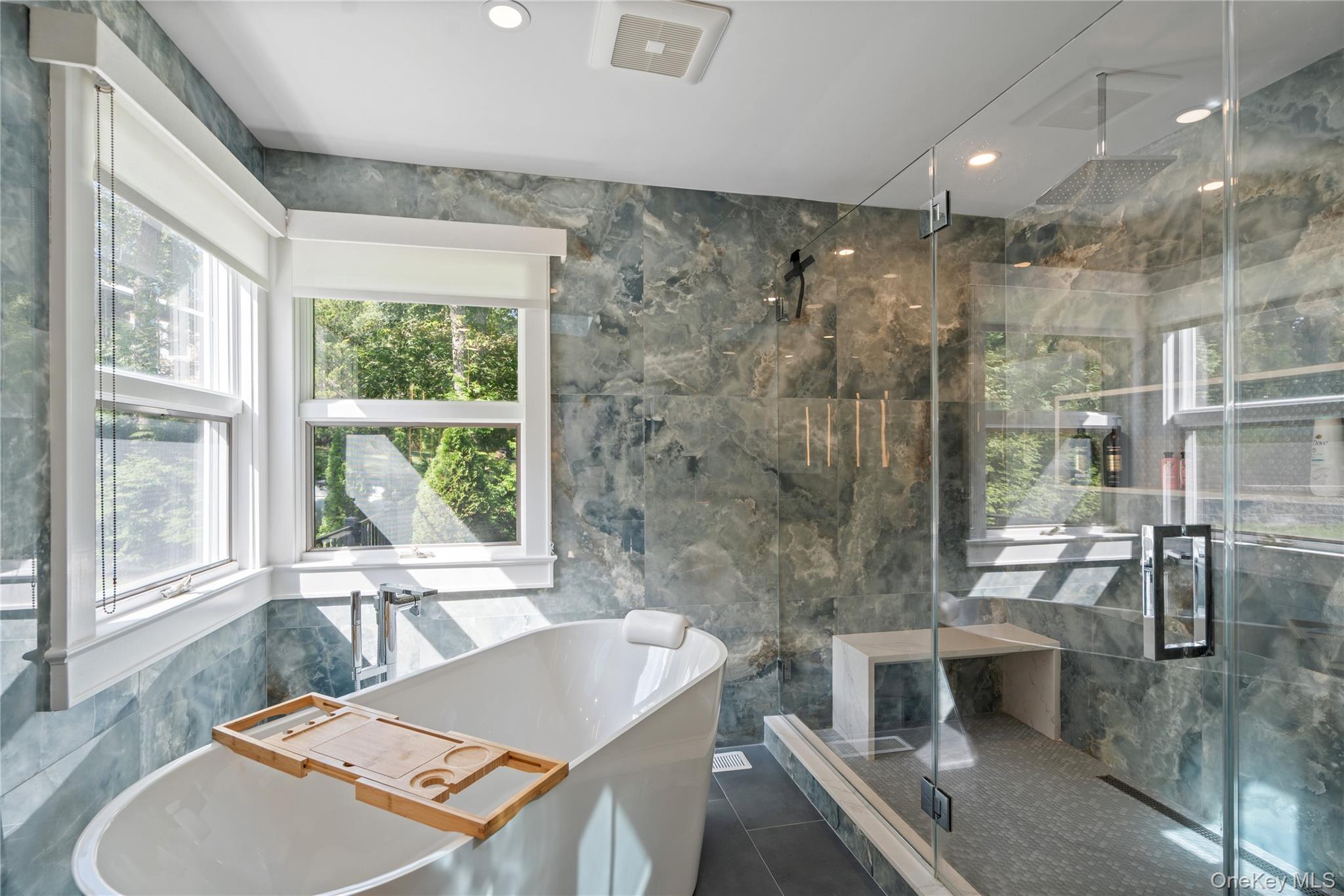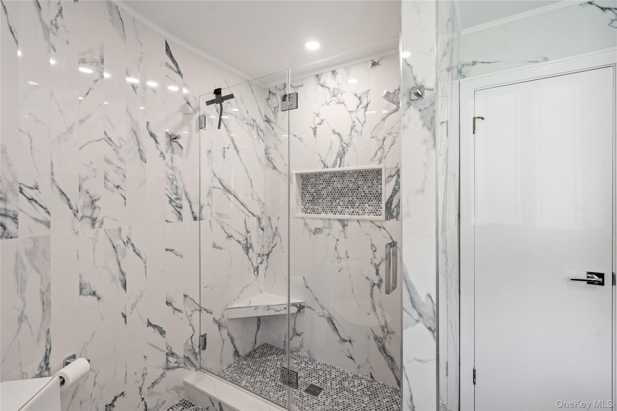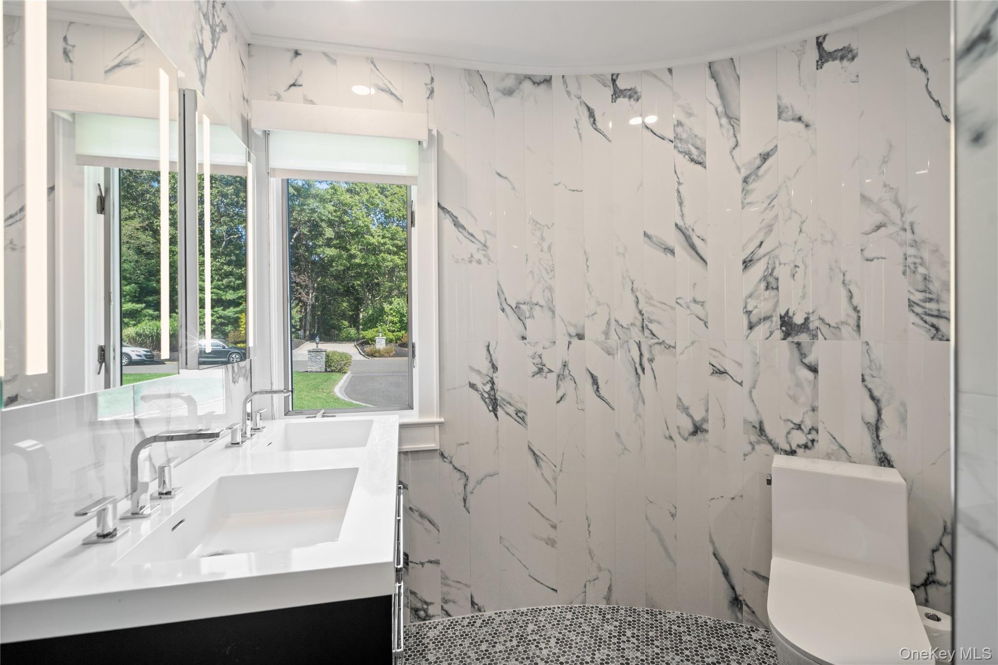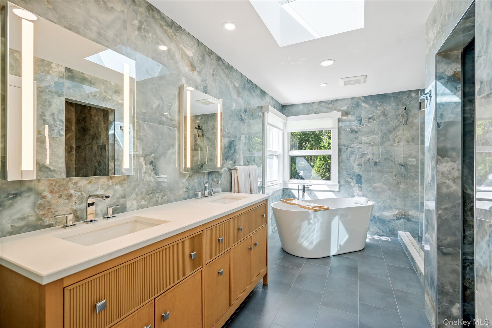 Set on immaculately landscaped grounds, this beautifully appointed contemporary home exudes an idyllic coastal lifestyle, seamlessly blending indoor and outdoor living with elegance and comfort. The open concept living space is vast and offers a spacious and newly renovated island kitchen equipped with Quartz countertops, ample cabinetry and stainless-steel appliances for the culinary enthusiast. The dining and living areas feature vaulted ceilings, a wood burning fireplace and sliding glass doors bringing in an abundance of natural light and providing easy rear yard access. Off the living room, an oversized guest bedroom boasts large windows and sliding glass doors inviting the lush greenery in. On the opposite wing, the expansive primary bedroom boasts a newly renovated en-suite bath, a large walk-in closet as well as direct pool access. Off the hall there are two additional generously sized bedrooms, a third fully renovated full bath and additional storage. Outdoors, the fully fenced yard is a private oasis. Relax in the new heated in-ground pool, dine al-fresco or entertain on the expansive deck. Mature and manicured landscaping surrounds the property creating a secluded and serene atmosphere. Other amenities include solar panels, a full-service mud/laundry room, an attached one-car garage and a full basement. This home is conveniently located just a short drive to some of the most beautiful ocean and bay beaches, sought after waterfront restaurants and is centrally located to both Southampton and Westhampton Beach Villages. A must see!