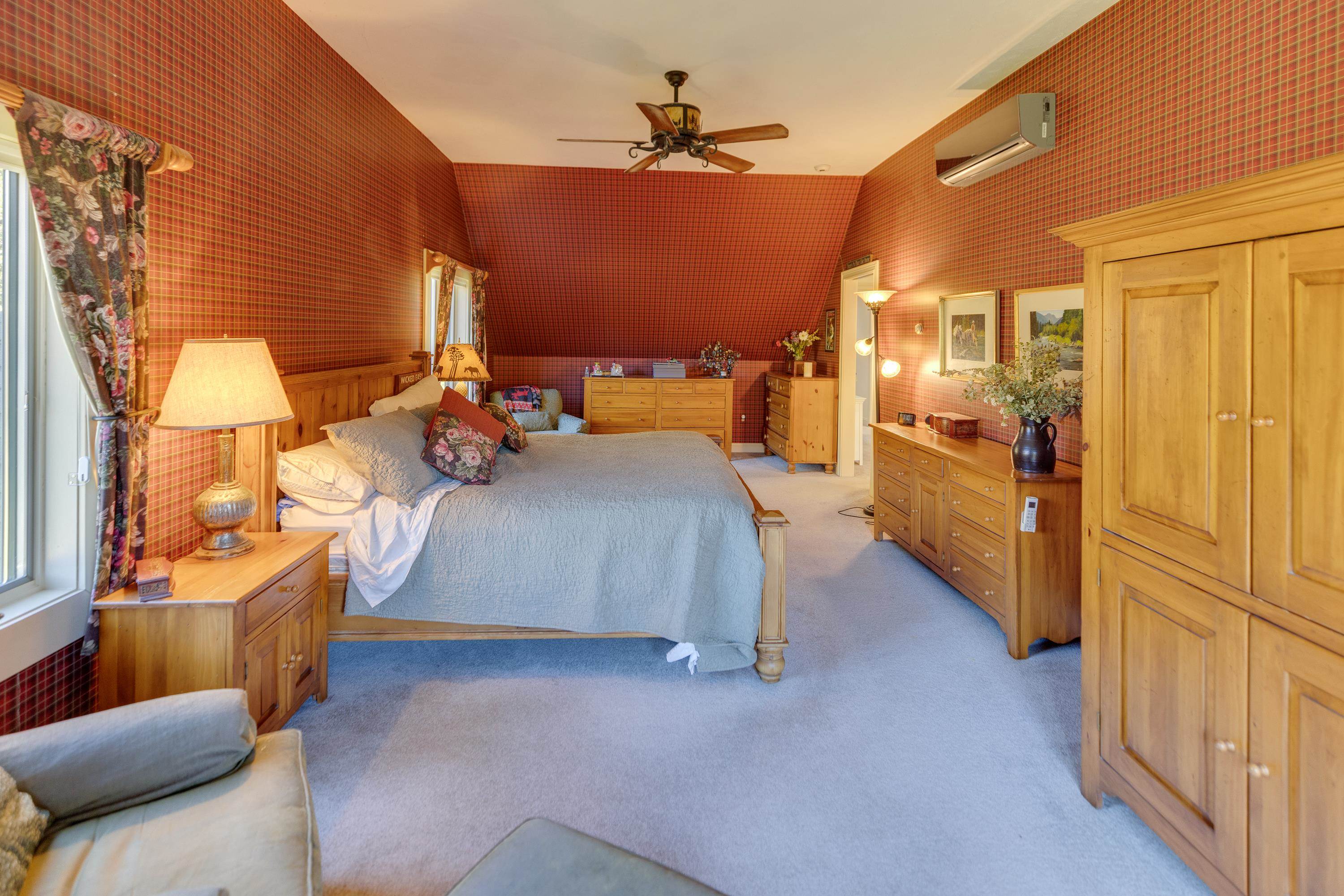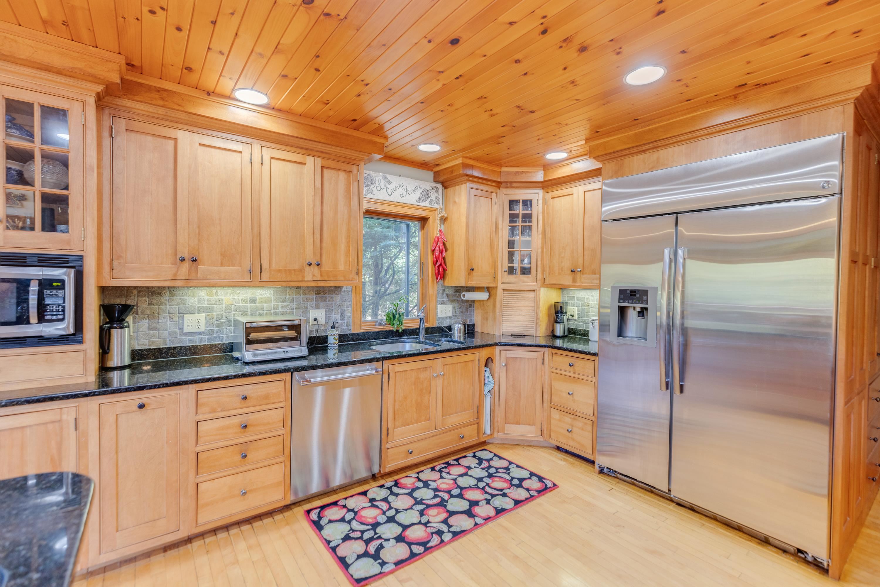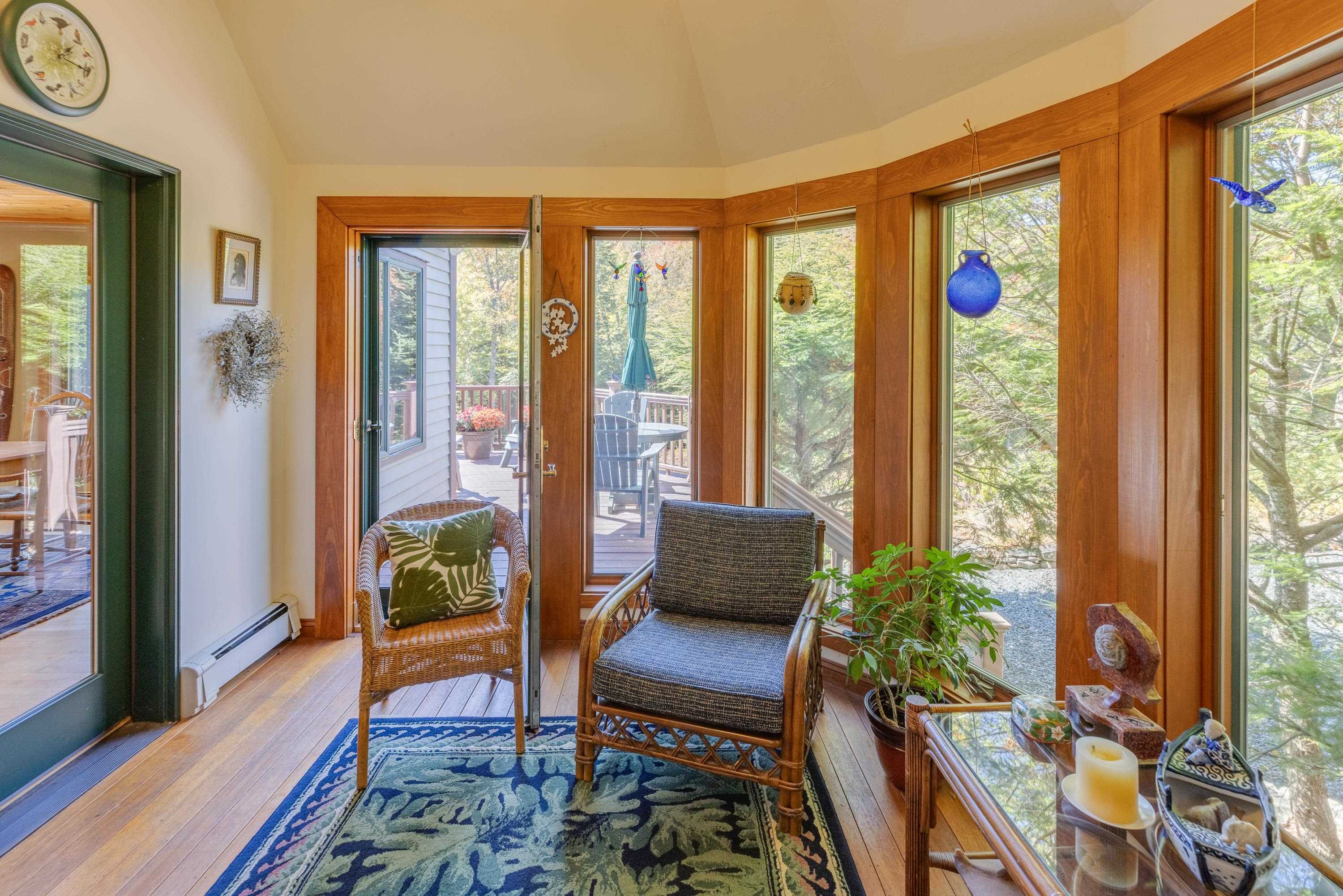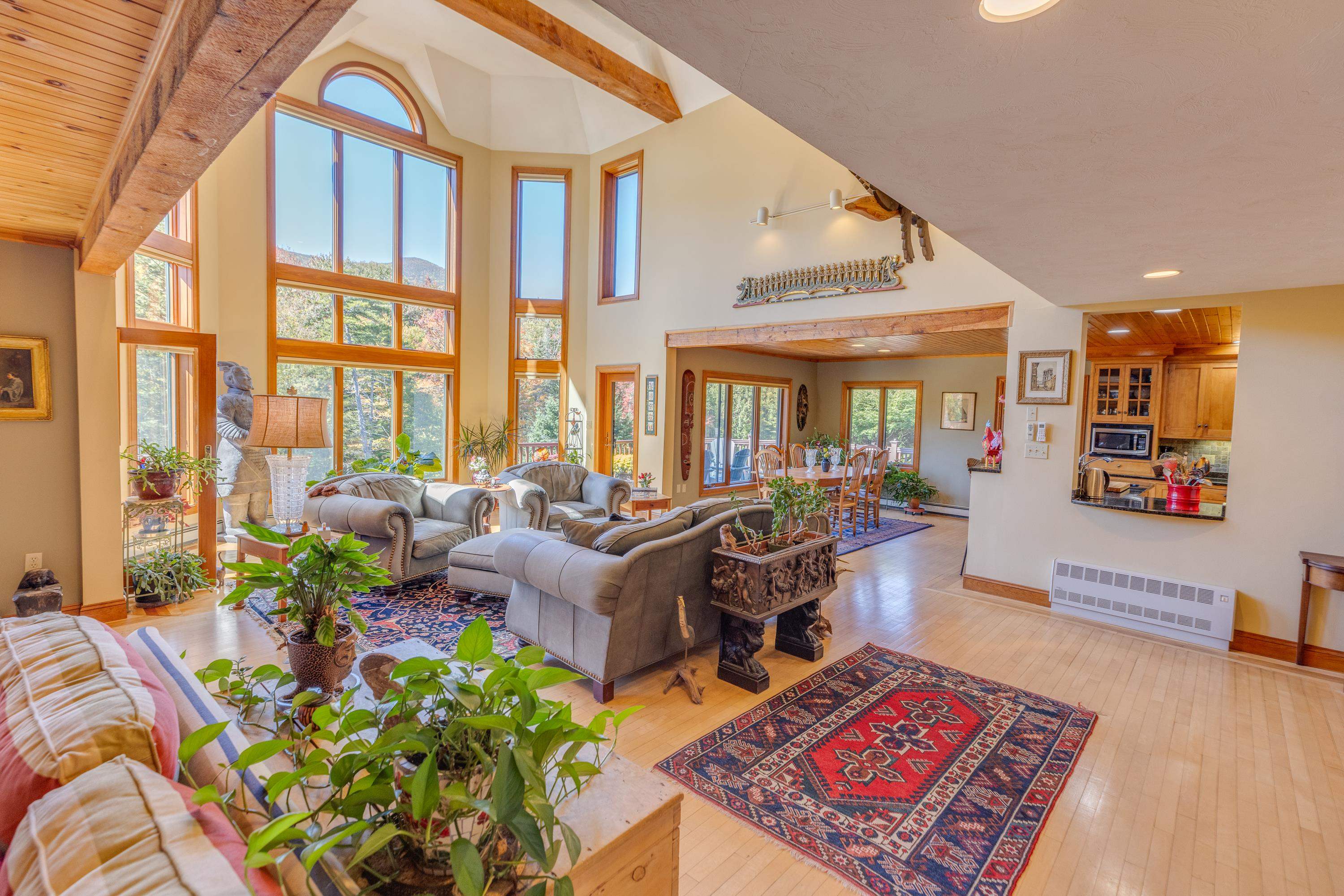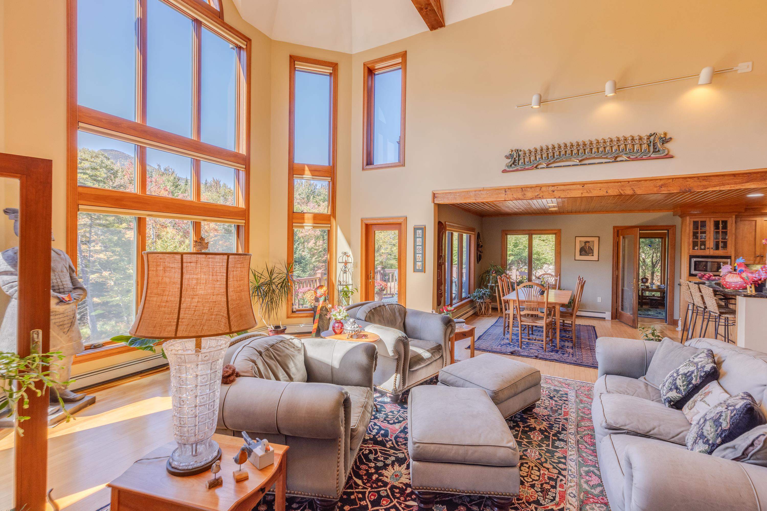 What an incredible setting and home in Waterville Valley! Privately tucked along on West Branch Road, this property has it all… beautiful mountain views, Mad River frontage, a large shared meadow, stunning terraced perennial gardens with irrigation and much more. Enter through the formal entry with a heated walkway or through the attached 2-car garage to find a bright and open layout with soaring cathedral ceilings and floor-to-ceiling windows that capture the scenery. Warm up by the oversized fireplace while enjoying the view! Just off the living room is a beautiful kitchen with granite counters, custom cabinetry, stylish lighting and fixtures, hidden pantry, and more. The 4-season sunroom is fully heated and can be used year-round. Head upstairs to a spacious primary suite with gorgeous ski slope and Mt. Osceola views—drift off to sleep with the sound of the Mad River nearby. The suite includes a double vanity, jetted tub, tile and glass shower, large closets, and a huge office or gym space. Another full bedroom suite with equitable views and a private veranda completes the second floor. The lower level is a perfect place to spread out, relax, and have fun—play pool, darts, ping-pong, or watch a movie in the great room. Three more large bedrooms, laundry, and utility room finish the lower level. The meadow is like having your own private riverside campground! Bus service to the ski mountain, immediate XC/hiking trail access, views, riverfront. . . this home checks every box!