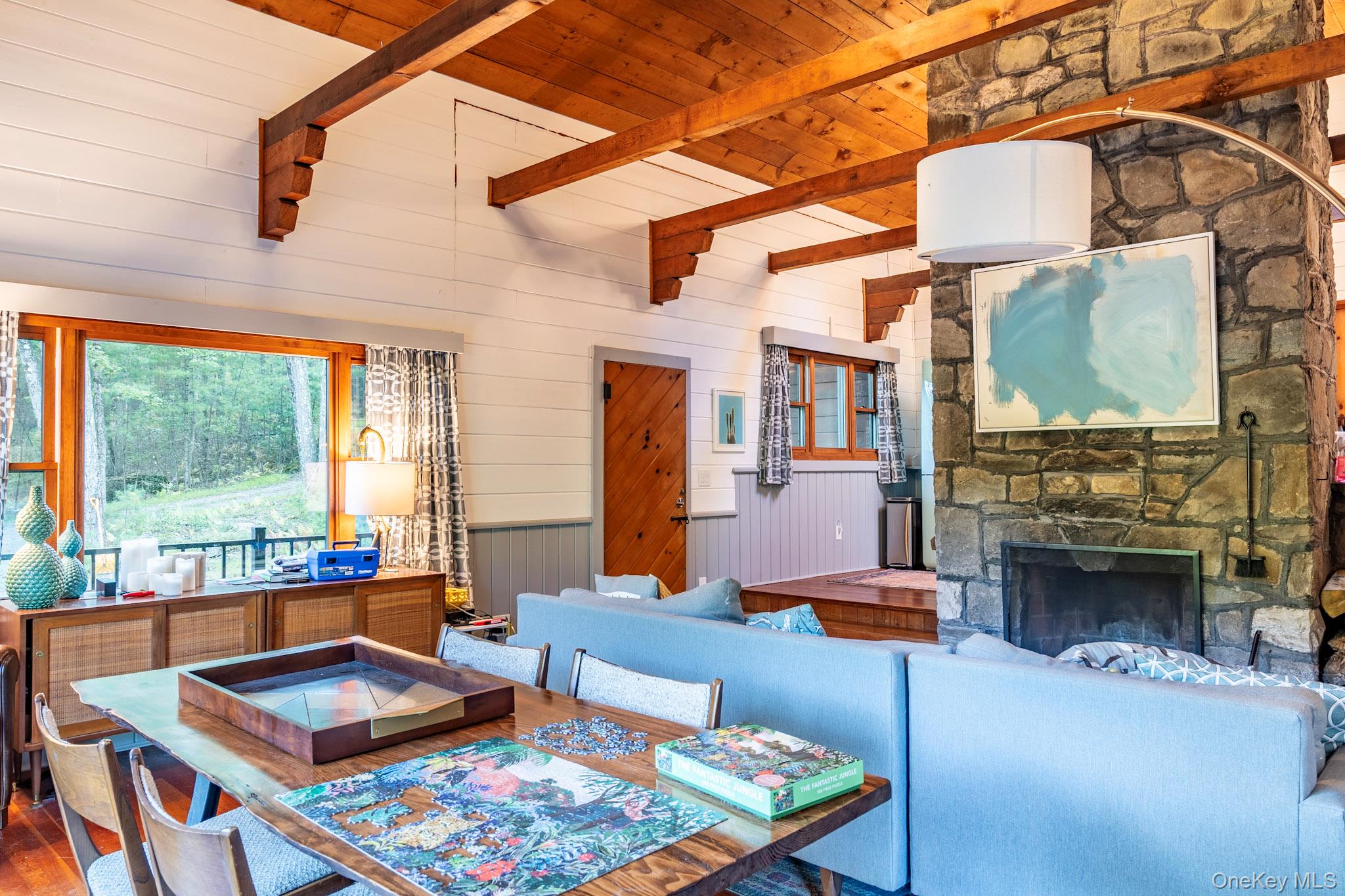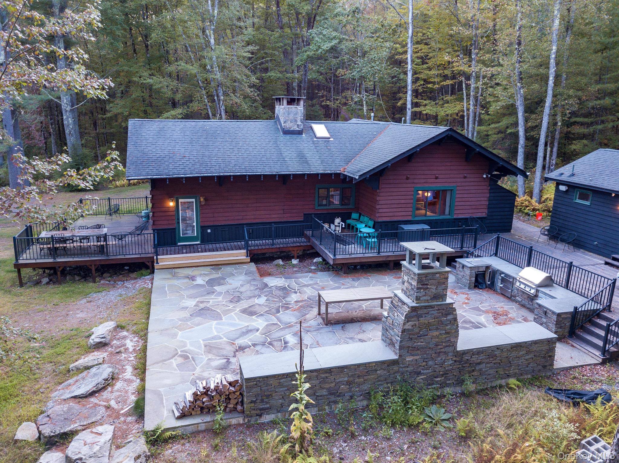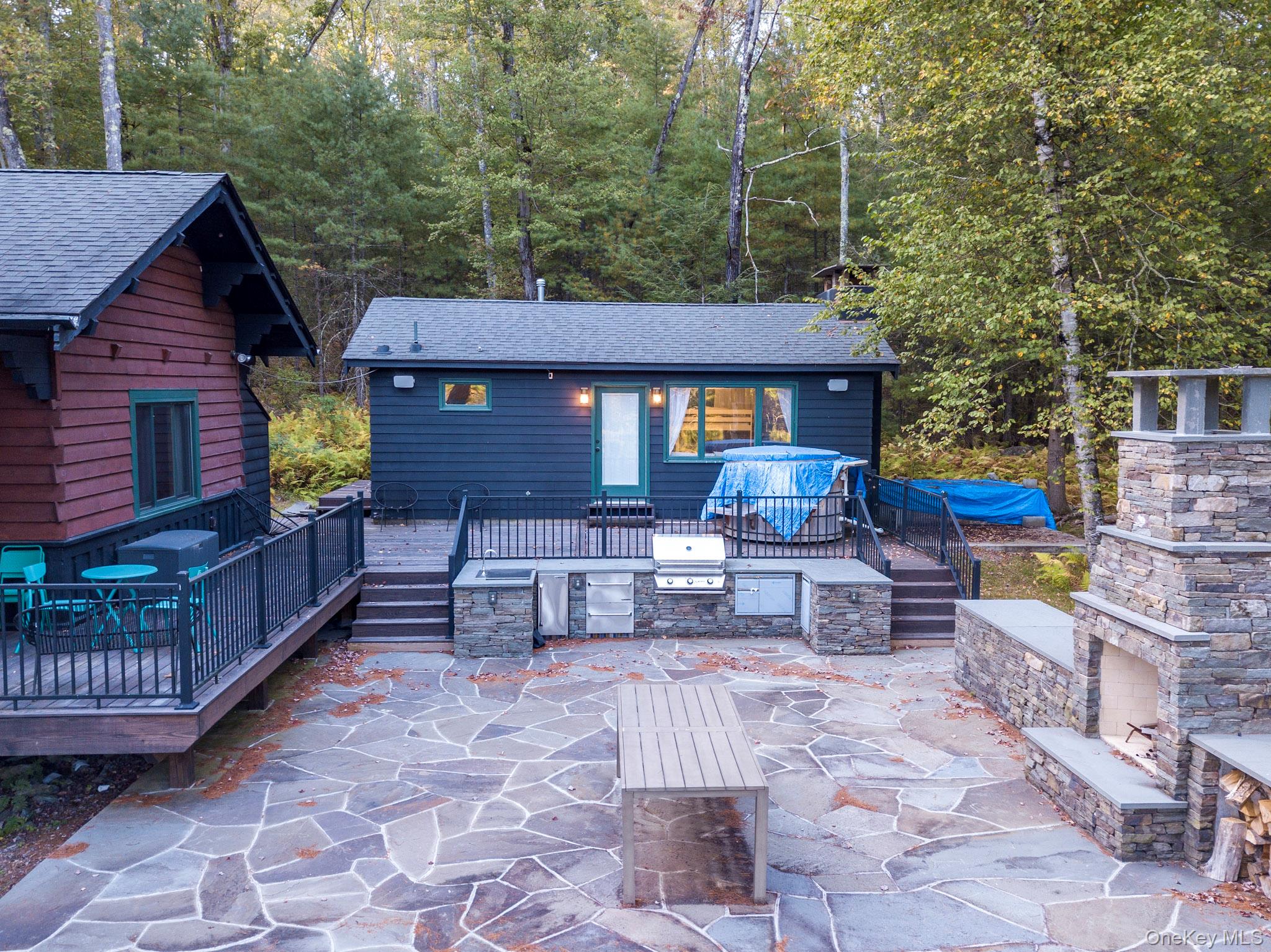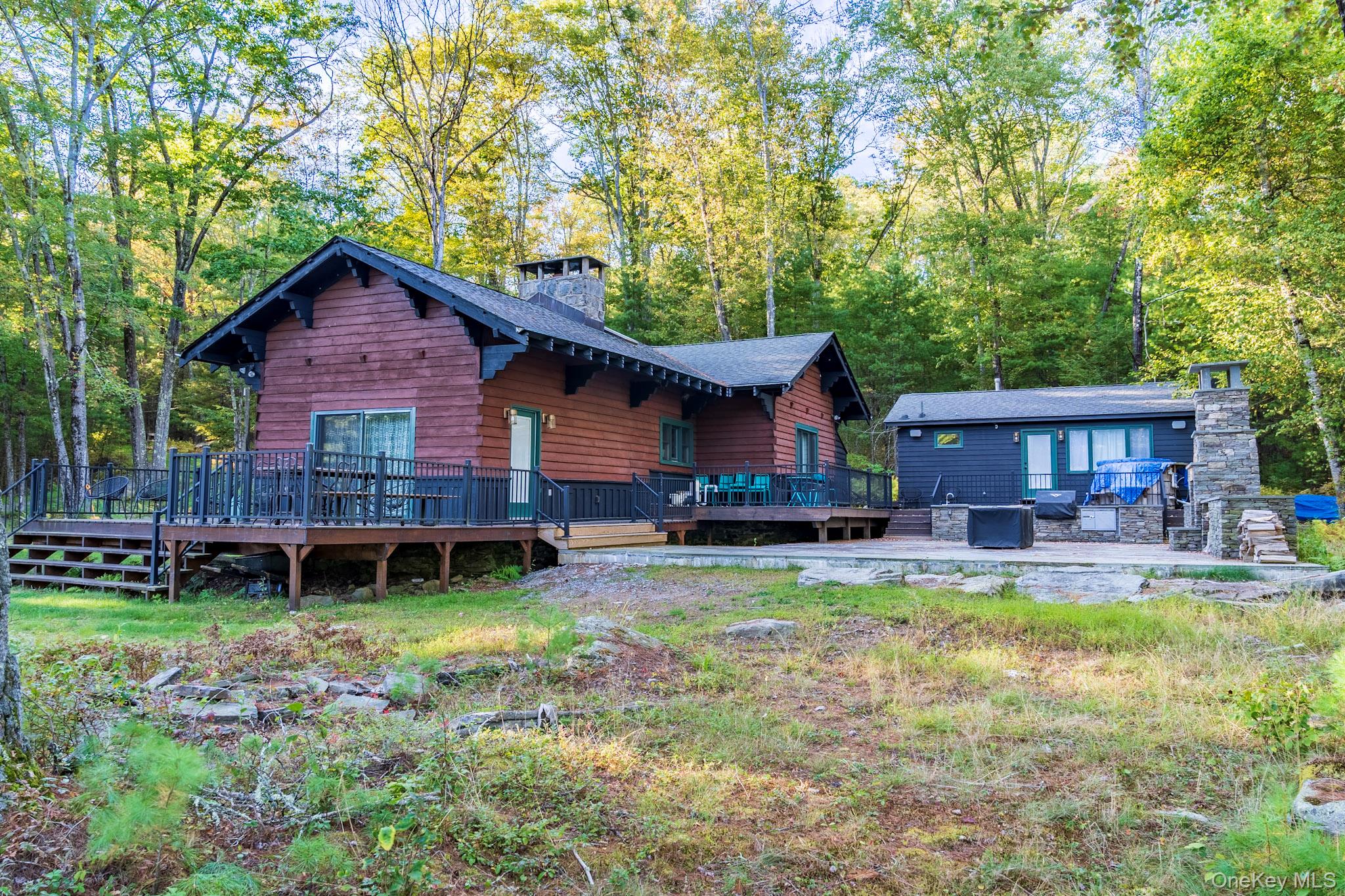 Your dream lakefront retreat awaits at the very end of a private road in beautiful Forestburgh, NY. This rare and historic property features a stunningly restored cabin with a separate guest house, nestled among the trees with direct access to a serene, private lake. As you pull into the driveway, you’ll immediately feel the magic of this one-of-a-kind home, where vaulted ceilings, outdoor entertaining, and breathtaking lake views welcome you into a space filled with warmth and character. Originally part of the 1939 New York World’s Fair, the cabin showcases an original stone fireplace stamped from that historic event, along with carefully preserved details like original cabinetry and built-ins that add timeless charm. The kitchen has been thoughtfully updated with new countertops while maintaining its vintage appeal, and the bathroom has been fully renovated with modern finishes. The separate guest house offers a cozy stone fireplace and a brand-new bathroom, perfect for hosting friends and family or creating a private studio or rental space. Outside, the property truly shines with an oversized bluestone patio designed for entertaining, and a spectacular one of a kind, custom Teak hot tub to enjoy. The new patio features a full high-end outdoor kitchen, a grand bluestone fireplace, and multiple areas to gather and relax by the lake. Whether you're hosting large events or simply enjoying a peaceful evening in nature, this home delivers both privacy and convenience. The property is a few minutes from Monticello Motorclub, the Forestburgh Playhouse, the Forestburgh General Store, Forage Pizzeria, Resort World Casino, and a 1 1/2 drive to the GWB. With a blend of rich history, stylish comfort, and modern upgrades, this lakefront gem offers an unmatched lifestyle for full-time living, weekend getaways, or investment potential. Don’t miss this amazing opportunity to own one of Forestburgh’s most enchanting homes.