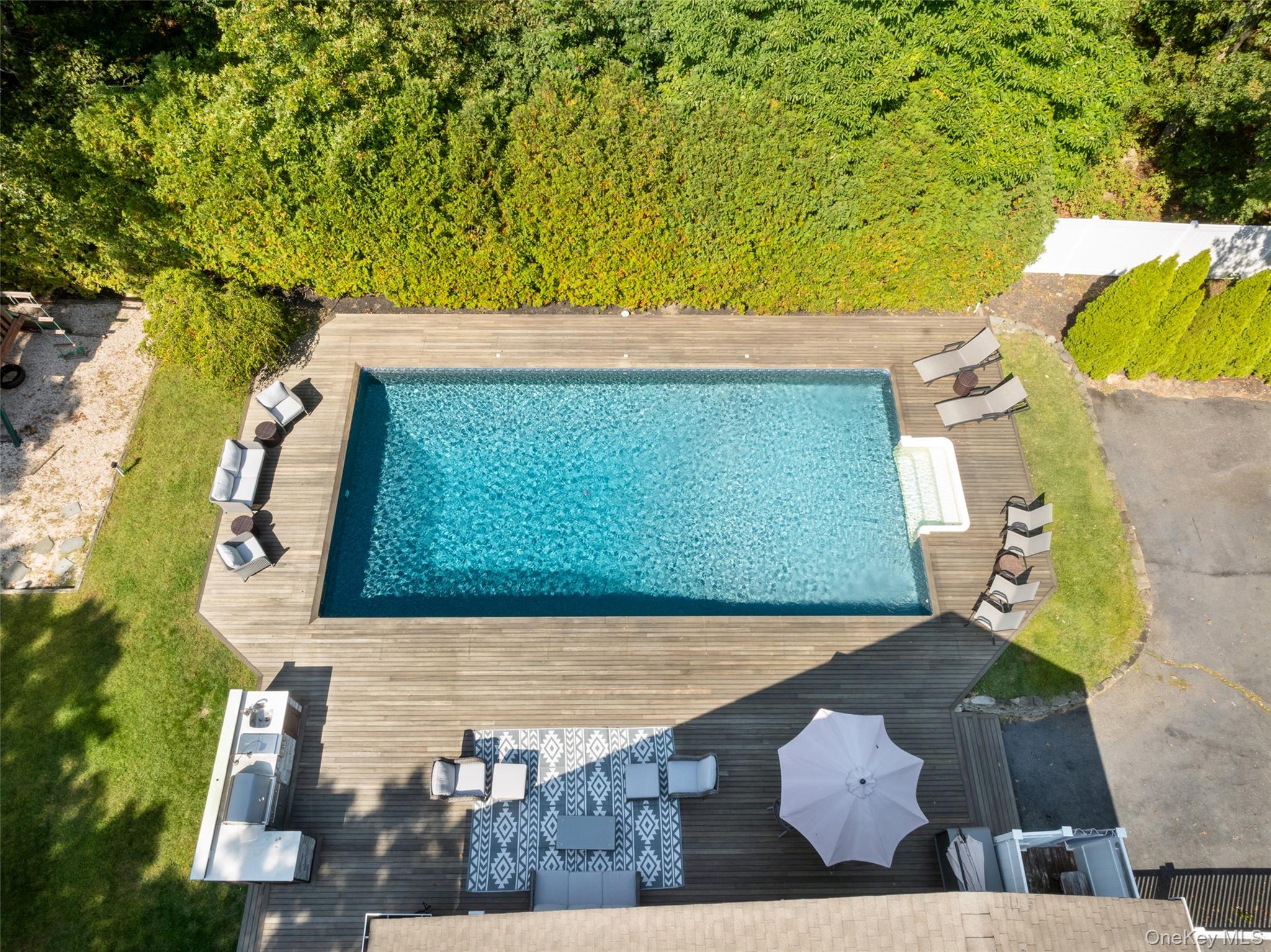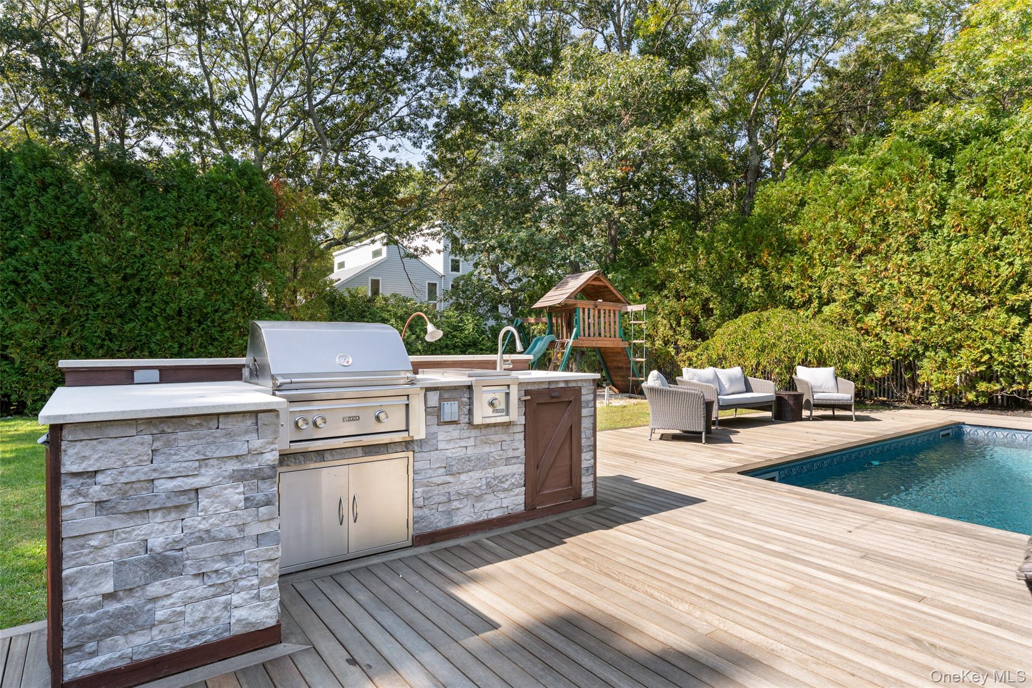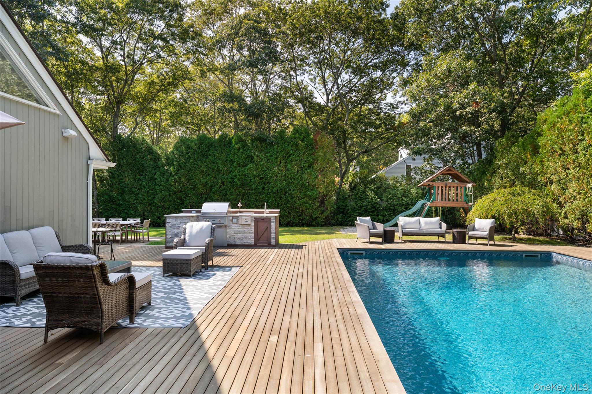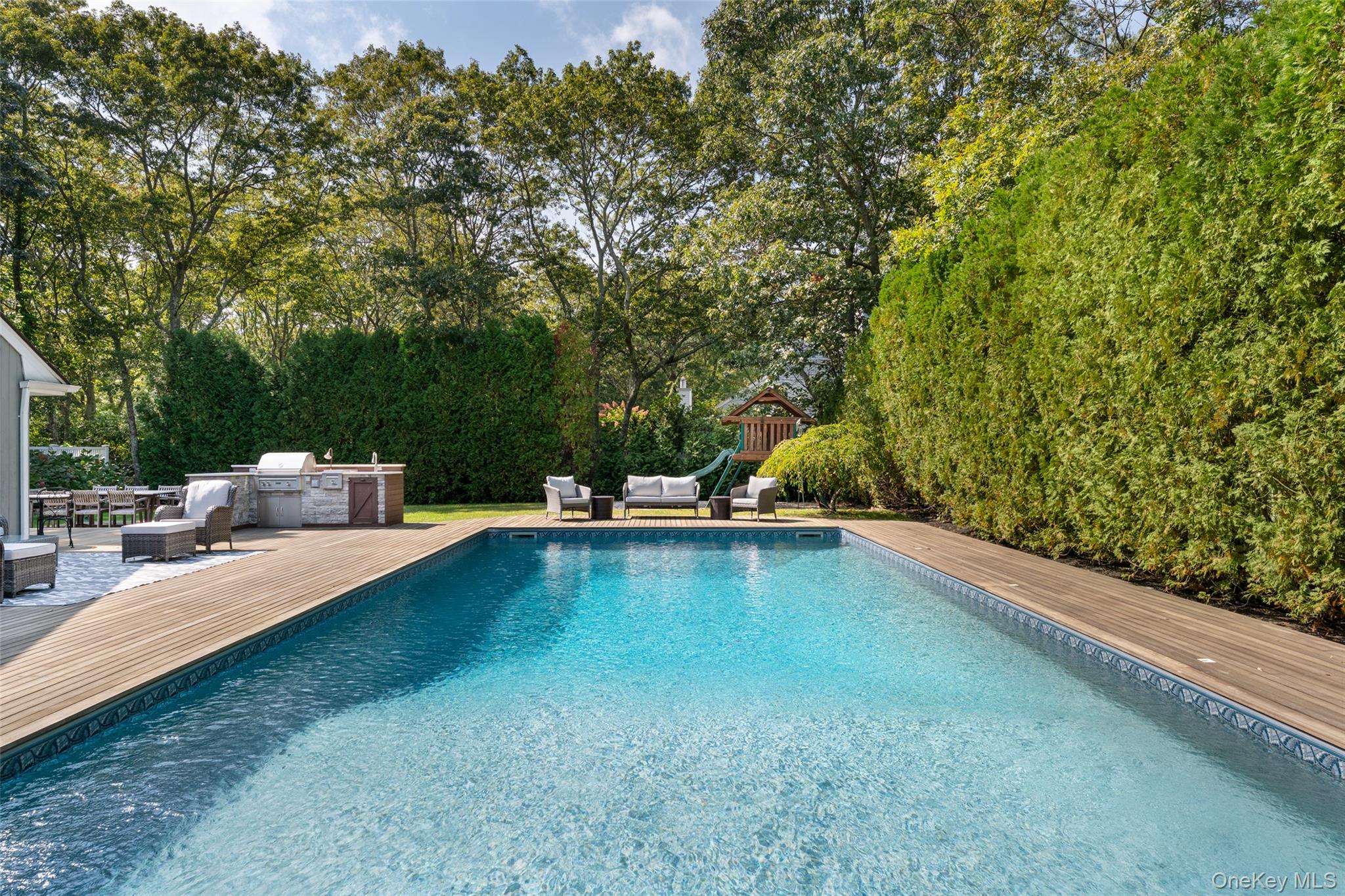 Nestled within the private community of Squire Woods in Hampton Bays, this beautifully updated and meticulously maintained four-bedroom, three-and-a-half-bath home offers the perfect blend of year-round comfort and vacation luxury. Step into a light-filled open floor plan featuring a spacious great room with vaulted ceilings and a stacked stone gas fireplace, ideal for relaxing or entertaining. The chef’s kitchen is a culinary dream, boasting granite countertops and sleek stainless-steel appliances. The two-car garage is conveniently located adjacent to the kitchen. On the first floor, a junior primary suite provides a private retreat with its own full bath and direct access to the expansive mahogany deck and lush yard, complemented by an additional powder room for guests. Upstairs, the large primary suite is a true sanctuary, featuring custom closets, a gas fireplace, and a redesigned private bathroom with elegant finishes. Two additional guest bedrooms and a full bath complete the second floor, offering comfort and style for family or visitors. Modern conveniences such as central air conditioning and central vacuum enhance everyday living. The legal lower level includes a media room and office space, a dedicated laundry room. Outside, enjoy resort-style amenities including new mahogany decking, a fully equipped outdoor kitchen, a refreshing outdoor shower, and a heated pool surrounded by mature landscaping for ultimate privacy. Whether you're seeking a serene escape or a stylish Hamptons base, this property is the perfect getaway.