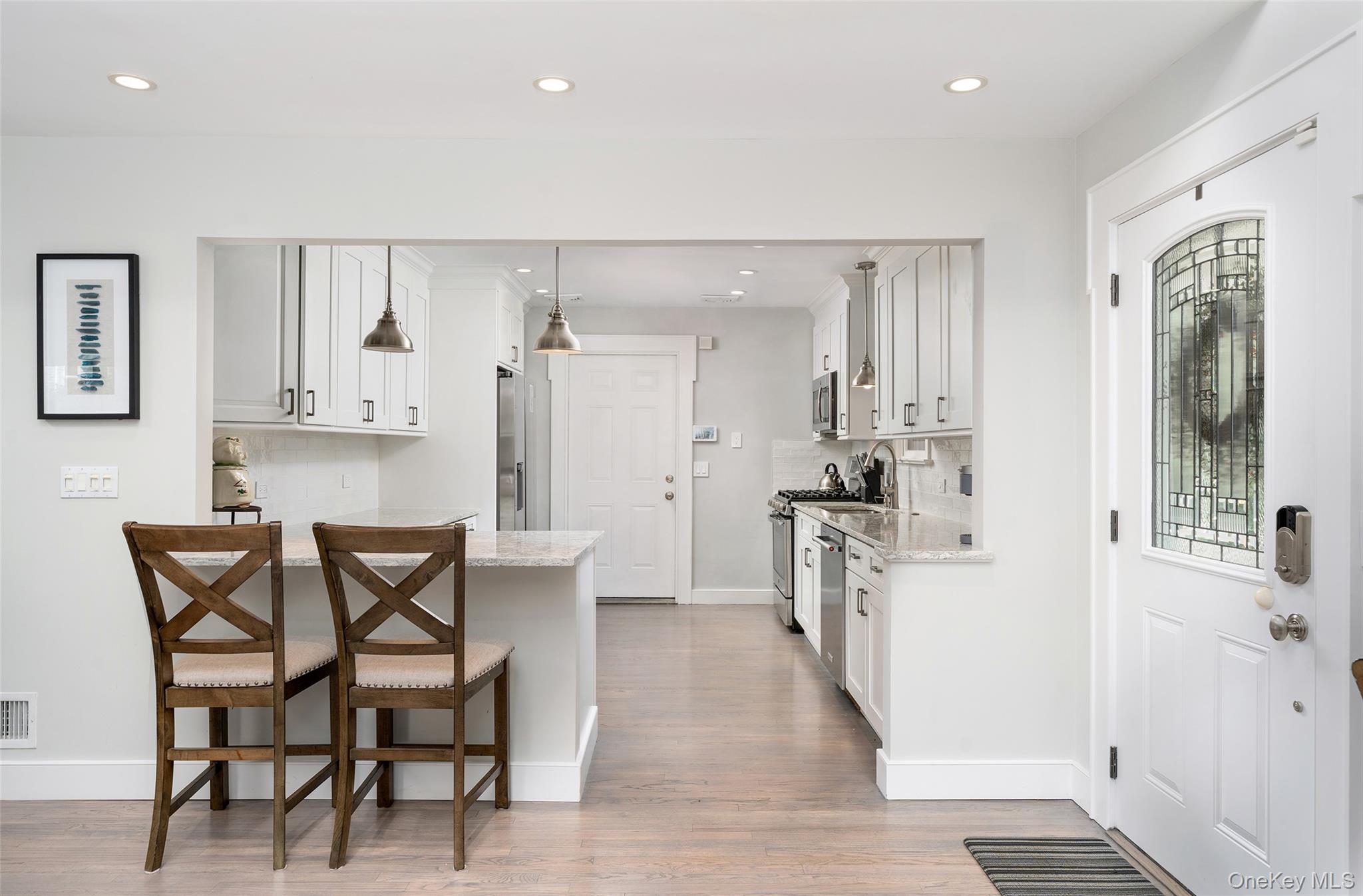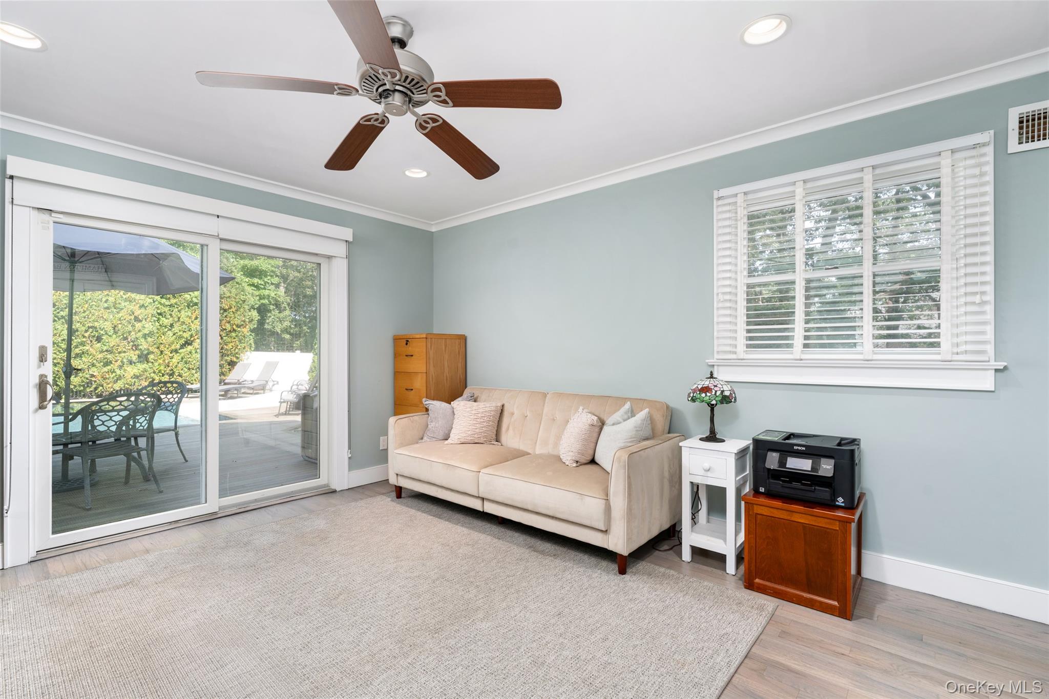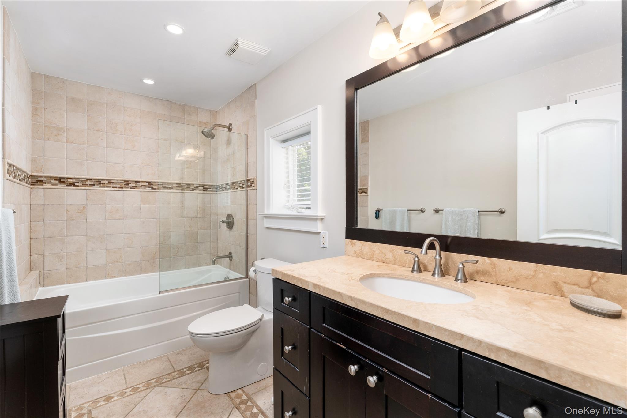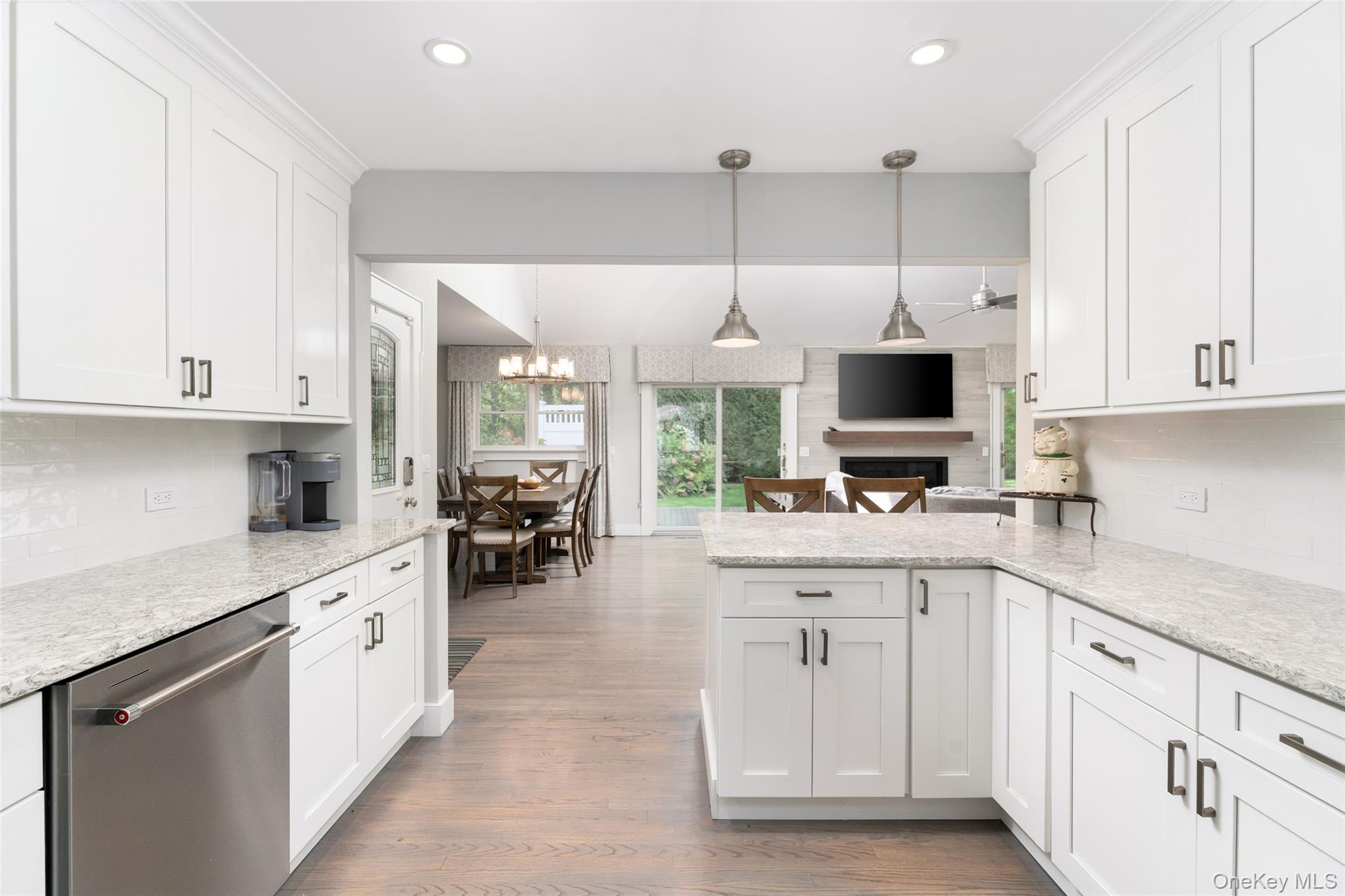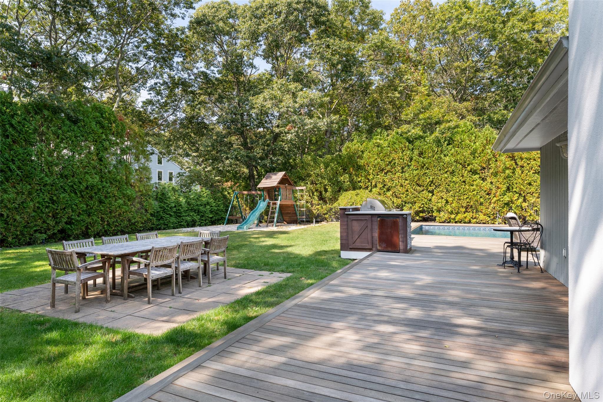 Nestled within the private community of Squire Woods in Hampton Bays, this beautifully updated and meticulously maintained four-bedroom, three-and-a-half-bath home offers the perfect blend of year-round comfort and vacation luxury. Step into a light-filled open floor plan featuring a spacious great room with vaulted ceilings and a stacked stone gas fireplace, ideal for relaxing or entertaining. The chef’s kitchen is a culinary dream, boasting granite countertops and sleek stainless-steel appliances. The two-car garage is conveniently located adjacent to the kitchen. On the first floor, a junior primary suite provides a private retreat with its own full bath and direct access to the expansive mahogany deck and lush yard, complemented by an additional powder room for guests. Upstairs, the large primary suite is a true sanctuary, featuring custom closets, a gas fireplace, and a redesigned private bathroom with elegant finishes. Two additional guest bedrooms and a full bath complete the second floor, offering comfort and style for family or visitors. Modern conveniences such as central air conditioning and central vacuum enhance everyday living. The legal lower level includes a media room and office space, a dedicated laundry room. Outside, enjoy resort-style amenities including new mahogany decking, a fully equipped outdoor kitchen, a refreshing outdoor shower, and a heated pool surrounded by mature landscaping for ultimate privacy. Whether you're seeking a serene escape or a stylish Hamptons base, this property is the perfect getaway.
