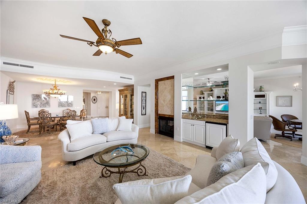 Rarely available to rent- Updated 3 Bedroom+ Office /4 full bath condo in Marco Island's most desirable beachfront building! Unobstructed views of the Gulf and Marco Island’s white sandy beaches from every room and 2 private balconies. High ceilings, large windows, and multiple terraces capture light and sea breezes. Updated kitchen is fully equipped with premium appliances, abundant counter and cabinet space, a large center island, breakfast bar, and custom finishes give this unit a beach house in the sky feeling. Comfortable furnished living room, full dining area and an additional living room offer space to relax or entertain after a day of exploring Marco Island. Generous primary suite, featuring a private sitting area, exquisite finishes, large walk-in closets, and a spa-style bathroom. Two additional guest bedrooms, each featuring 2 full beds and their own full bathrooms, perfect for guests and family. A comfortably equipped office makes working from home a delight. This unit is the epitome of Marco Island beachfront luxury at the artist-designed Veracruz building within the highly desirable Cape Marco complex on the Southern end of the Island. Community features gated, secure access, resort-style pool and lounge area, private beach access, fitness center overlooking the water, social rooms and even guest suites available for visitors.