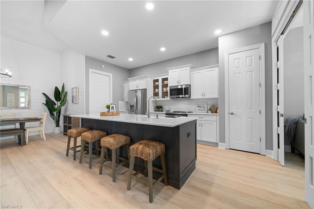 Welcome to the gorgeous, EXTENSIVELY RENOVATED, AND UPDATED dream home you've been searching for, in the prestigious gated lakefront community of The Quarry. *Be sure to explore every corner of this stunning home with our immersive 3D virtual tour*. This home has it all. Starting with the exterior, this homesite boasts that highly sought after southern exposure lakefront location everyone desires, along with exclusive access to the Quarry's one of a kind boating lake. This home shows off a new flat style roof and color matched ELECTRIC Remote Controlled roll down hurricane shutters on all openings and windows. New exterior paint coordinates with the new roof for flawless curb appeal and style in an updated color palette. An oversized lanai and pool area with water views complete the perfect ambiance for enjoying your best life in Naples. Heading inside, this remodeled, updated designer interior is a stunner. The light filled floor plan is a 3 bedroom plus den, flex area (with custom hideaway doors) and 2 full bathrooms. The kitchen features an oversized custom island, backsplash, and all new stainless steel appliances, finished off with all new cabinetry and quartz countertops. Beautiful new LVP flooring covers the living areas and bedrooms, fresh carpet for the master bedroom, and fresh new paint completes the look through the interior of the home. The garage was also included in the upgrades, with a new coordinating modern epoxy finish. A new and upgraded HVAC will be sure to keep you feeling comfortable at all times. The Quarry is the ultimate active lifestyle community where world class amenities go far beyond the fairways. Boating with launch area and slips available. A recent beach club renovation is ready to wow you with included access to pickleball, tennis, state of the art fitness and wellness center, resort style pool and lap pool, (golf membership is optional). Beach side restaurants and bars for formal and casual options, green space, a social director, activities, and beach lounging in front of the areas largest lake with amazing water views. Don't miss the chance to enjoy the best of everything in one exceptional home. Schedule a showing today and start living the resort lifestyle you've always dreamed of.