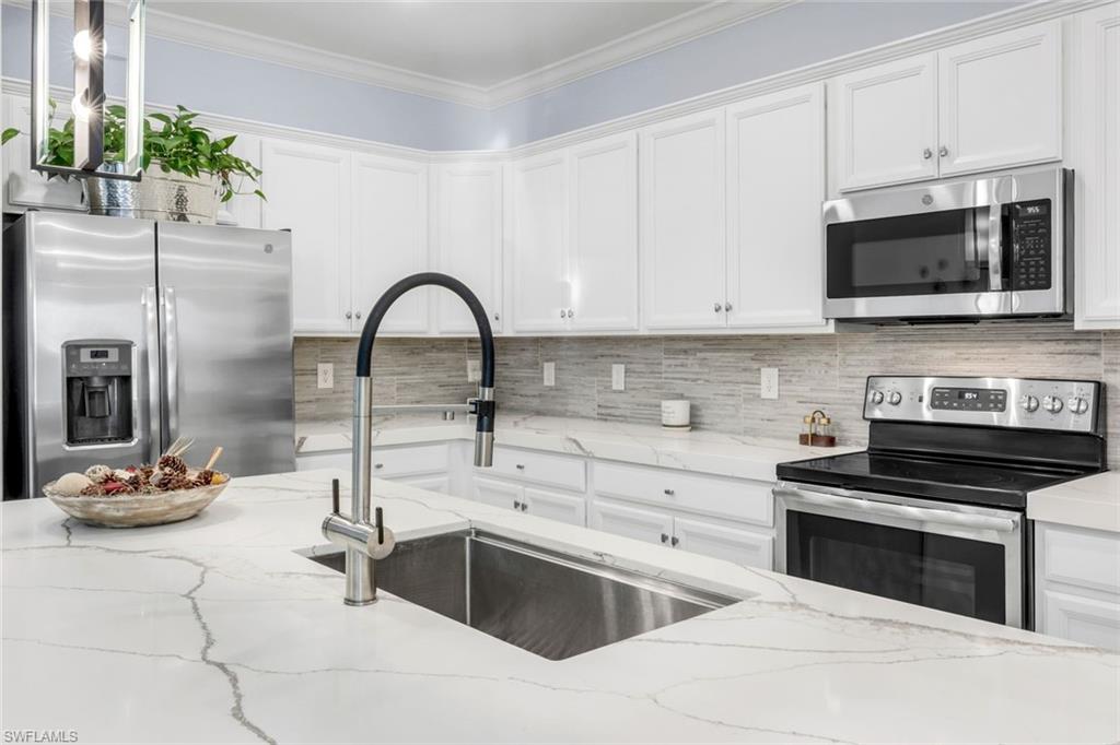Welcome to Your Naples Oasis! This stunning 3-bedroom, 3-bathroom home with a 2-car garage and extended driveway offers the Naples lifestyle you’ve been dreaming of. Featuring soaring ceilings, an open floor plan, and a large lanai with a private pool, spa, and outdoor kitchen, this residence is perfect for both relaxation and entertaining. Inside, the sleek kitchen showcases white cabinetry, quartz countertops, a stylish backsplash, a massive island with seating for four, stainless steel appliances with hood, and a spacious walk-in pantry. The open kitchen, living, and dining areas flow seamlessly together under a detailed tray ceiling, with windows and sliders filling the home with natural light and views of the pool and lanai.