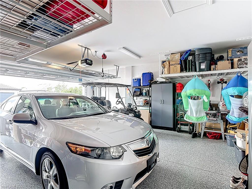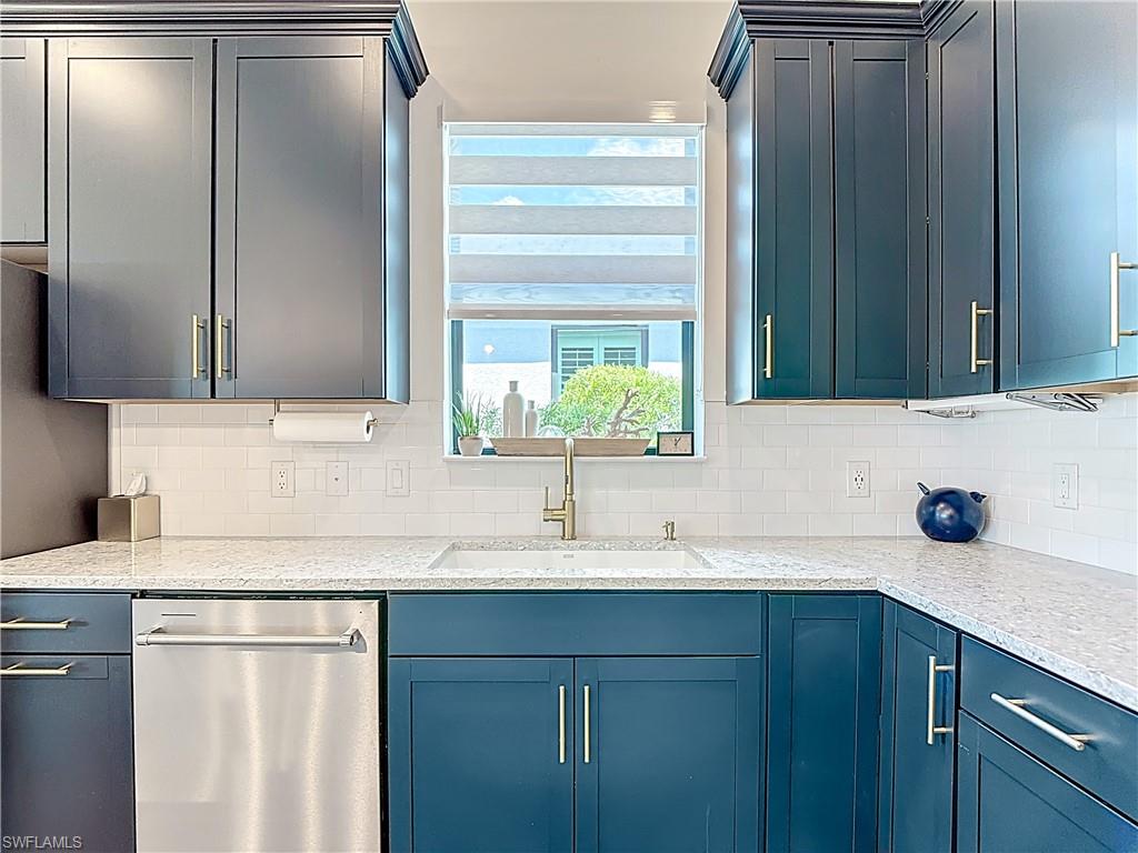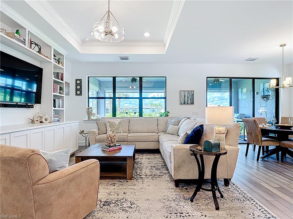 Upgraded Prosperity floor plan with 2 bedrooms, 2 baths, and den. Features include epoxy garage floors with storage, gourmet kitchen with built-in stainless appliances, quartz counters, and family room with custom TV wall. Owner’s suite offers a spacious bedroom and frameless glass shower. Plantation shutters throughout. Extended screened lanai has outdoor kitchen with Thor appliances; rear includes hurricane roll-down shades. Located in Del Webb Naples, a 55+ community with two clubhouses, pools, fitness, dining, pickleball, tennis, bocce, garden, trails, and optional golf.