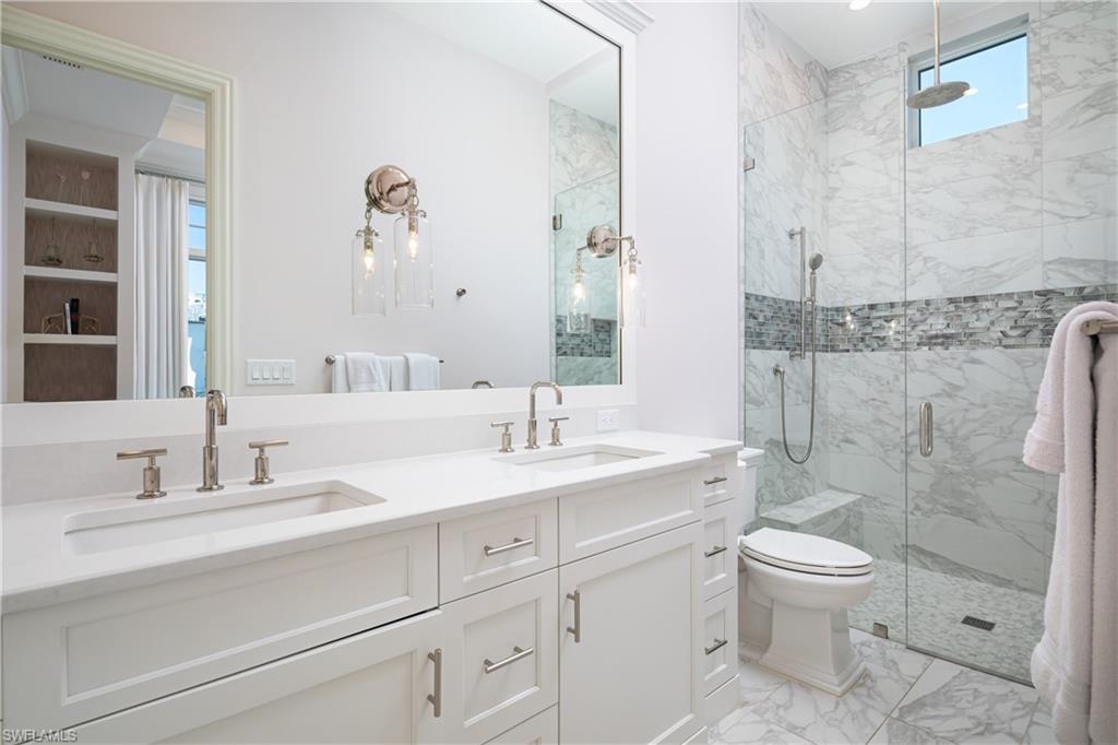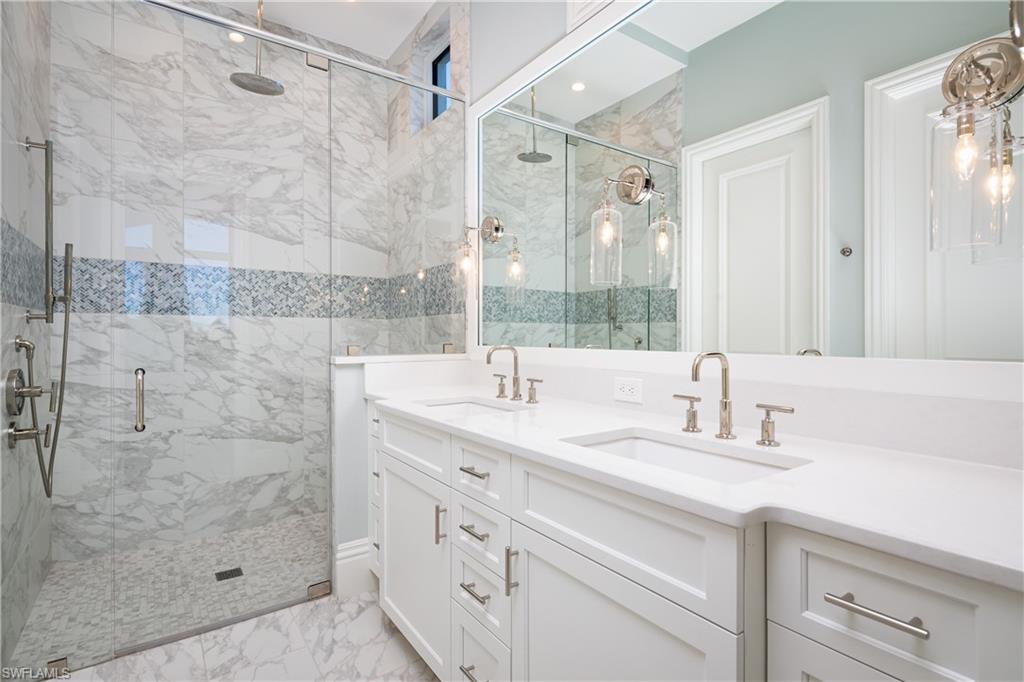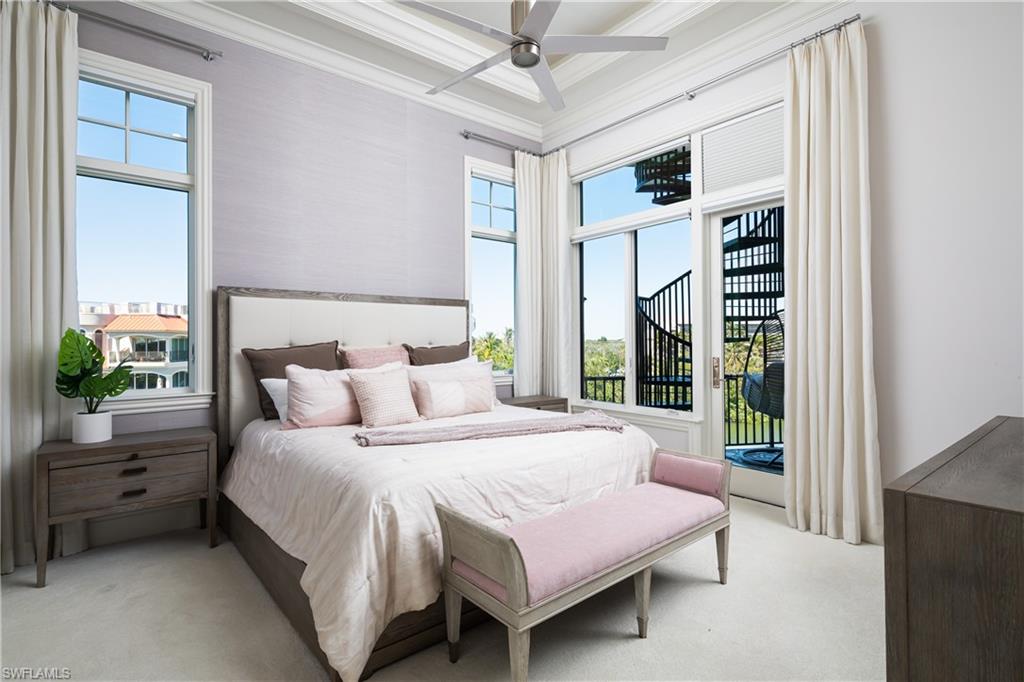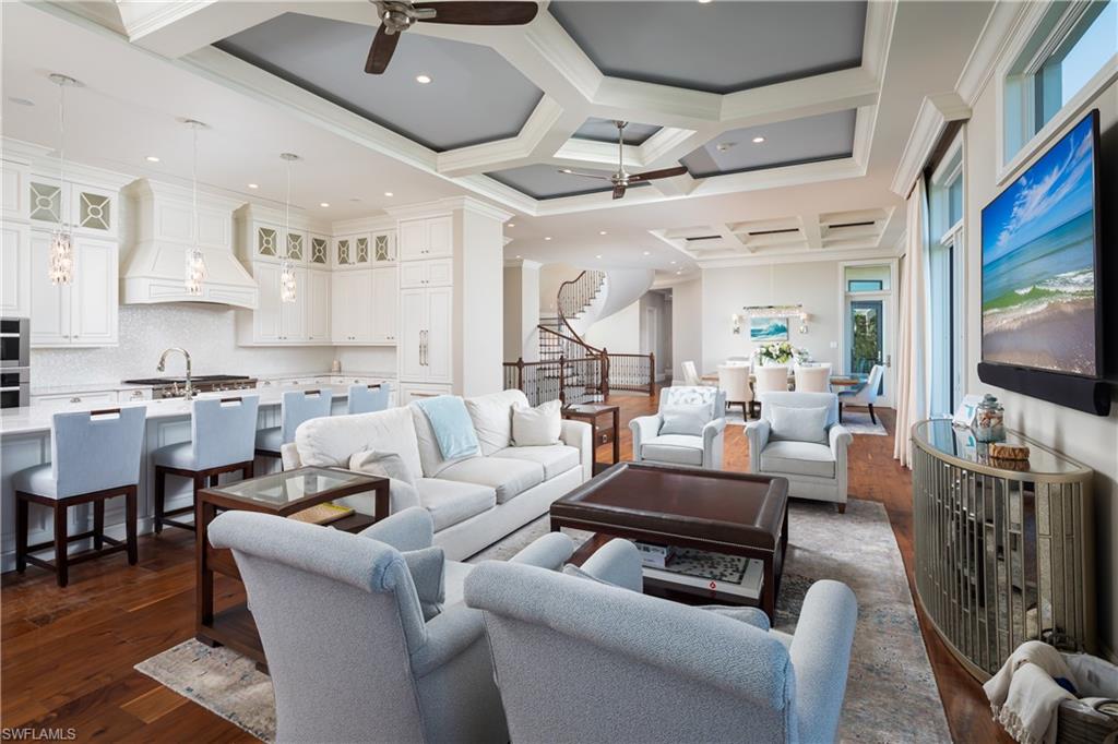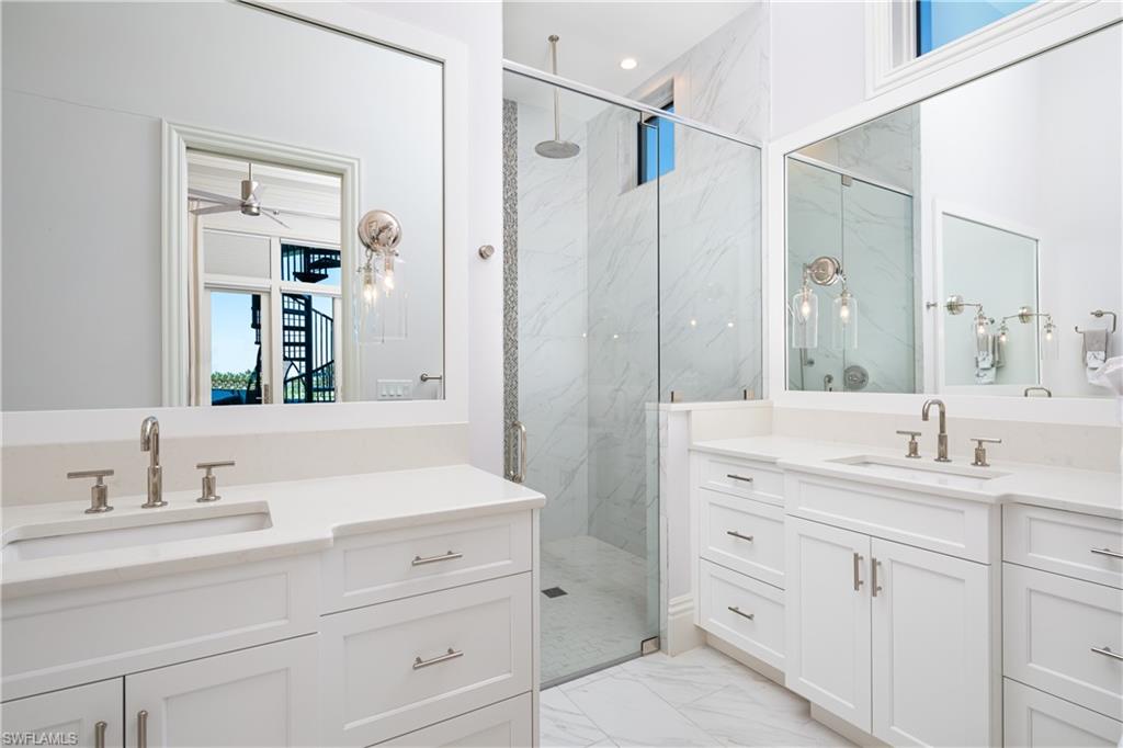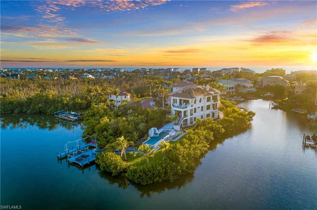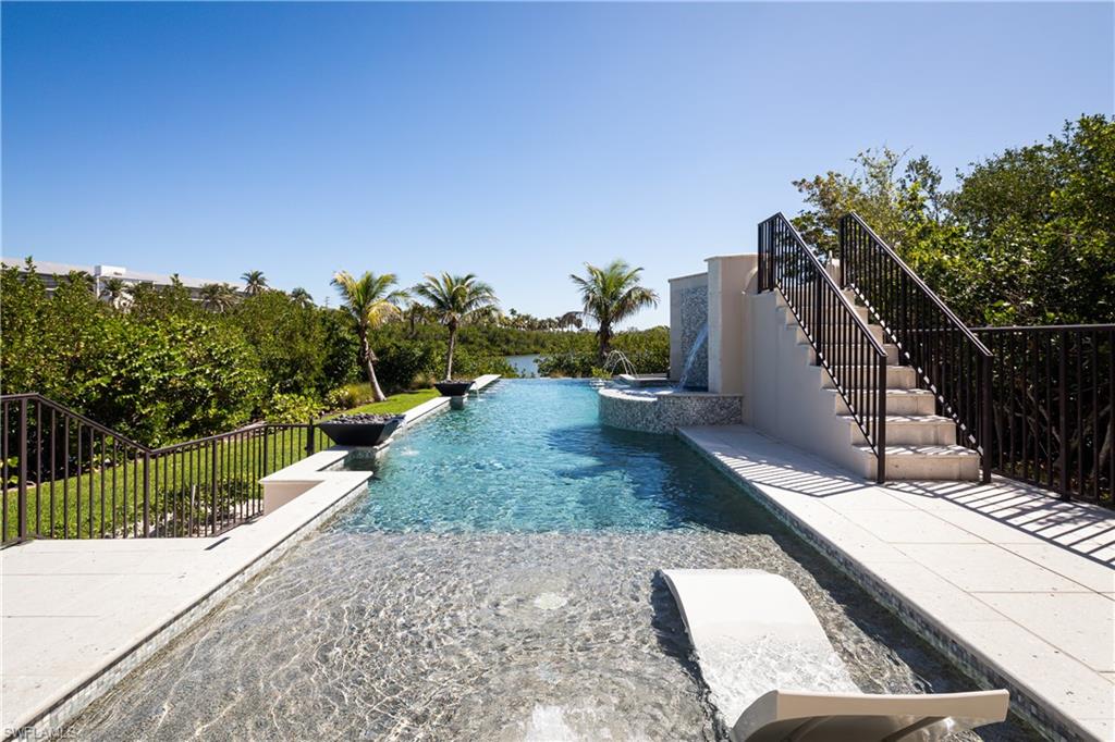 This 2019-Potter Homes built masterpiece is one of the most exceptional homes ever seen in Barefoot Beach. Positioned on one of the most coveted Bayside lots on a private peninsula in the exclusive, double-gated Southport on the Bay, this estate offers an unrivaled approximate 537* feet of wraparound water frontage, providing breathtaking Bay views on three sides and direct Gulf access. A more impressive panoramic waterfront view cannot be found. Crafted by the award-winning Potter Homes, this contemporary masterpiece is built like a fortress with all-concrete construction, hurricane impact windows and doors, and electric hurricane shutters. It is truly the ultimate retreat for beach lovers and boating enthusiasts, offering deeded beach access just a 10-minute walk away and direct Gulf access with no bridges from your 20, 000 lb boat lift, along with a double jet ski platform lift. Every detail has been meticulously crafted, from the stunning oak flooring to the elegant coffered ceilings. The expansive floor plan spans 6, 269 sq. ft. under air, featuring 6 bedrooms, a den, 6 full baths, 2 half baths, dual laundry rooms, a private elevator, a top-floor sundeck, a 3-car garage, and a versatile lower-level flex space. Step outside and experience one of the most extraordinary resort-style outdoor areas in the Barefoot Beach area. The outdoor space includes a large infinity-edge lap pool with a tanning shelf, water features, a swim-up bar, and a waterslide, all complemented by fire bowls and a fire pit—creating the ultimate space for entertaining. The outdoor patio features electric screens, a cozy fireplace, and a summer kitchen—perfect for al fresco dining and enjoying the serene surroundings. Inside, the chef’s kitchen boasts crisp white cabinetry, quartz countertops, high-end appliances, and multiple dining areas. The primary suite offers an unmatched retreat, complete with an attached office/den, wet bar, fireplace, and a private sundeck overlooking the bay. The spa-like bathroom features dual vanities, a large shower with a rainfall showerhead, and a separate soaking tub. Ascend the spiral staircase to the top-floor observation deck, where you can savor stunning sunsets and panoramic water views. Conveniently located near fine dining, RSW Airport, Mercato, and Waterside Shops, and just 15 miles from the renowned Fifth Avenue in Naples, this home is a true gem in the heart of Southport on the Bay.