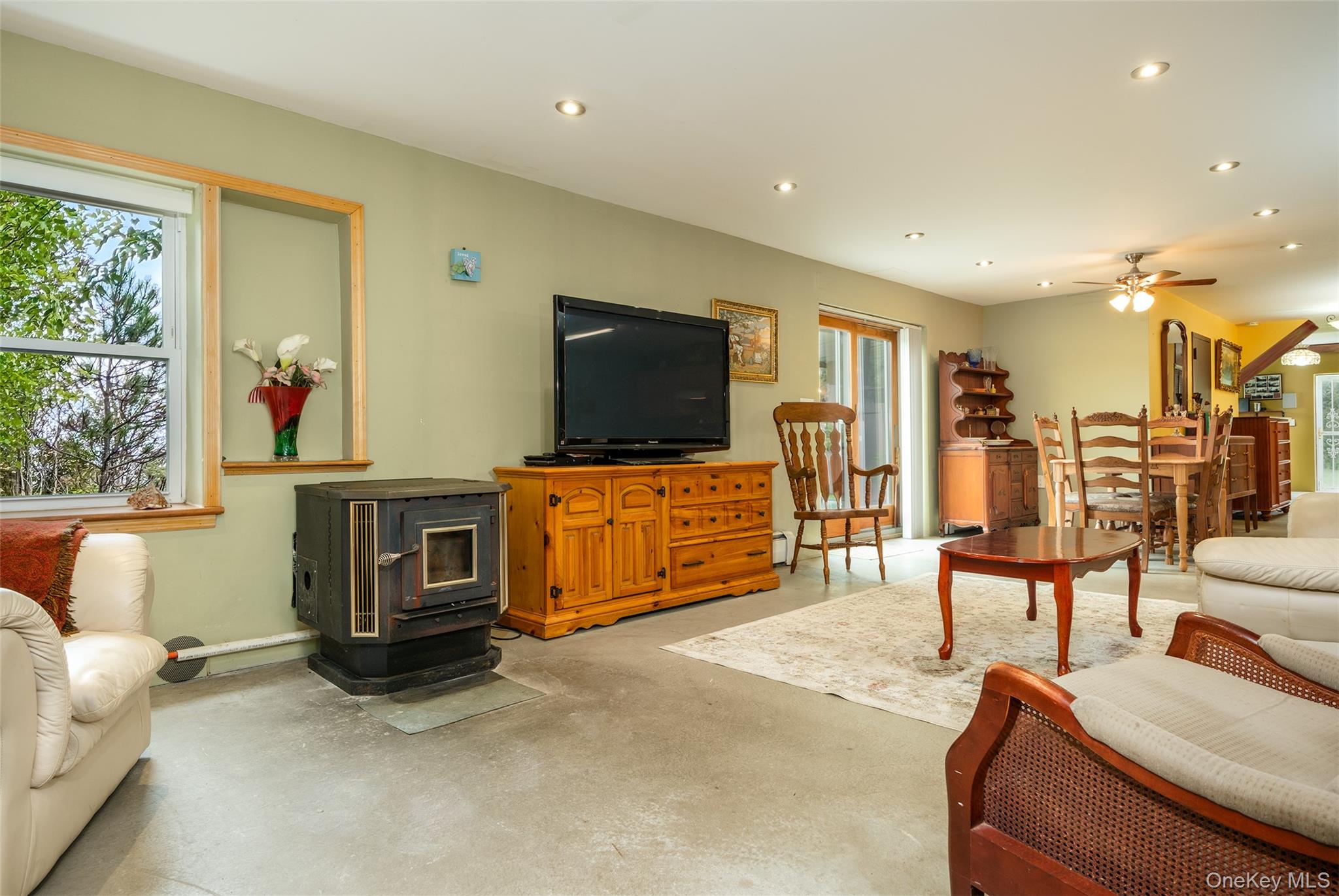 Welcome to your dream retreat where serene mountain views meet easy-care living on 28+ acres. This property features Mediterranean-inspired design that highlights a connection to the garden and outdoor spaces. The home is creatively constructed with a durable concrete lower level and an elegant modular upper level. A traditional aesthetic with stone walkways and decks that frame breathtaking mountain vistas. Ideal hunting, off-grid living, Homesteading, or hobby farm or great rental option. The upper level is perfect for large gatherings, accessible from both floors and the front and rear decks. The central kitchen is a chef's dream, equipped with high-end GE profile appliances, including a glass top stove, dual wall ovens, and a spacious center island with a stainless steel sink and dishwasher. The breakfast room is light-filled, while the dining area is spacious with large sliding doors leading to the deck for outdoor entertaining. The cozy living room, featuring large windows and a wood-burning stove, draws in stunning mountain views. The primary suite at the south end includes a gas-log fireplace, dual windows, and a luxurious en suite bathroom with a jetted tub and ample storage. There are two additional bedrooms, each offering generous closet space PLUS a home office (or great spillover bedroom). A central hall bathroom, with a shower tub, is conveniently located. The lower level is like a private apartment, perfect for guests or multigenerational living, featuring an open floor plan w a galley kitchen &dining area that opens to a garden patio. This space also includes a large bedroom with large cedar lined closets, a full bathroom w/ laundry area. 2 additional rooms can serve as extra bedrooms, an office, or storage. The property is further enhanced by a garage shed, a circular flagstone patio ideal for gatherings, and a shaded grapevine-covered patio, perfect for relaxing. With a small vegetable garden and a swing set, this property is perfect for outdoor enjoyment. Experience the serene country living of Schoharie County and the magical area of Gilboa and the northern Catskills — don't miss your chance to schedule a private showing today!