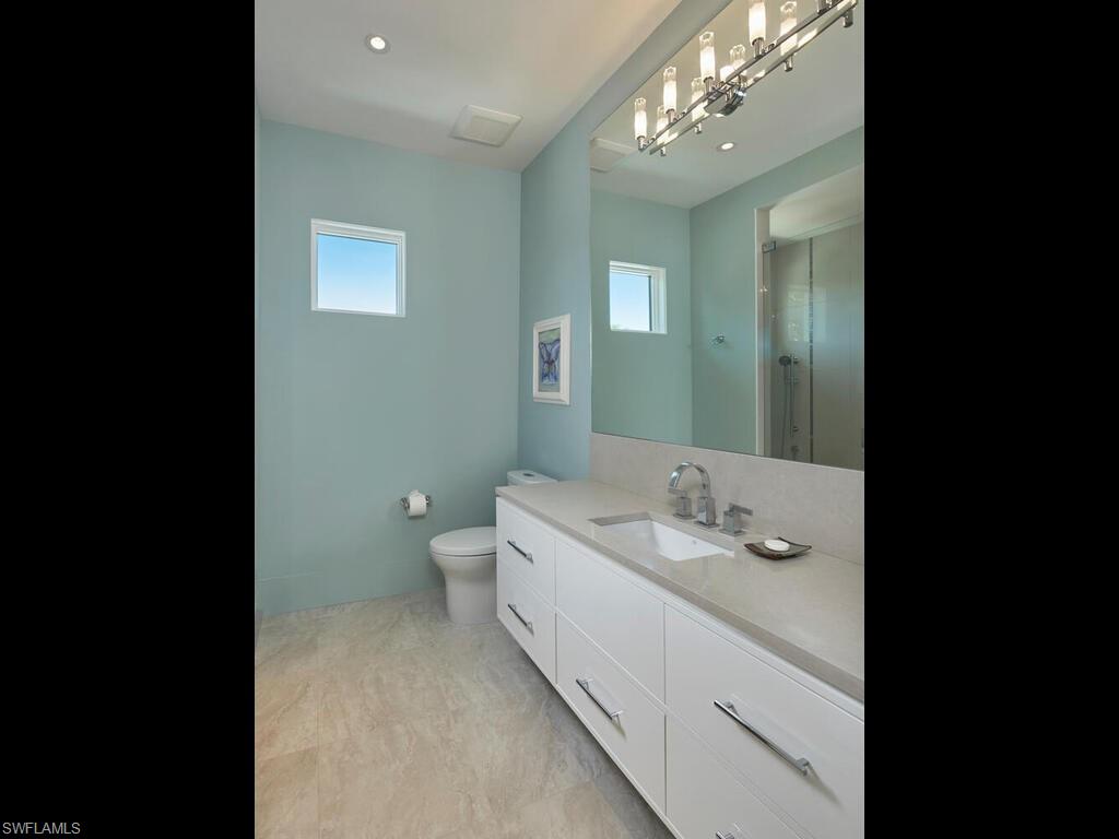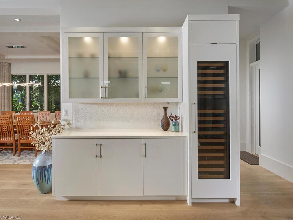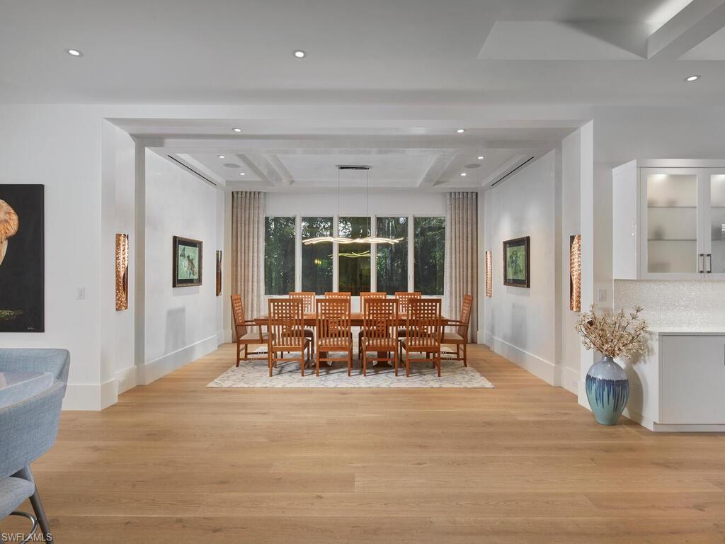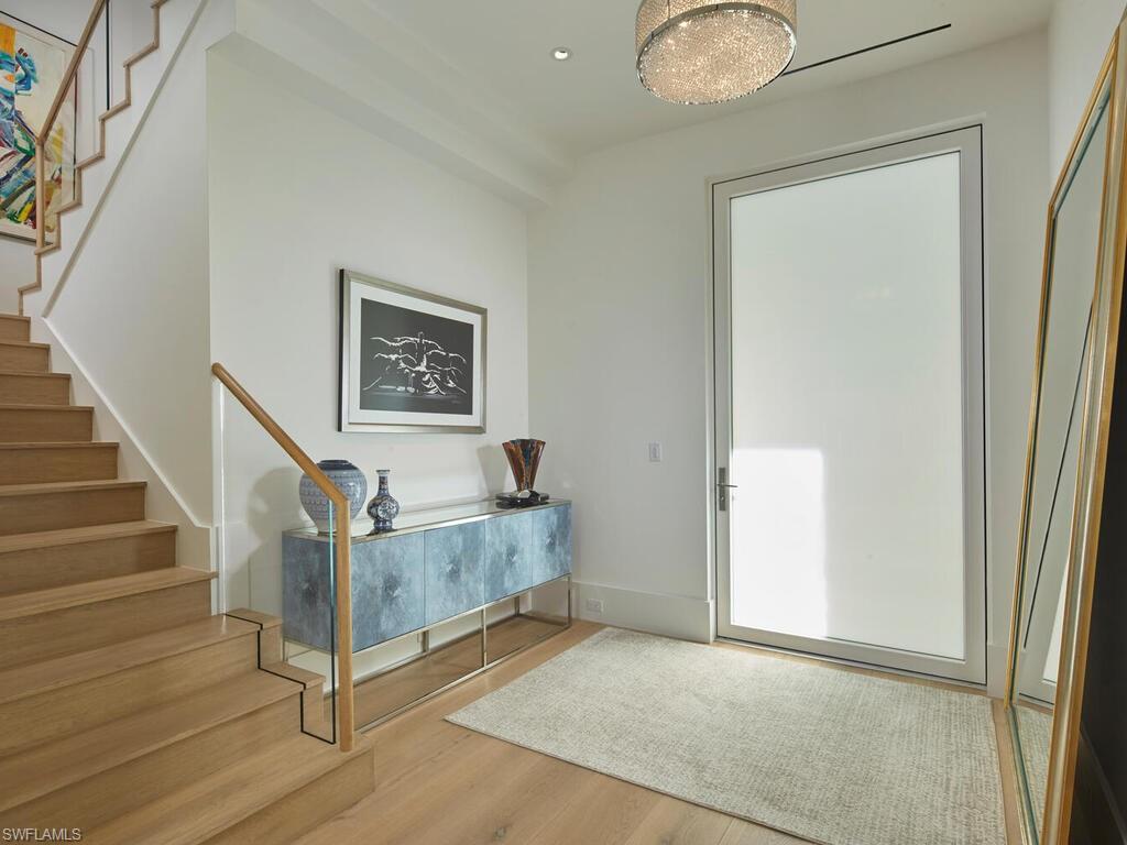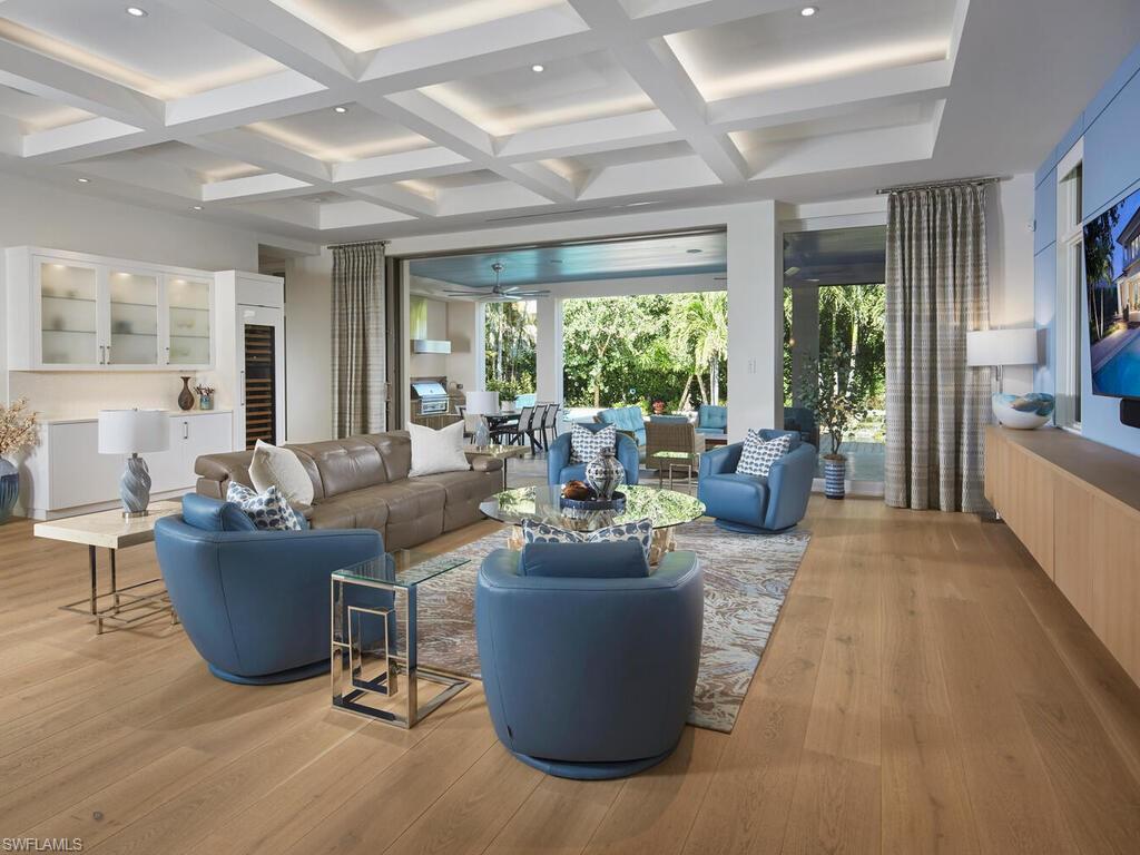 Nestled in the heart of Old Naples, just three blocks from the beach and steps away from world-class shopping and dining on 5th Avenue and 3rd St South, this custom, newly built London Bay home is ideally located on a peaceful street. The open floor plan showcases luxurious finishes and attention to detail throughout. The spacious kitchen features a 13-foot island and an expansive walk-through pantry, complemented by rift oak and high-gloss white cabinetry that harmonizes beautifully with the wide plank oak floors. An open formal dining room and expansive great room with a bar flow effortlessly through pocketing sliding glass doors to a covered outdoor living area. This outdoor oasis includes a fireplace, an outdoor kitchen, automated screens, pool, a tranquil pond and water feature, and a beautifully designed private garden shower. The second floor is home to two guest suites, a comfortable bonus room, and the primary suite, which boasts two walk-in closets and a private balcony overlooking the tropical yard. Additional noteworthy features include a 3-car garage, an elevated generator, air-conditioning units, and tankless water heaters, all with the convenience of natural gas serving the property.