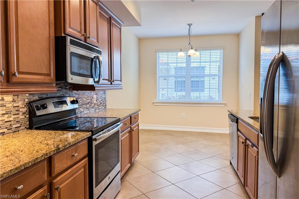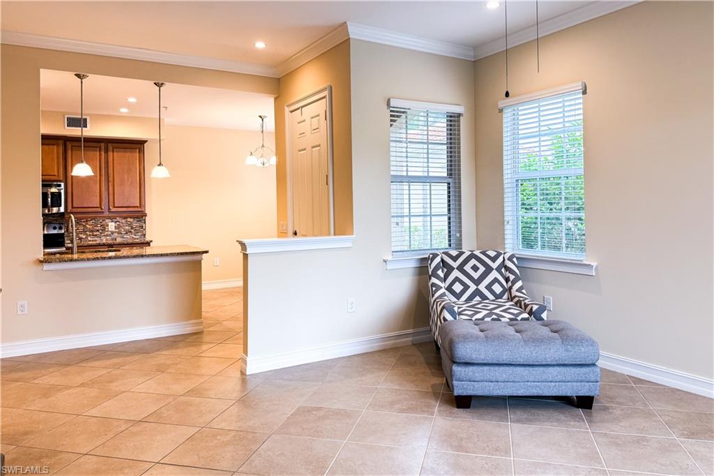 Enjoy your morning cup of coffee on your private lanai overlooking the beautiful lake & fountain. This 1st floor capri floor plan offers a split bedroom layout with 2 bedrooms + den, 2 full bathrooms & an attached 1 car garage. This light & bright end unit has a western rear exposure with several southern facing windows in the living area providing natural sun light. Many upgrades including granite counter tops in the kitchen and both bathrooms, tile flooring in the main living area, vinyl flooring in the bedrooms, wood flooring in the den, under cabinet lighting in the kitchen, tile backsplash, stainless steel appliances, & crown molding. IMPACT GLASS WINDOWS so no need for hurricane shutters! An extra storage closet on the lanai provides added space for beach chairs & seasonal items. Coveted guest parking spaces located next to this building. Sorrento is a quaint, maintenance-free, gated community of only 152 units with amenities including a clubhouse, exercise room, bocce ball & resort-style pool w/ cascading waterfall. Just a short drive to the area's finest gulf beaches & RSW international airport. The Logan Blvd extension to Bonita Beach Rd takes you to Naples in minutes!