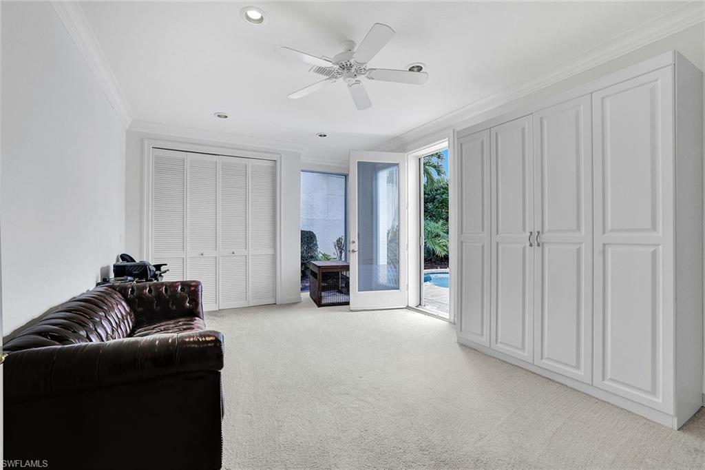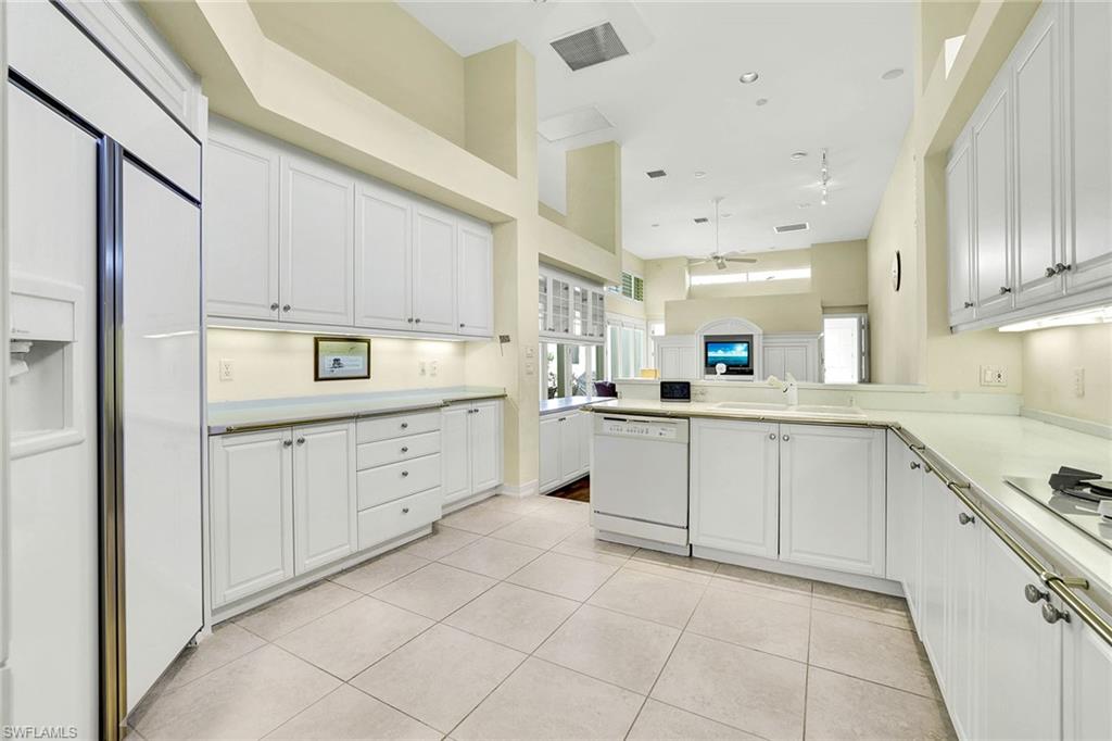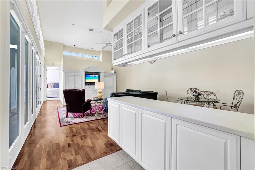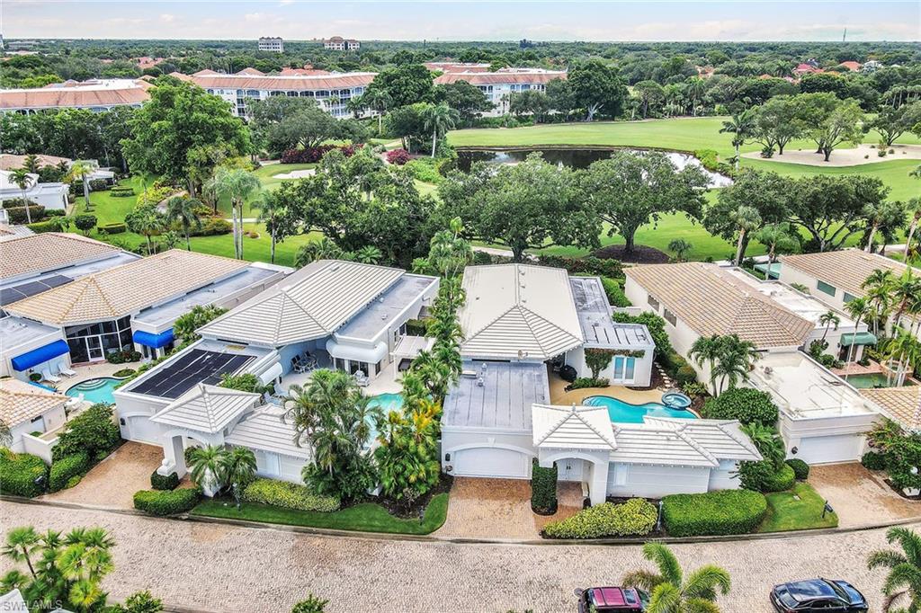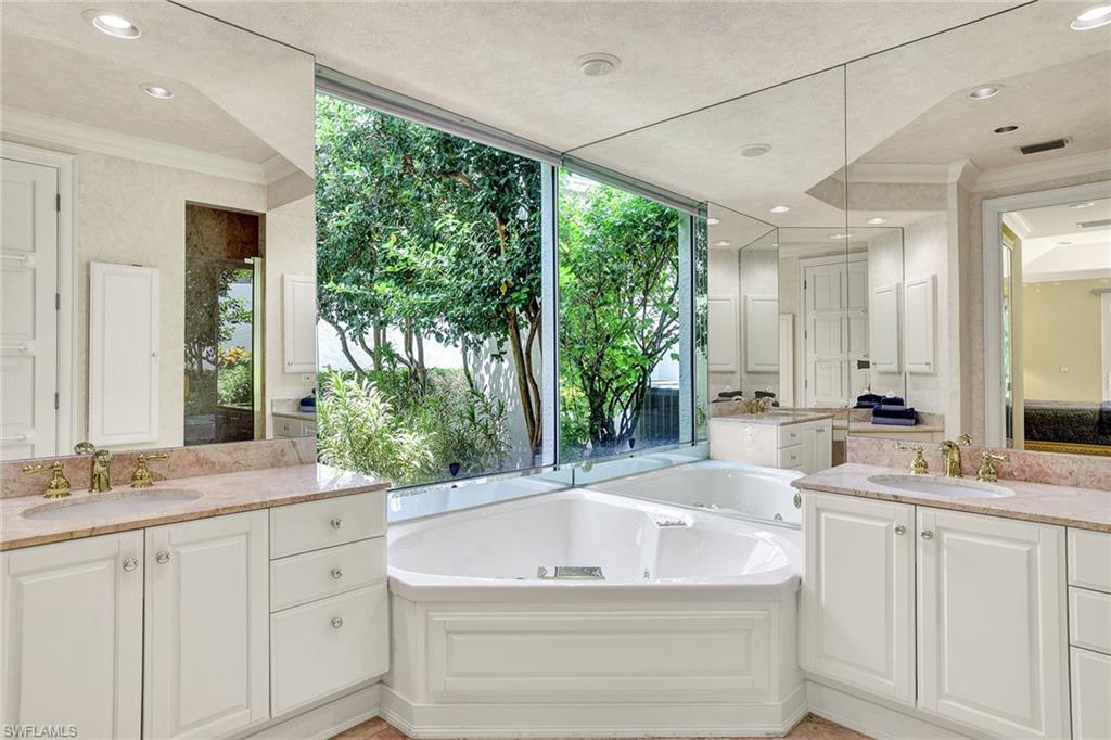 Arguably the finest view in all of Grand Bay. This home is large. There are only a few homes with a two-room cabana in Grand Bay, and this lovely home is one of them. Enter the home through the expanded courtyard and into the spacious living room with soaring ceilings. Enjoy dining while looking out at the beautiful Pelican Bay golf course. A wide-open patio off the dining/living area allows one to enjoy sunsets and watch the golfers through the beautiful private vegetation. Two bedrooms are off the living area. There is a third bedroom off the family room with its private bath. The kitchen is conveniently between the dining room and the breakfast room/family room area. The cabana off the courtyard area gives your guests complete privacy. This property is for the buyer who wants to renovate from top to bottom and make it their own. You will be pleasantly surprised when you visit this courtyard home. It shows light and airy with a south-facing lot and lots of windows.
