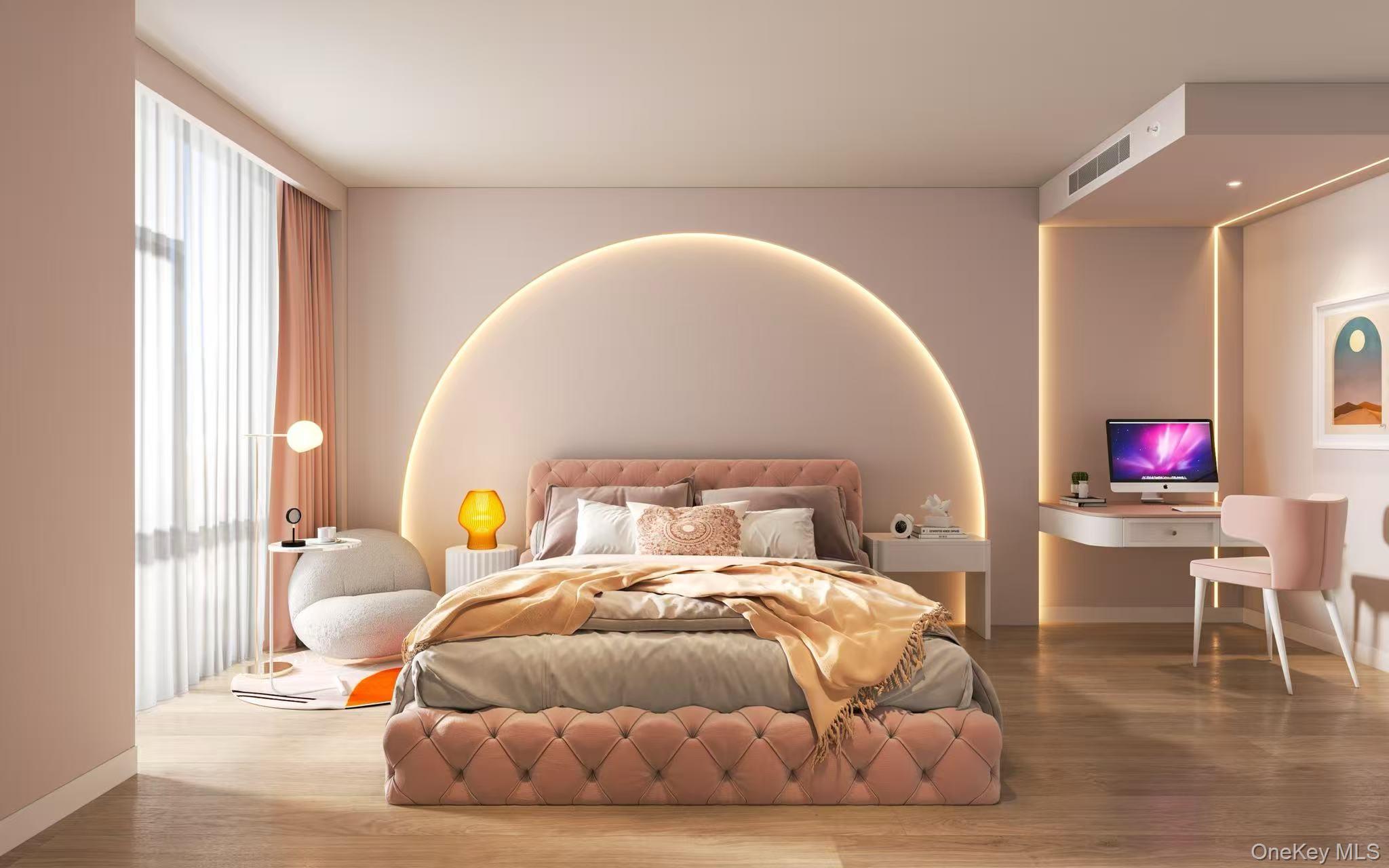 Unit 9K at The Farrington is a meticulously designed 2-bedroom, 2-bathroom residence, offering 863 square feet of interior space and 90 square feet of private outdoor living. This home exemplifies modern luxury, seamlessly blending comfort, style, and functionality. The open-concept living and dining area serves as the heart of the home, featuring floor-to-ceiling windows that bathe the space in natural light while providing access to a spacious balcony, perfect for relaxation or entertaining. The modern kitchen is designed for culinary excellence, featuring premium Italian cabinetry, Calacatta Quartz countertops, and high-end Bosch appliances. The primary suite is a luxurious escape, boasting a spacious walk-in closet and a beautifully appointed ensuite bathroom with Calacatta matte porcelain tiles, custom walnut wood veneer vanities, and radiant heated floors, creating a spa-like ambiance. The second bedroom, featuring a generous closet, is perfect for guests or a home office setup. Residents of The Farrington enjoys an exclusive selection of amenities, including: indoor swimming pool, fitness center, rooftop terrace with BBQ area, creation room, bike storage room, parking spaces, lobby concierge service, resident lounge, professional conference room, and grand banquet halls. Strategically located in the heart of Flushing, Queens, The Farrington offers unparalleled convenience, with easy access to the 7 Train, major highways, and free shuttle bus to LaGuardia Airport. Surrounded by vibrant shopping centers, renowned dining destinations, and cultural landmarks. Welcome to The Farrington, where residence seamlessly blends urban energy with luxury living.