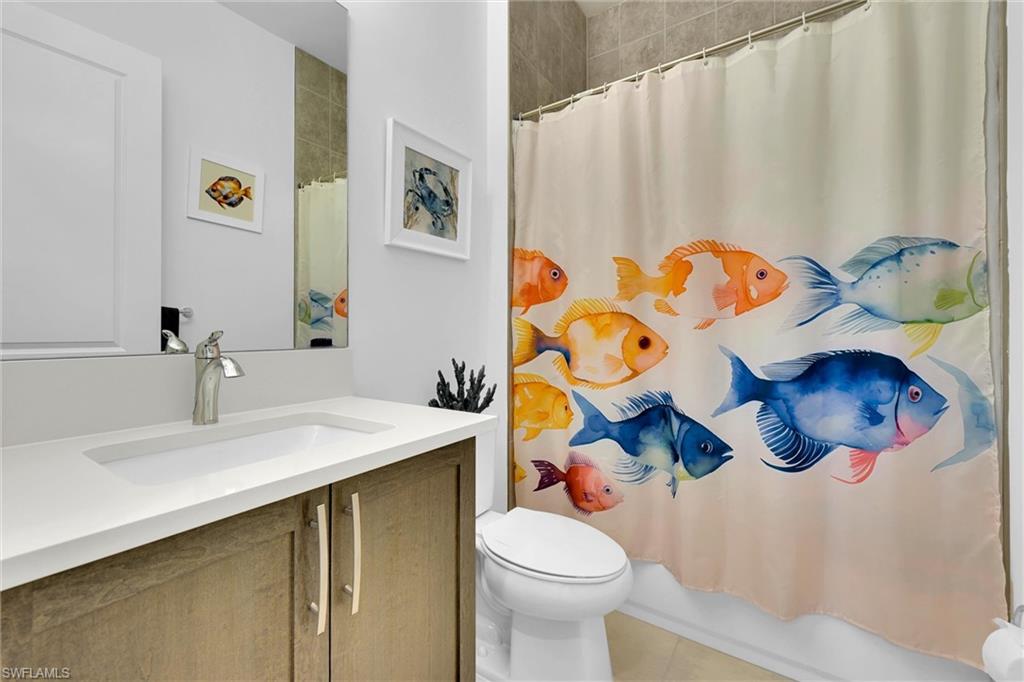 Welcome to your beautiful home in paradise which is situated on a premium lot with breathtaking lake views and daily sunsets. Open concept layout with 13 ft foyer ceiling and 10 ft throughout. RiverCreek is a new gated community with NATURAL gas located in the heart of Estero. Home boasts numerous upgrades including premium lighting and electrical package, shower in lieu of tub in guest bath. Beautiful kitchen with quartz countertop and extended backsplash, white kitchen cabinets with chimney hood, under cabinet lighting and SS appliances. Crown molding, chair rail and freshly painted. Principle retreat with his and her walk in closet and large bath with frameless shower enclosure, dual sinks and oversized mirrors. Hurricane impact windows and doors, Enjoy the magnificent 12, 000 sqft clubhouse with resort style pool, indoor sports complex, state of the art fitness center, exercise studio, event room, catering kitchen and fire pit and don’t forget the daily fun at the playground and splash park. Convenient access to RSW airport, Coconut Point Mall, Miromar Outlets, Gulf Coast Town Center, FGCU, Hertz arena and beautiful beaches.