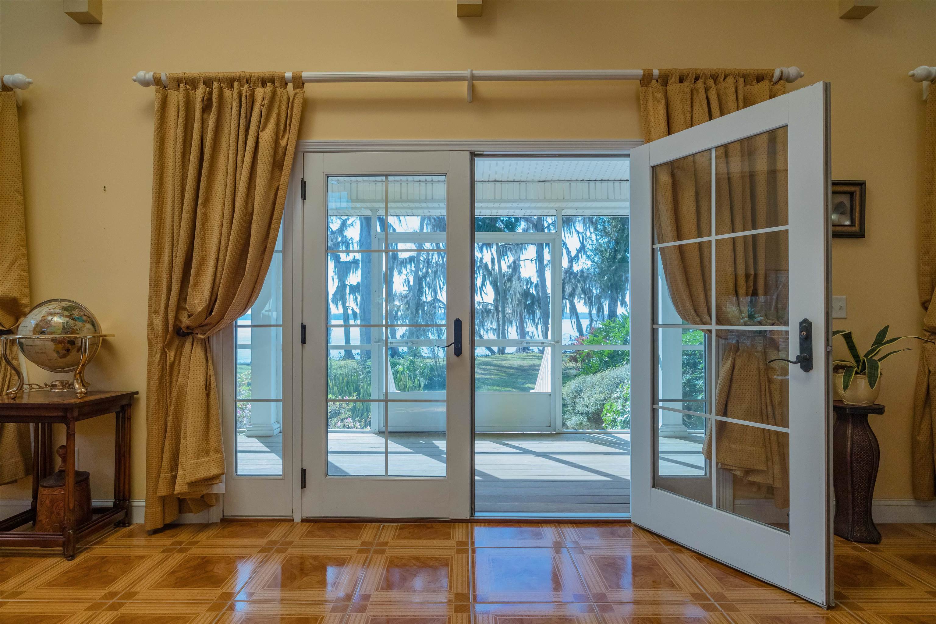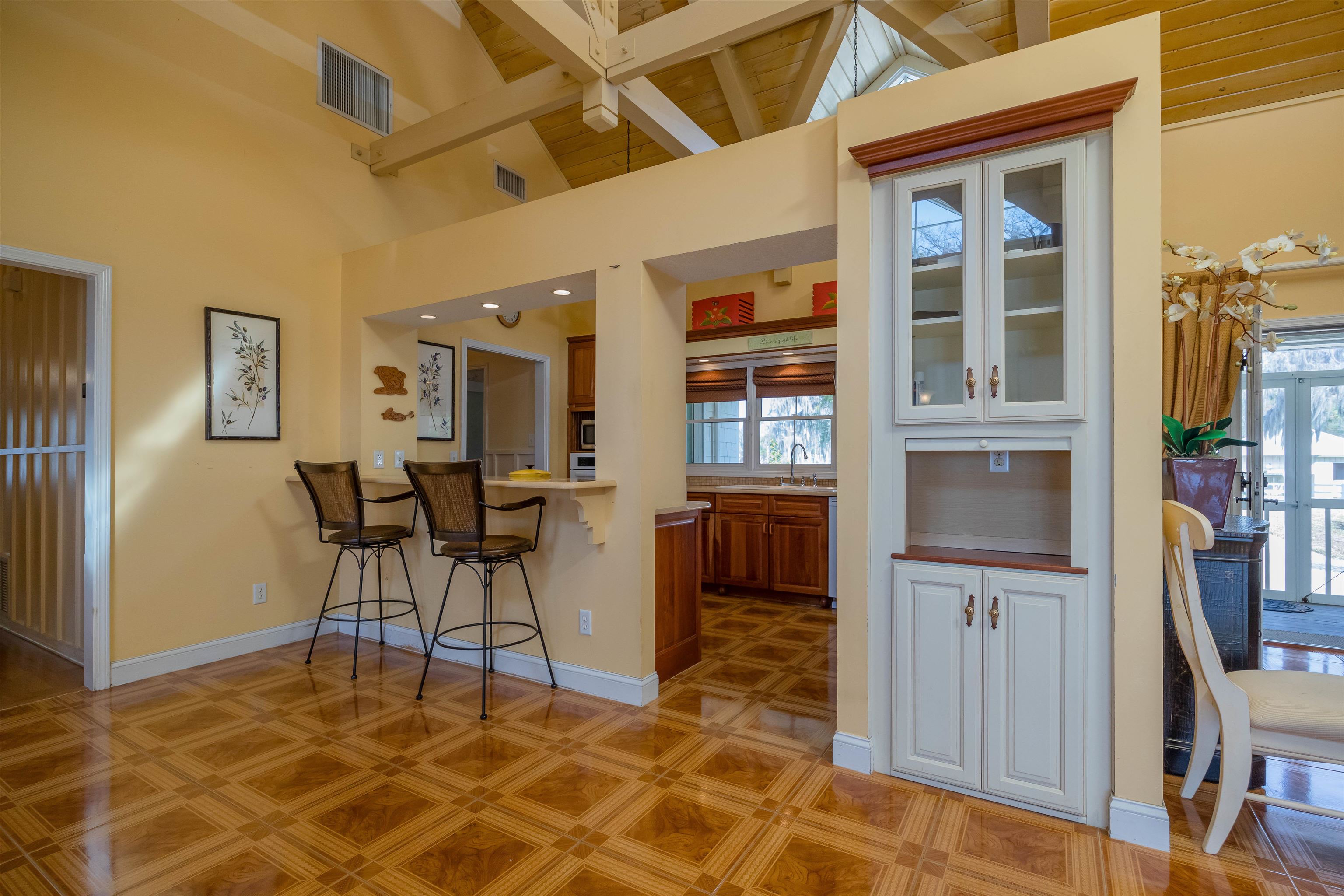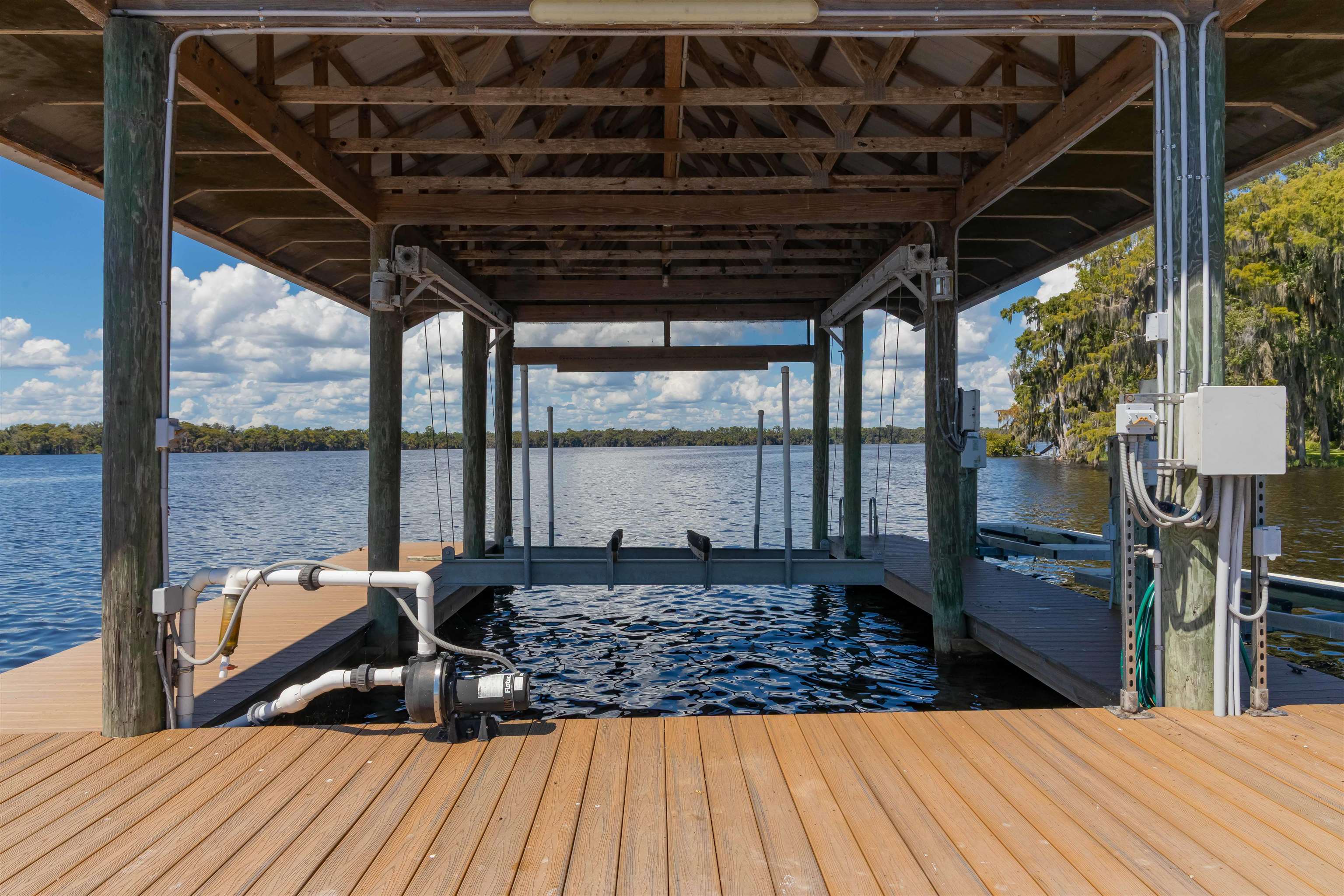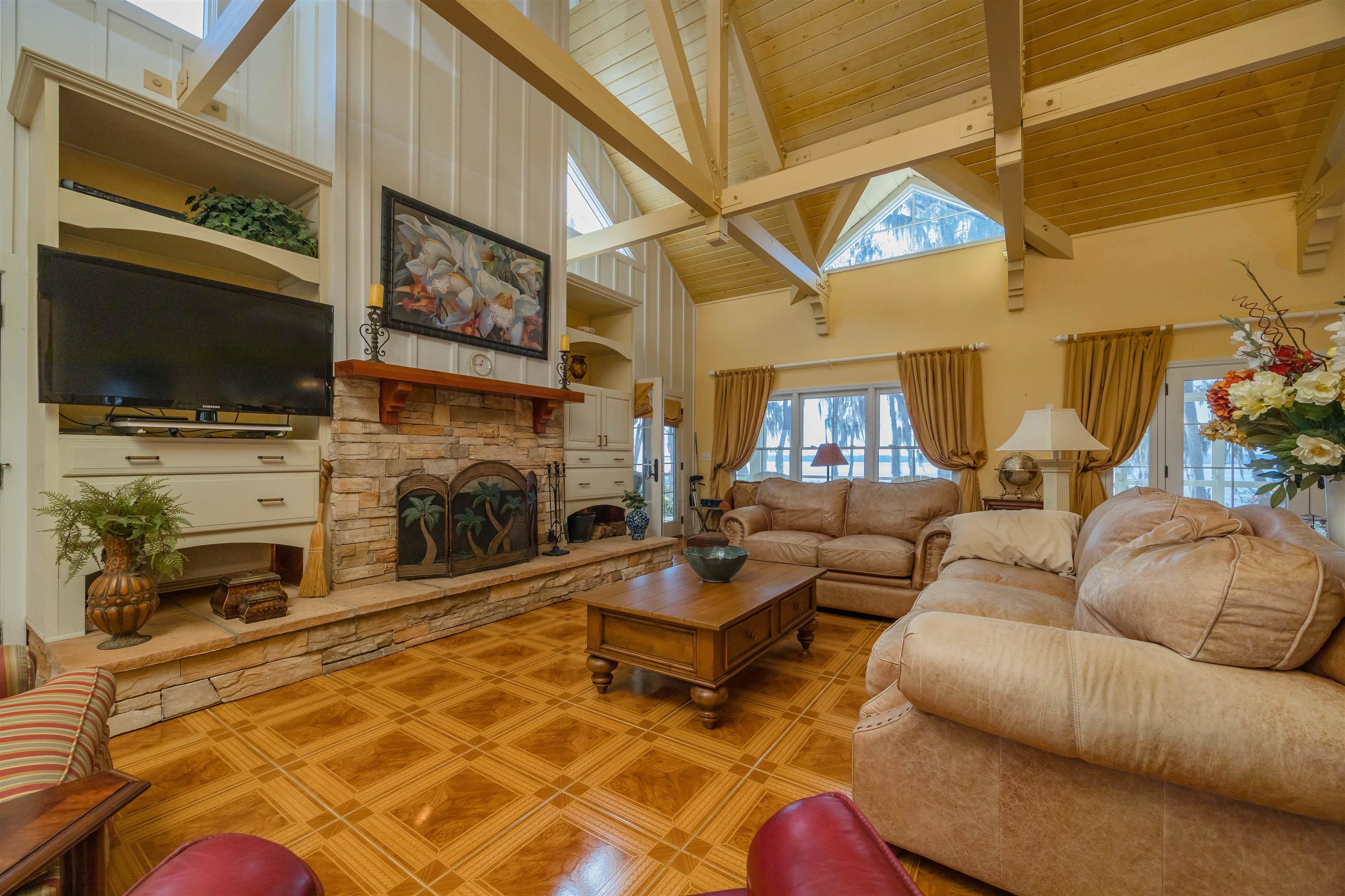 GORGEOUS RIVERFRONT CUSTOM HOME ON 22 ACRES WITH 1, 729 FEET ON THE ST JOHNS RIVER LESS THAN 2 MILES TO WORLD CLASS BASS FISHING AT BASS PRO'S FLORIDIAN SPORTS CLUB. Gated entry with long winding driveway where you will pass 2 barns (a 2 stall & a 3 stall), 3 gated fully fenced pastures leading to a spectacular 2BR/2BA with den, 2402 SF home on the river with a boat dock that includes a boat lift & 2 jet ski lifts to store your Hurricane boat & your 2 Honda jet skis that come with the home! This home is being offered fully furnished & includes all furnishings. Not only do you get a boat & 2 jet skis, you'll also get an electric golf cart, Kubota Tractor riding mower, shed full of tools, a chicken coop & much more. Circular driveway leads to wrap around porch with teak wood deck & a summer kitchen. Enter into the Great Room to beautiful high wood ceilings with wood beams, clerestory windows, magnificent stone fireplace & 4 sets of French Doors leading to the wraparound porches. Owners wanted a "glorified cabin" with views from every room. Rich wood parquet flooring throughout. Spacious kitchen with lots of cabinets & counters, breakfast bar, gas stove & views of the river. 2 hallways with wood molding. 1 hallway leads to pantry & huge 12x12 laundry rm with lots of cabinets & counters, large sink & door to the front wraparound porch. Other hallway leads to double French doors to owner suite with many windows for tranquil river views, huge bathroom with river view & walk in closet with 2 gun safes, plus a private sun porch filled with more tranquil river views. The 2 stall horsebarn is in a gated fenced pasture with a pond & a chicken coop. The 3 stall horsebarn also has a carport for your own Hurricane boat. Views are breathtaking!! Across the river you will see Ocala National Forest, Hog Island and Drayton Island. This is truly PARADISE!