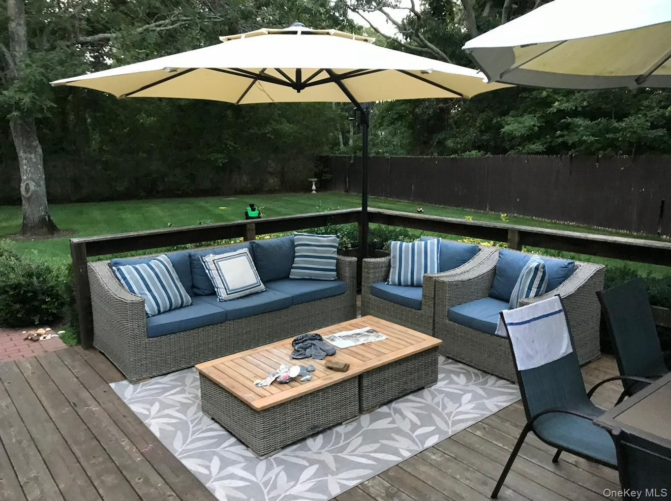 Tucked away on a private flag lot moments from the ocean beach, this five-bedroom, three-bath residence offers a relaxed take on Hamptons summer living. The main level unfolds with a vast, airy living room that opens seamlessly to the rear deck and brick patio- blurring the line between indoor comfort and outdoor entertaining. The galley kitchen, finished with stainless steel appliances, connects effortlessly to the dining area, creating an easy, functional flow for everyday living. The generously sized primary en-suite features a walk-in closet and private bath, while an additional spacious bedroom and full hall bath complete the first floor. Upstairs, an open lounge anchors three additional bedrooms and a full bath- well-suited for guests, extended stays, or a lively summer household. Outdoors, mature landscaping frames a sun-soaked deck and patio designed for al fresco dining and long, unhurried afternoons. The 18x36 heated pool serves as the focal point of the backyard - an inviting place to swim, unwind, or simply settle into the rhythm of the season. Ideally located just minutes from Ponquogue Beach, Shinnecock Bay, and Meschutt Beach, with convenient access to waterfront dining and local favorites, this home balances privacy, proximity, and ease, ready to be enjoyed. June $15k, July $25k, Aug-LD $30k.