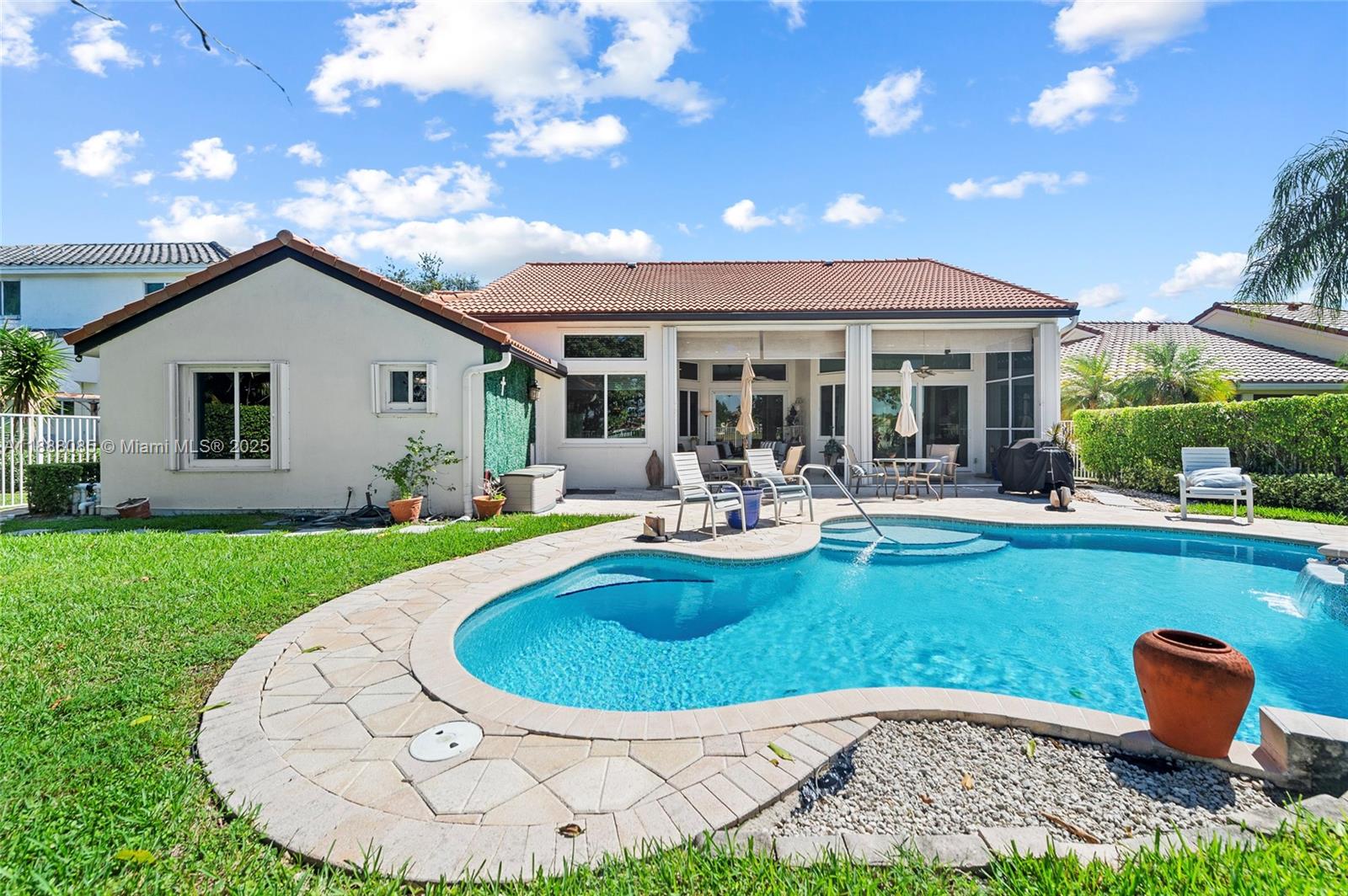 Set on one of Weston’s largest lakes at The Lakes. Standout home perfect for a large family and effortless indoor-outdoor entertaining. 4BR, 3. 5BA with a 2008 barrel-tile roof, impact windows and garage door, and accordion shutters. Bright, open interiors with plenty of natural light. All-porcelain flooring and LED lighting. Kitchen remodeled (2018) with granite, LG refrigerator, Samsung range (2018), and GE Profile microwave (2019). Primary suite with two walk-in closets and a 2018 spa bath with marble floors, large shower, and separate soaking tub. Resurfaced pool & spa (2024) with new lighting/handrails and a new heater (2024), plus fenced yard. Tankless water heater (2023). Guard-gated, with pool, playground, and fields. Prime Weston location near A-rated schools, parks, and shopping.