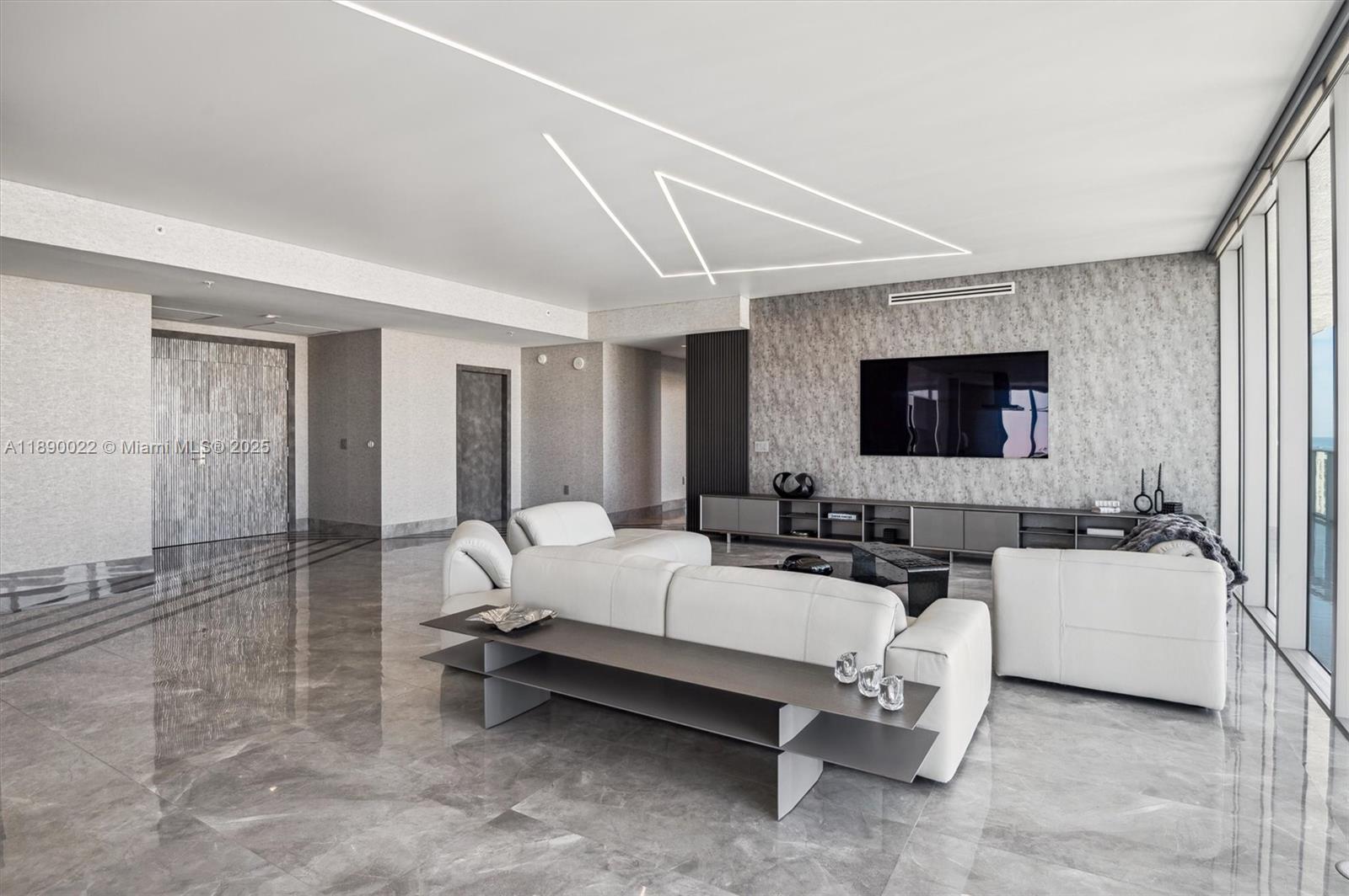 This stunning, state of the art Upper Penthouse is the epitome of turnkey luxury, w/4BR+Den & 5BA, spanning nearly 5, 000sf of living space (3, 877sf interior+1, 011sf wrap around balcony) just steps from the beach. Professionally designed by Intero Futuro and fully furnished to provide an unparalleled living experience. Open layout with stretch ceilings and ultra-modern, linear LED lighting. Floor to ceiling windows with breathtaking views of the ocean, intracoastal and city skyline. Customized closets and a curated collection of luxury Italian furniture. Top-tier chef’s kitchen, Wolf/Sub-Zero/Bosch appliances with marble+adamantium quartzite countertops. Spacious primary suite with stunning ocean views, designer walk-in closet and a spa-like bathroom that creates a serene and lavish escape.