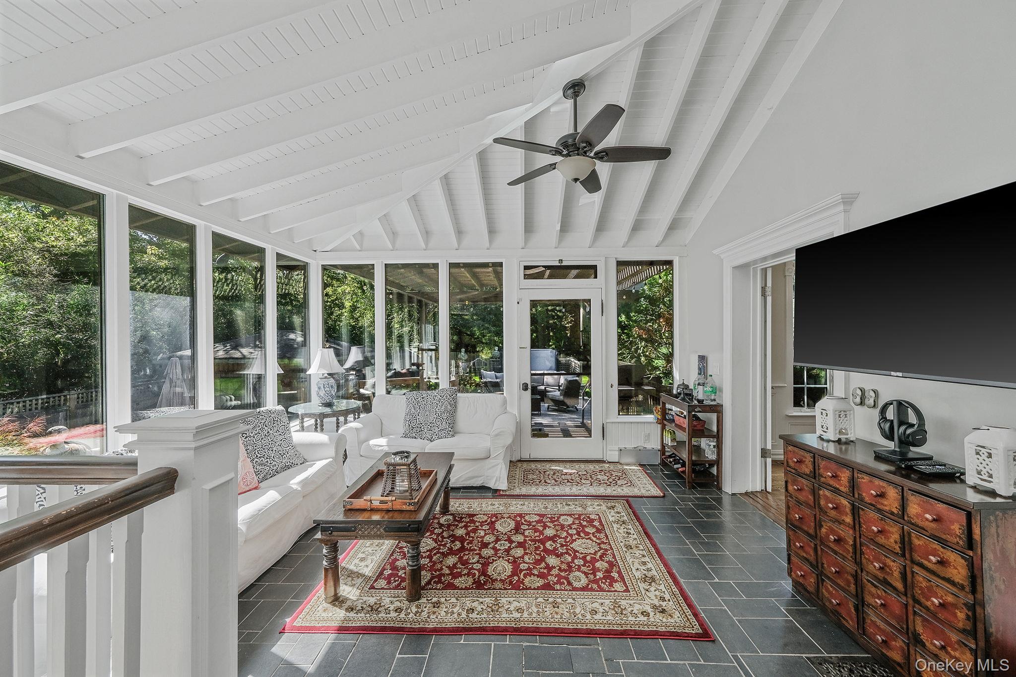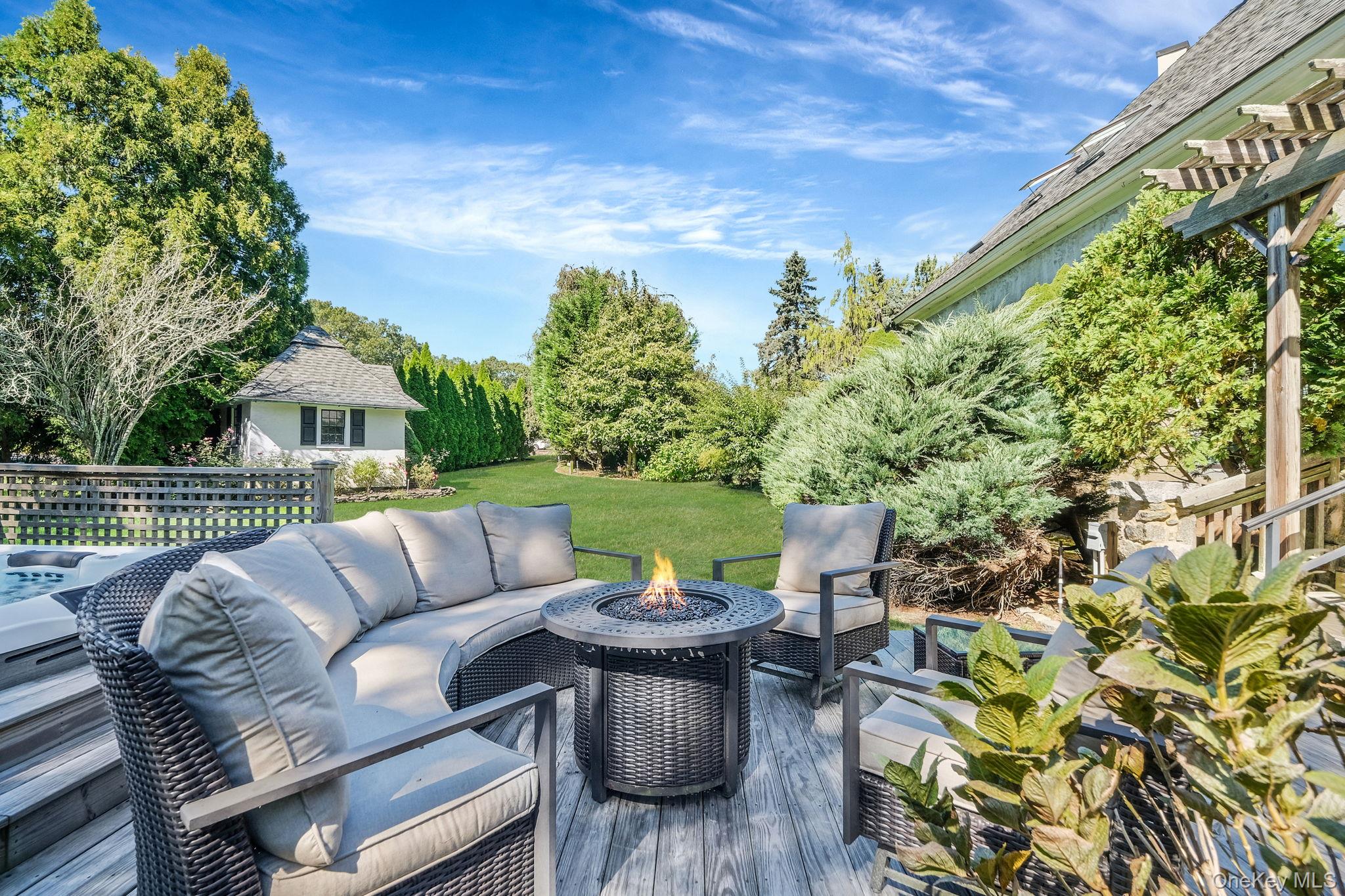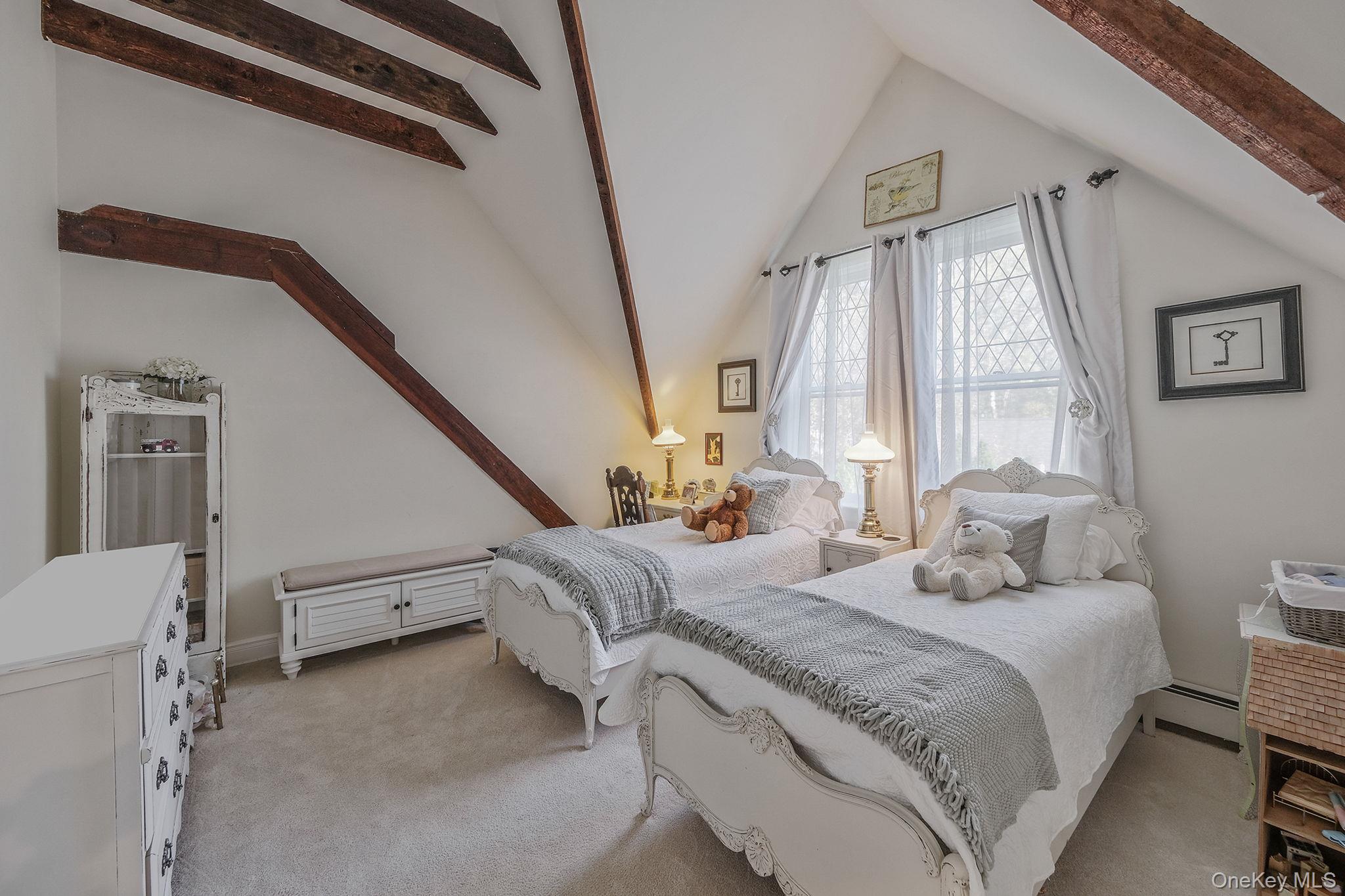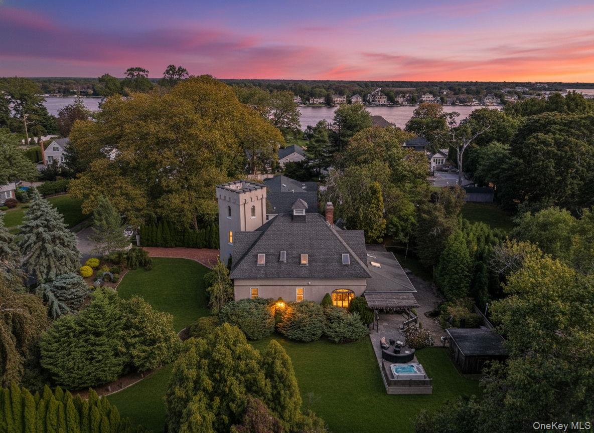 This extraordinary home offers the perfect balance of timeless elegance and modern comfort. A dramatic tower, Juliet balcony, and vaulted ceilings set the stage for architectural distinction, while a soaring foyer leads to the grand living and dining hall with gas fireplace, flanked by beautiful stained glass panels. Renovated in 2016, this 3000sqft+ home features high-end millwork, a stunning and spacious gourmet eat-in kitchen, powder room, delightful sunroom with stairs to the basement and geothermal heating & A/C. Upstairs you'll discover an exquisite primary suite with walk-in closet and spa-like bathroom with laundry, 2 additional bedrooms, a Tower Room, luxurious shared bath and a beamed-ceiling den. Outdoors, enjoy a peaceful stone patio with koi pond, outdoor entrance to basement with full bath, laundry and storage, entertainer’s deck with gas hook-up, pergola seating area and hot tub, crowned by a charming artist’s cottage—all surrounded by lush, professionally landscaped grounds with 12 zones of sprinklers. Nestled on a Cul-du-sac, this home offers beauty, privacy, and tranquility. This is your rare opportunity to own a true architectural gem in picturesque Great River.
