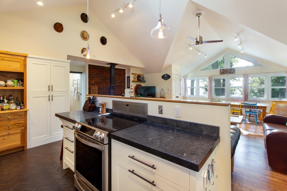 Discover the perfect Lake Champlain retreat in the quaint town of Isle La Motte. Set on 1. 08 private acres with 100 feet of west-facing lake frontage, this year-round 3-bedroom home was fully renovated by Sweeney Design Build starting in 2014, blending modern comforts with timeless style. Inside, the open-concept living space showcases vaulted ceilings, a wood stove, a skylight, and lake views. The kitchen is a showpiece with herringbone teak floors, elegant white cabinetry with an integrated fridge, solid black marble countertops sourced locally from Isle La Motte, and a built-in rustic bar. A pass-through window connects the kitchen to the screened porch with ceiling heaters, seamlessly blending indoor and outdoor living. From there, step onto the stone patio with a custom pizza oven, the perfect place for lakeside entertaining. The home offers flexible bedroom options, including a main-level suite and a luxurious second-floor suite with a propane fireplace, soaking tub, and walk-in closet. A secret wine room provides a unique space to showcase your collection. The heated barn, also built by SDB, offers additional living space with a +1, 000 sqft second floor and first-floor bathroom, ideal for guests, hobbies, or storage. Enjoy spectacular sunsets from the lakeside deck with stairs to the water. The gradual shale beach is perfect for a dock, swimming, and boating, and includes a mooring. Schedule your showing today and experience lakefront living at its finest.