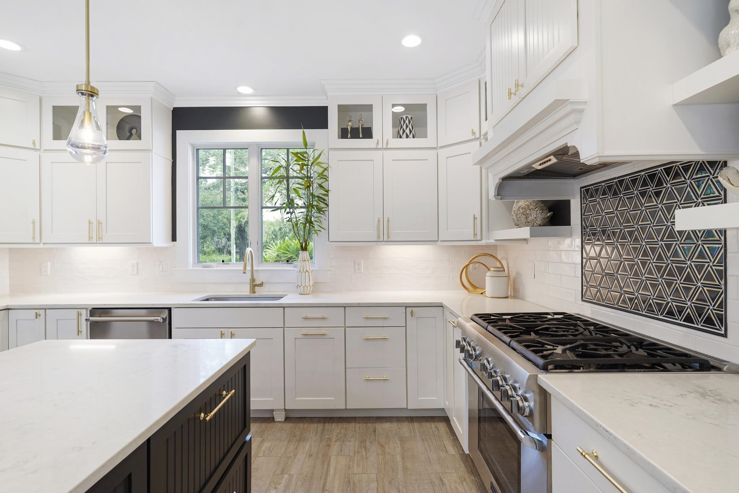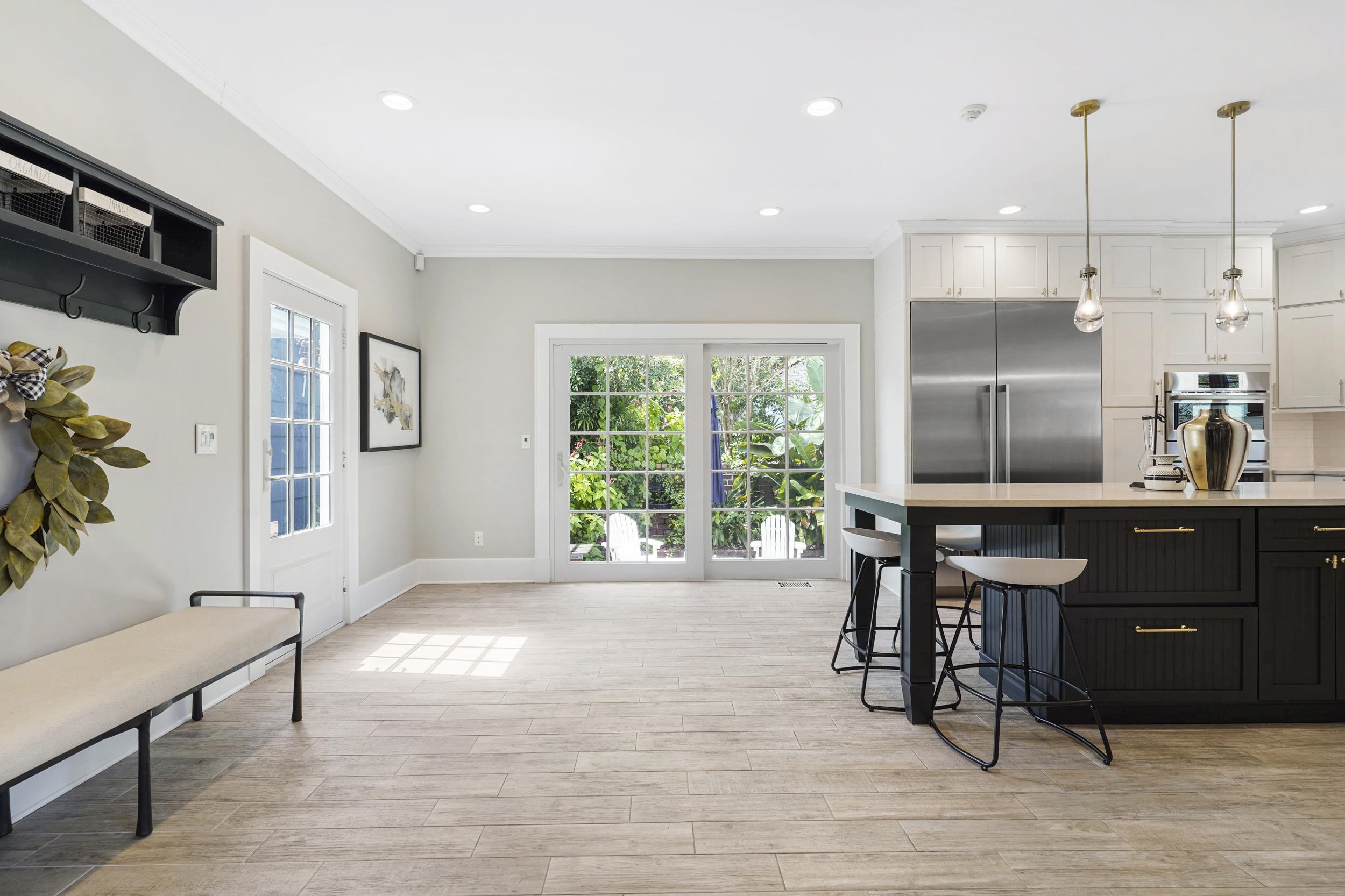 This 1920's gem exudes the charm and character of yesteryear, with original doors, hardware, elegant fireplace and hardwood pine floors. Entertain friends and family in the grand gourmet kitchen featuring additional dining area and a modern coffee and wine bar, leading out to the courtyard garden, with an ambience reminiscent of Old Florida. Updates include Thermador and Bosch appliances, a 54" refrigerator and freezer, six-burner professional range, quartz countertops, stacked cabinetry, custom tile, and a nine-foot island. A custom-designed coffee and wine bar with sink, wine cooler, and professional Rancilio espresso machine completes the space.