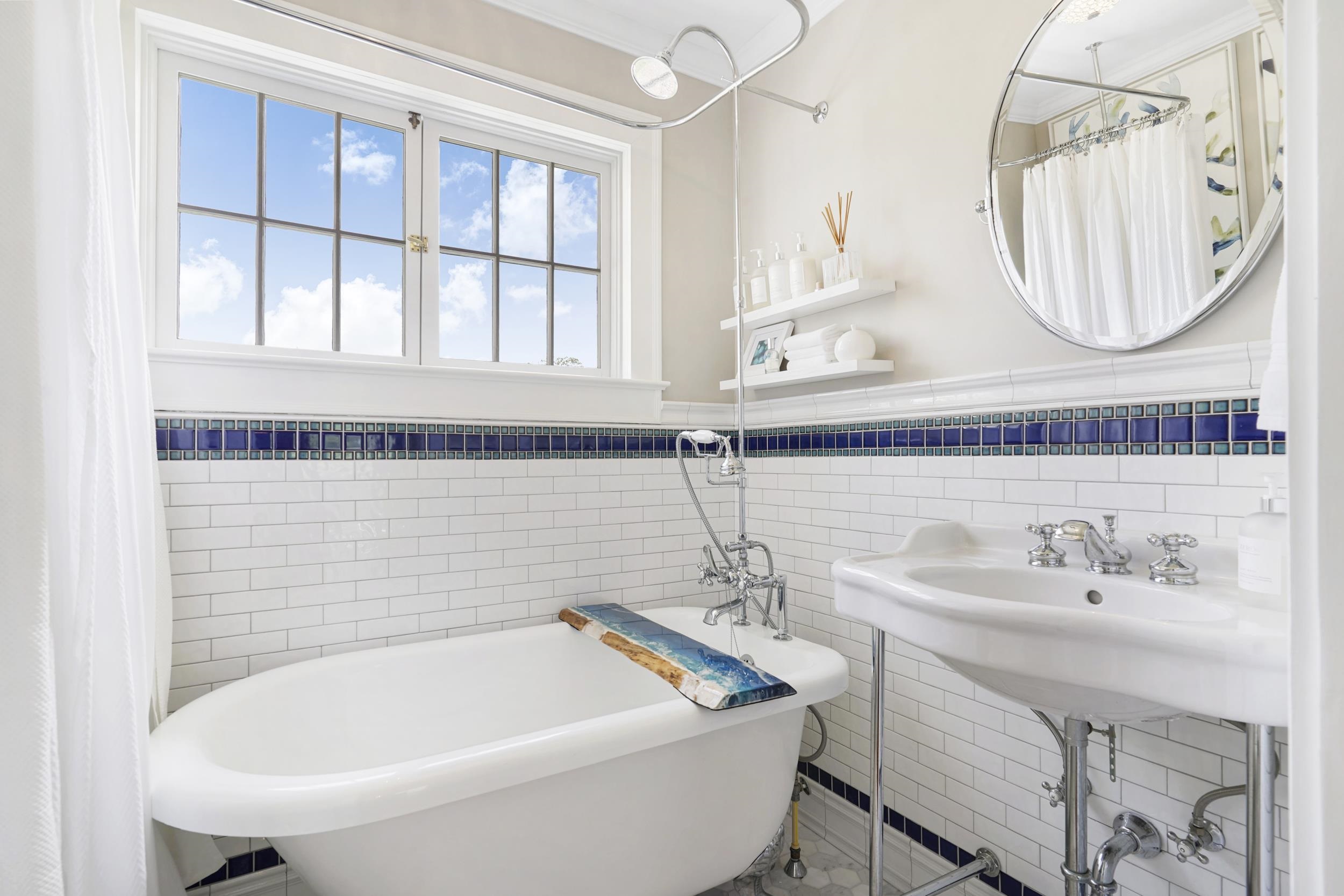 The home also features a dedicated office or sunroom, colorful custom stained-glass windows, updated bathrooms with designer fixtures, a luxurious primary bath with heated Toto bidet toilet and a custom California Closet, plus a guest bath with antique clawfoot tub.
